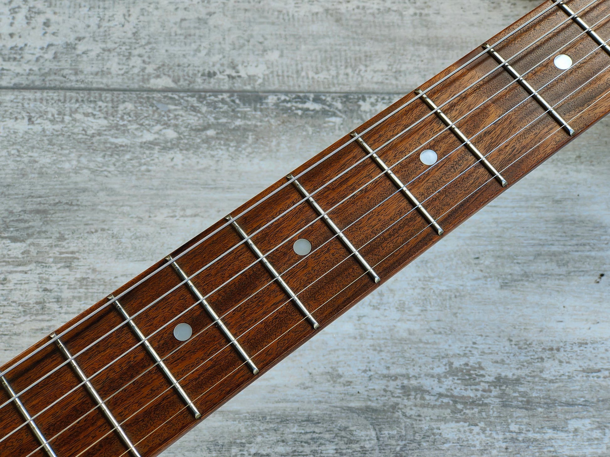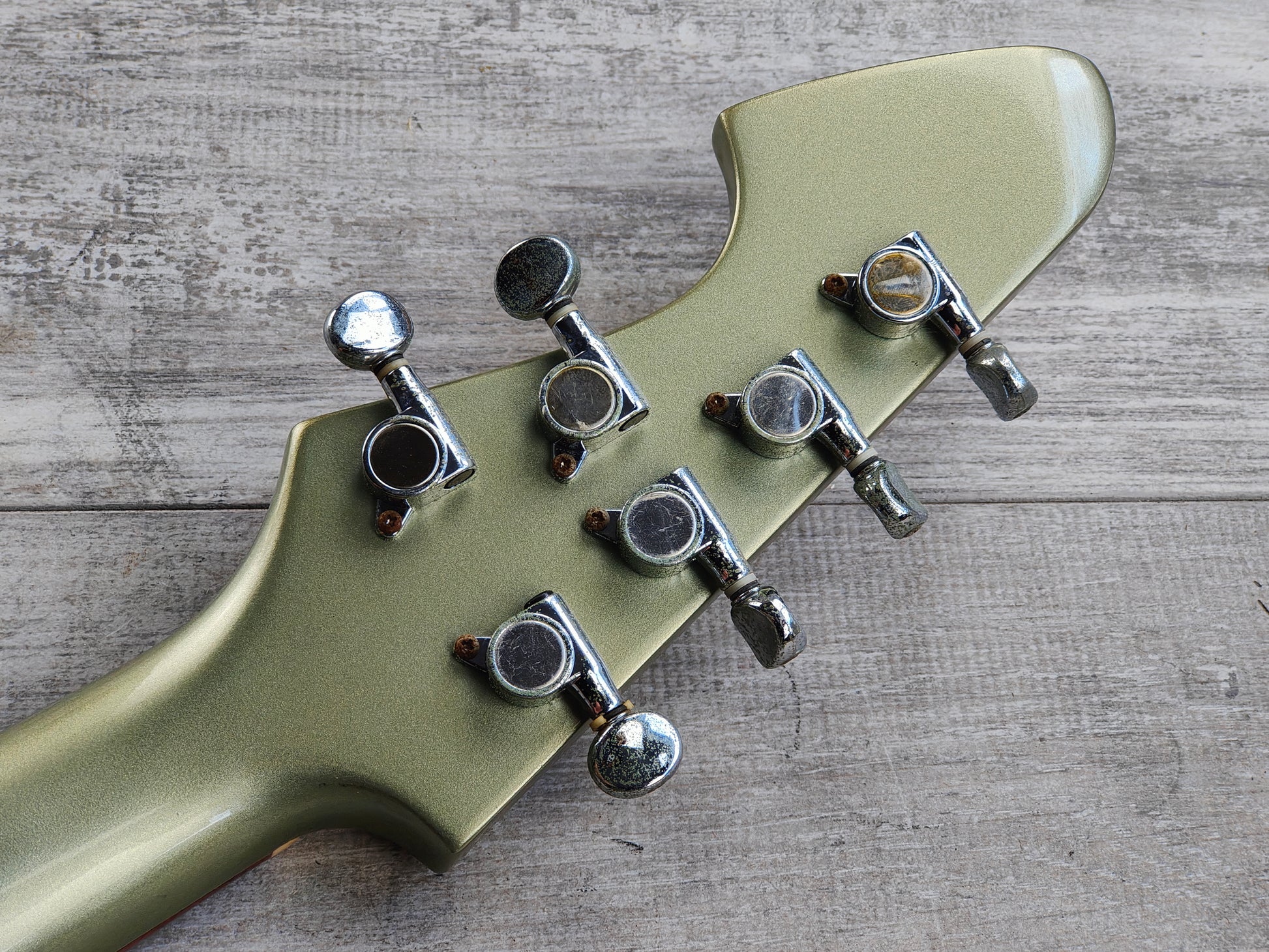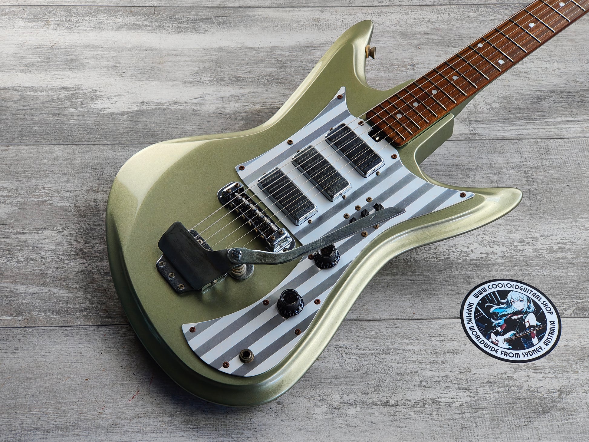 One of the 1990's reissue models of the famous Teisco Sharkfin from the 1960's. Slim solid body with a German carve on the top bolted to a slim C maple neck with a 22 fret rosewood fingerboard (628mm scale length, 44mm nut width at the Zero fret), it weighs 3.1kg's. Loaded with three mini-humbuckers controlled by individual on/off switches and master volume/tone controls. The original tremolo system and intoneateable roller bridge system allow for gentle wobbles without the need to constantly retune.