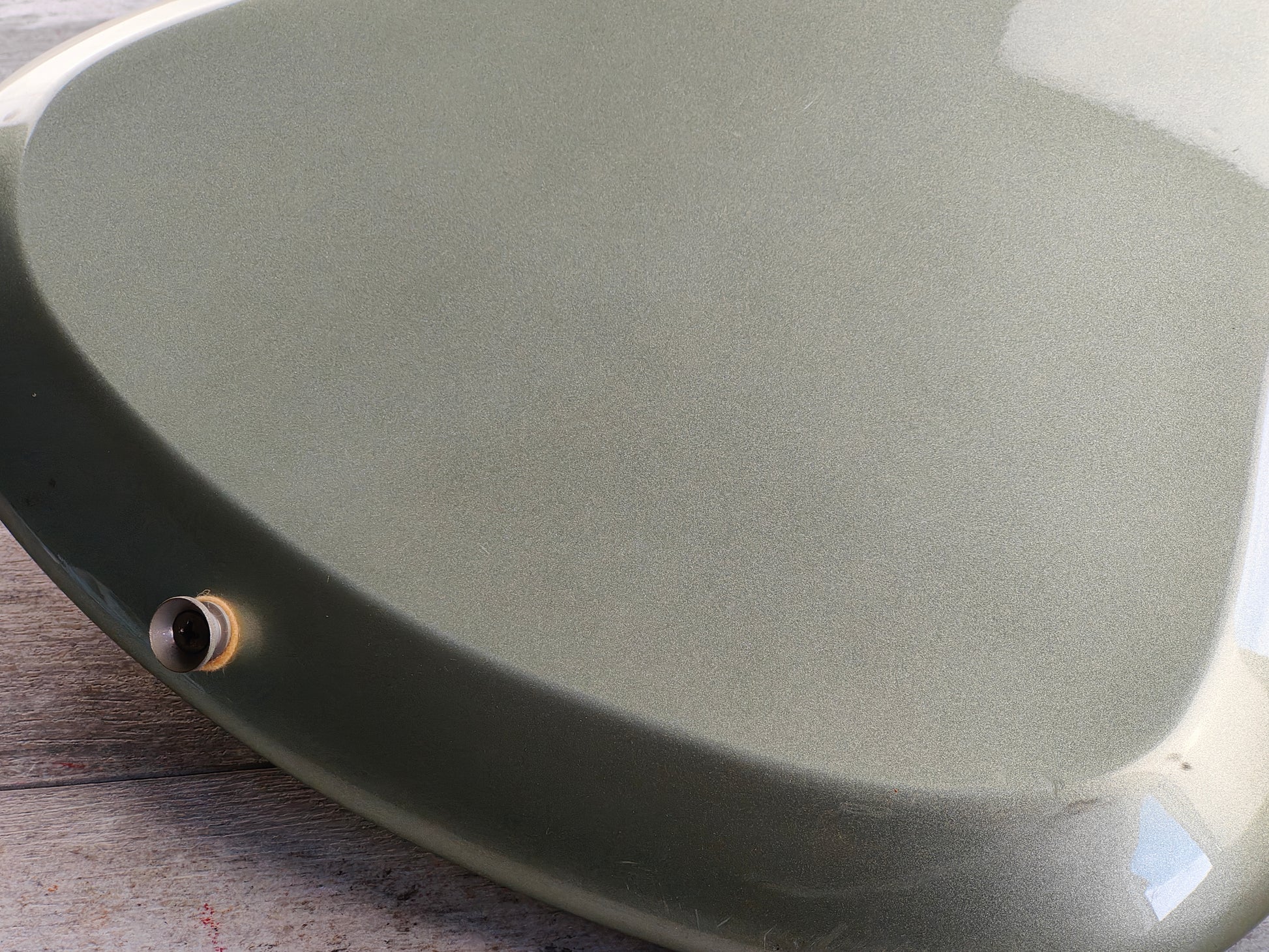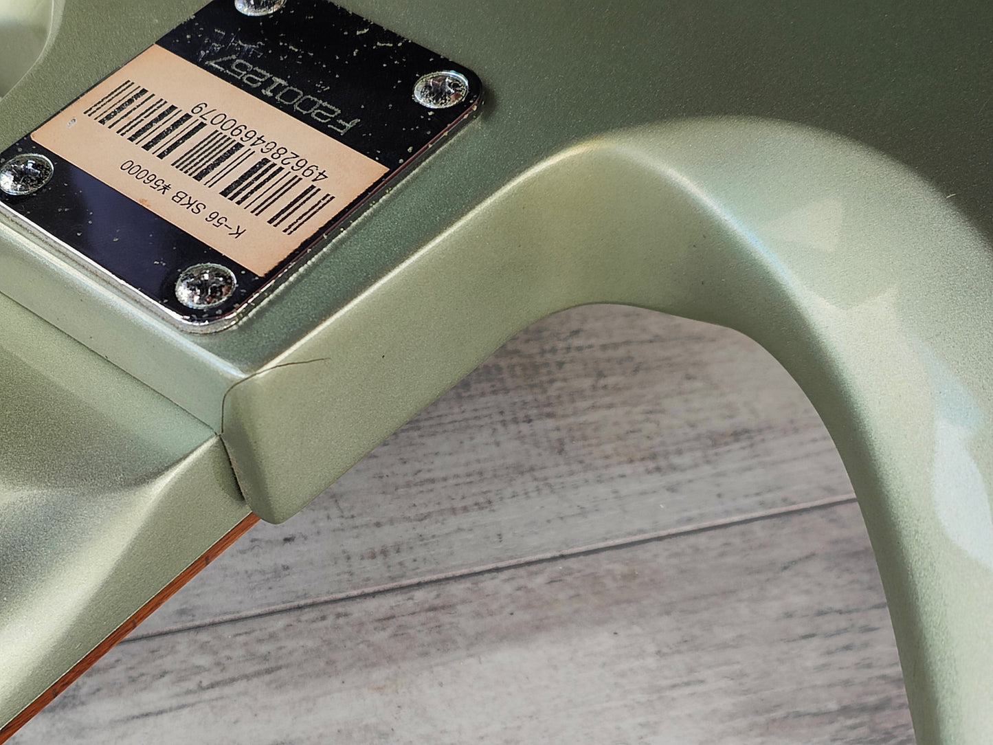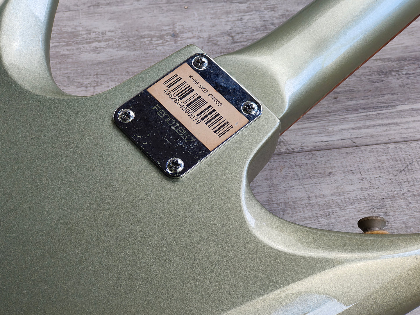 One of the 1990's reissue models of the famous Teisco Sharkfin from the 1960's. Slim solid body with a German carve on the top bolted to a slim C maple neck with a 22 fret rosewood fingerboard (628mm scale length, 44mm nut width at the Zero fret), it weighs 3.1kg's. Loaded with three mini-humbuckers controlled by individual on/off switches and master volume/tone controls. The original tremolo system and intoneateable roller bridge system allow for gentle wobbles without the need to constantly retune.
