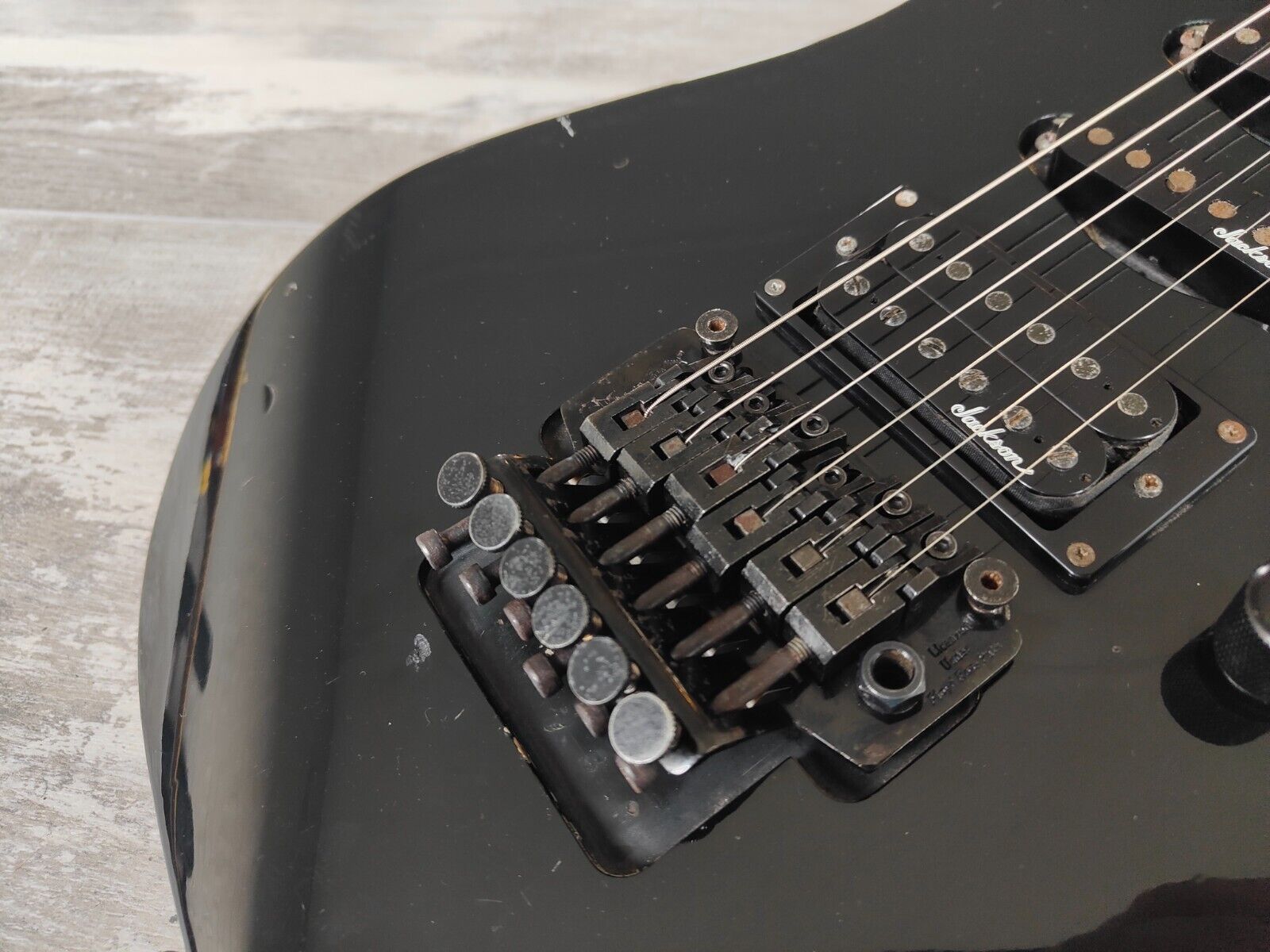 Poplar body with a slim profile rock maple neck and rosewood fingerboard, it weighs 3.3kg's and wears an aged black finish. Loaded with the Jackson HSS pickup configuration and a Charvel FLC branded licensed Floyd Rose locking tremolo system, it's got 22 frets and plays with a 648mm scale length.