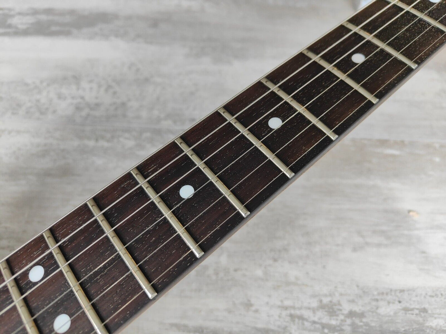 Given a basic professional setup and service prior to listing, missing the locking components from the nut and has a replacement knob otherwise it appears all original. Frets are super shiny and smooth with plenty of life left, neck is straight and truss is adjustable.