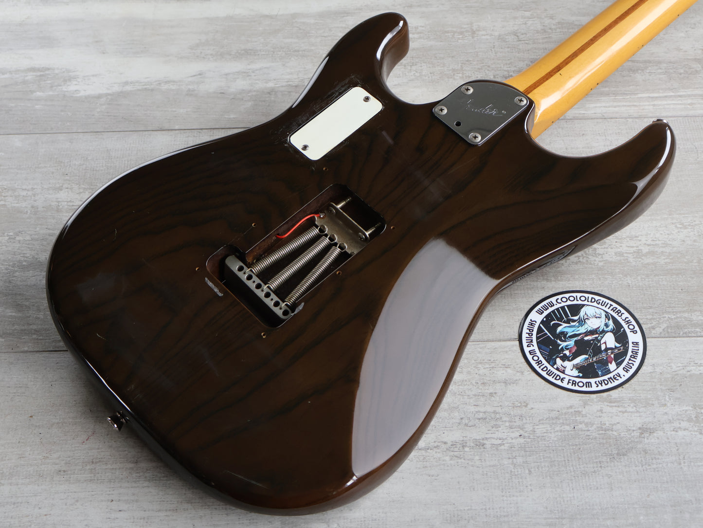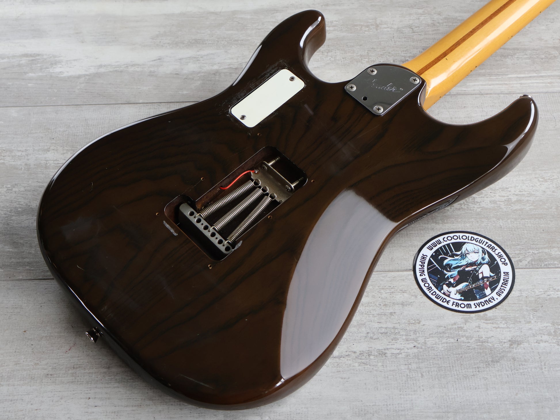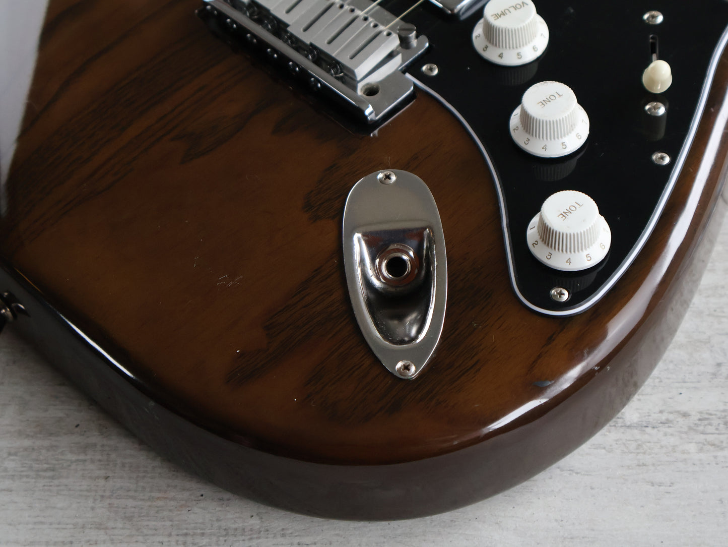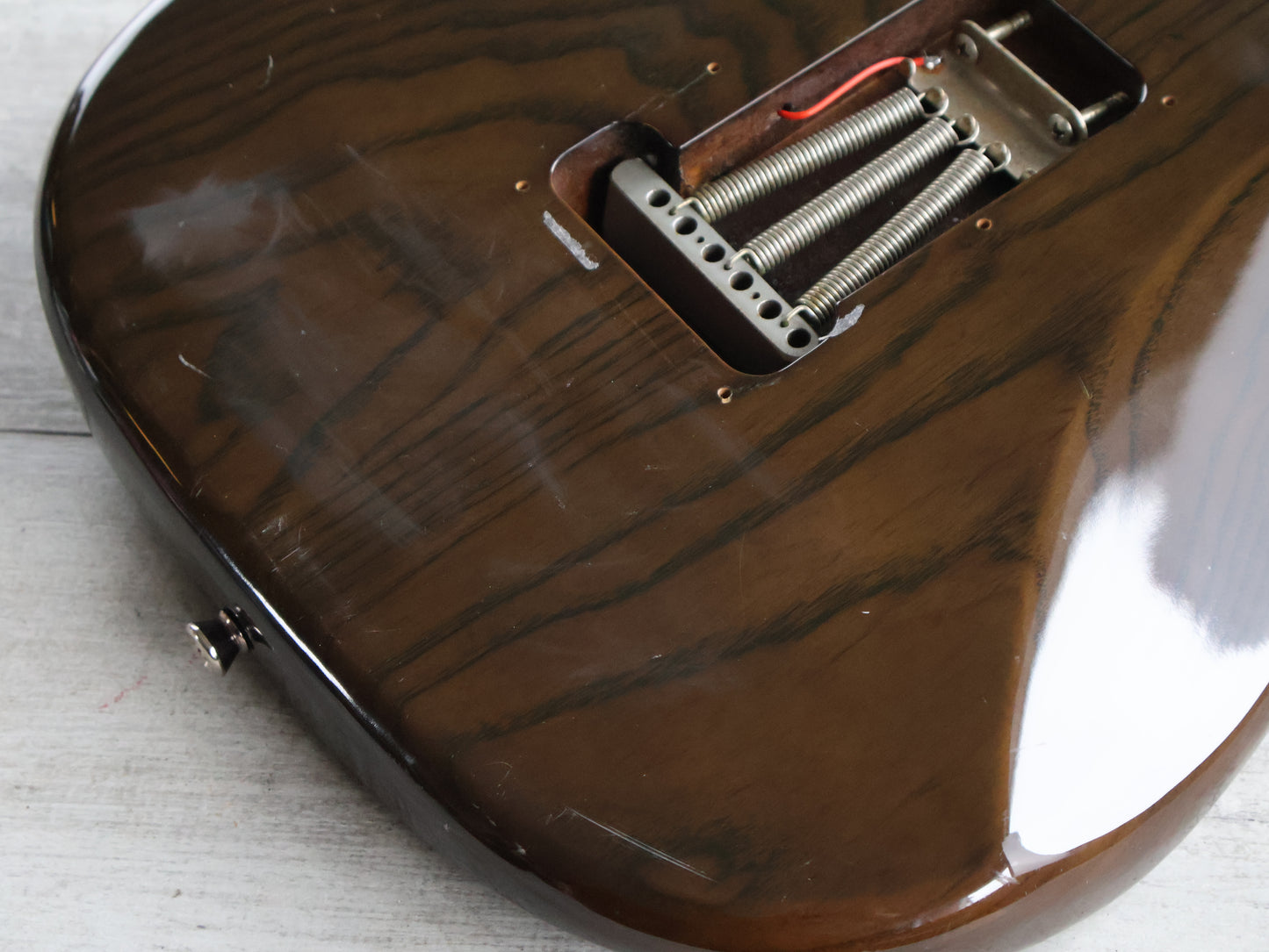 Ash body with a transparent brown finish bolted to a satin feel birds-eye maple neck (22 frets, 648mm scale length, 10" radius, 43.5mm nut width), it weighs 4.1kg's. Factory loaded with an "American Standard" bridge system and roller nut along with the original Gotoh tuners. The previous owner appears to have removed the original pickups/wiring and installed a standard unbranded HSS Stratocaster loadout.