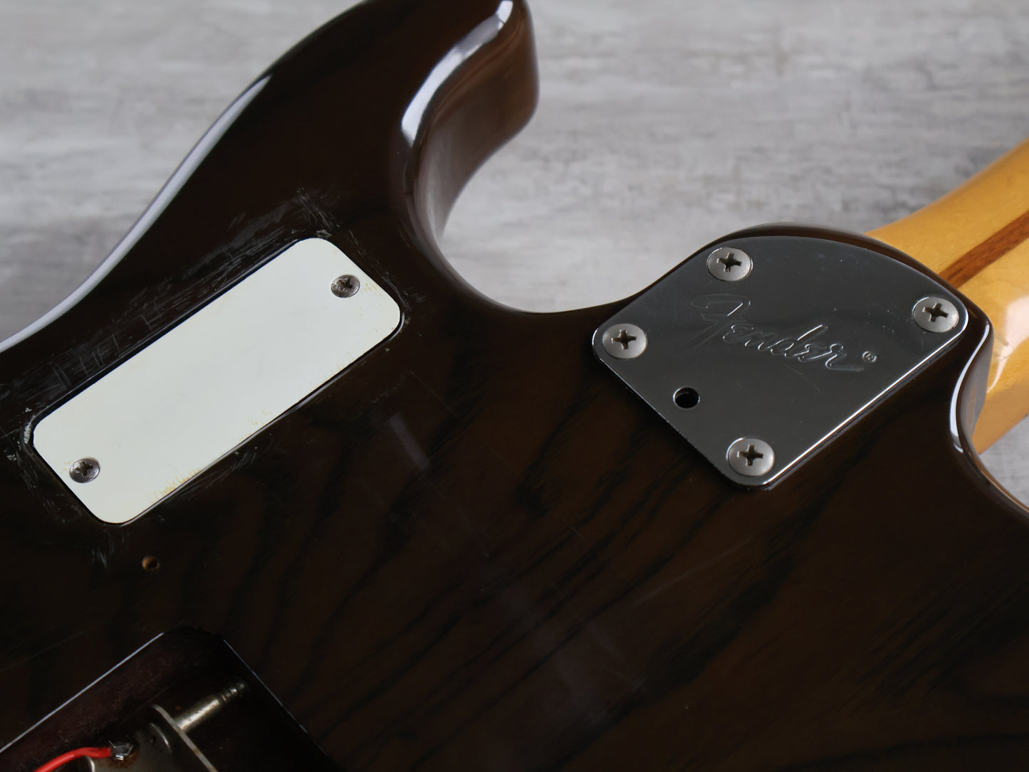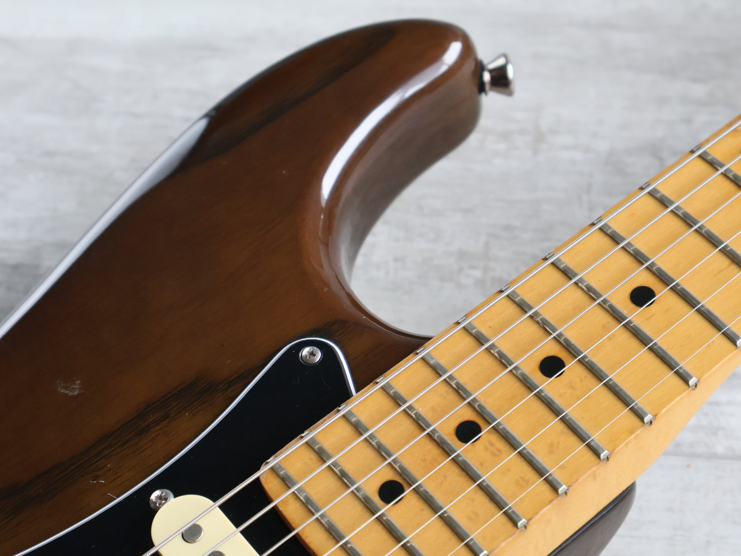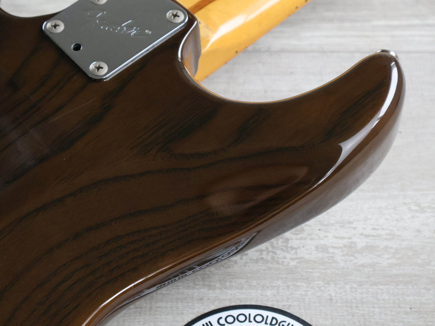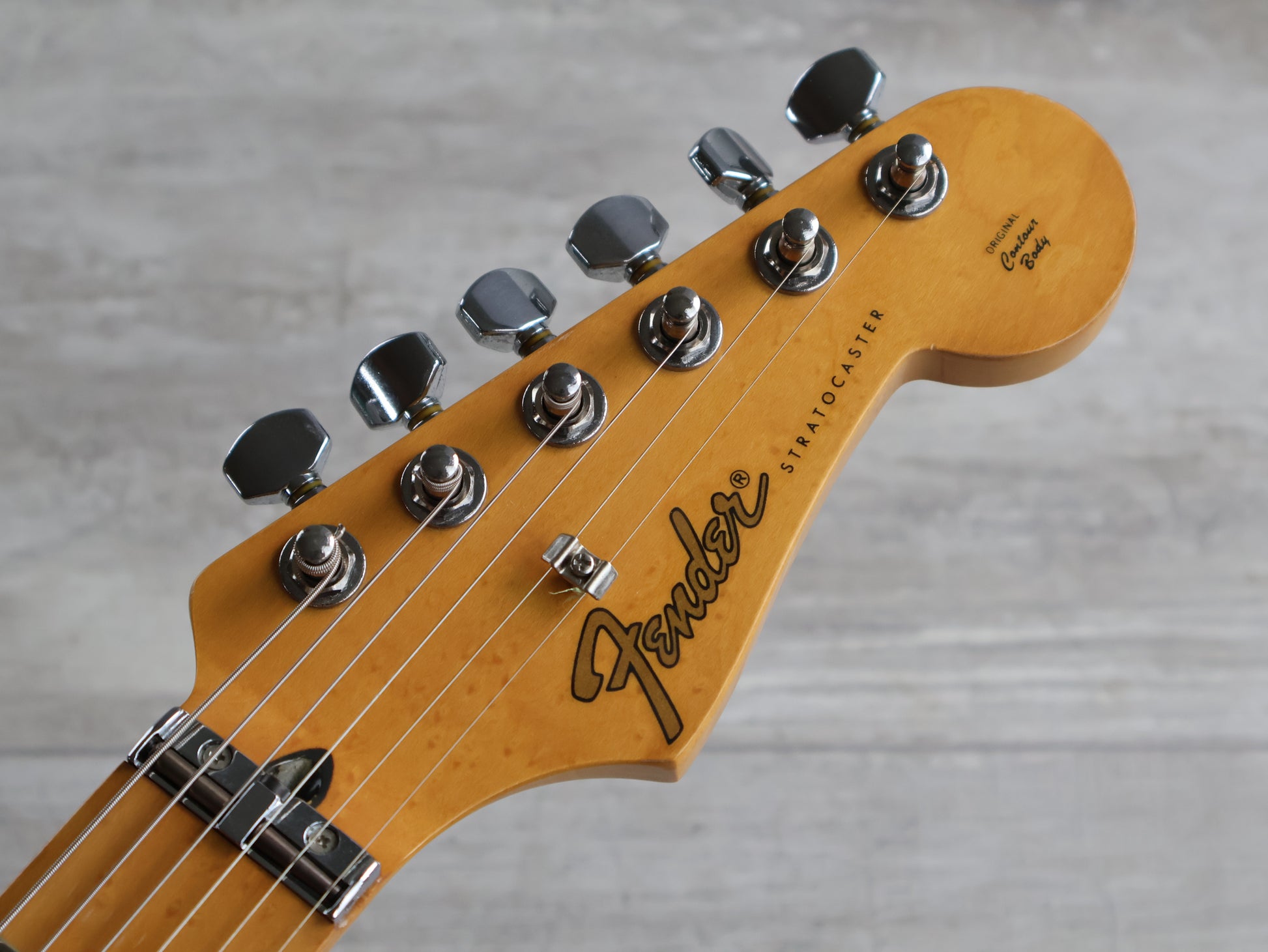 Ash body with a transparent brown finish bolted to a satin feel birds-eye maple neck (22 frets, 648mm scale length, 10" radius, 43.5mm nut width), it weighs 4.1kg's. Factory loaded with an "American Standard" bridge system and roller nut along with the original Gotoh tuners. The previous owner appears to have removed the original pickups/wiring and installed a standard unbranded HSS Stratocaster loadout.