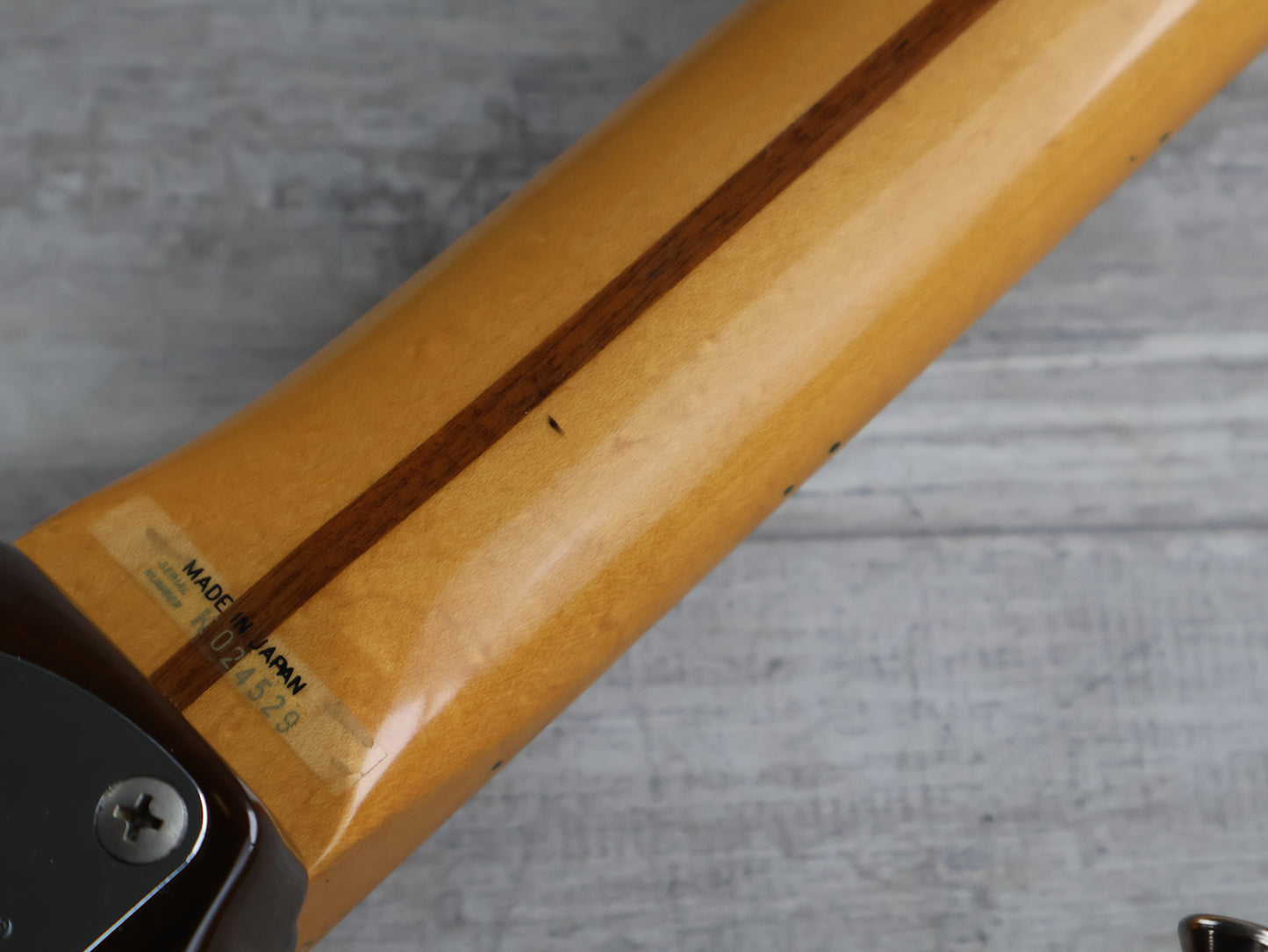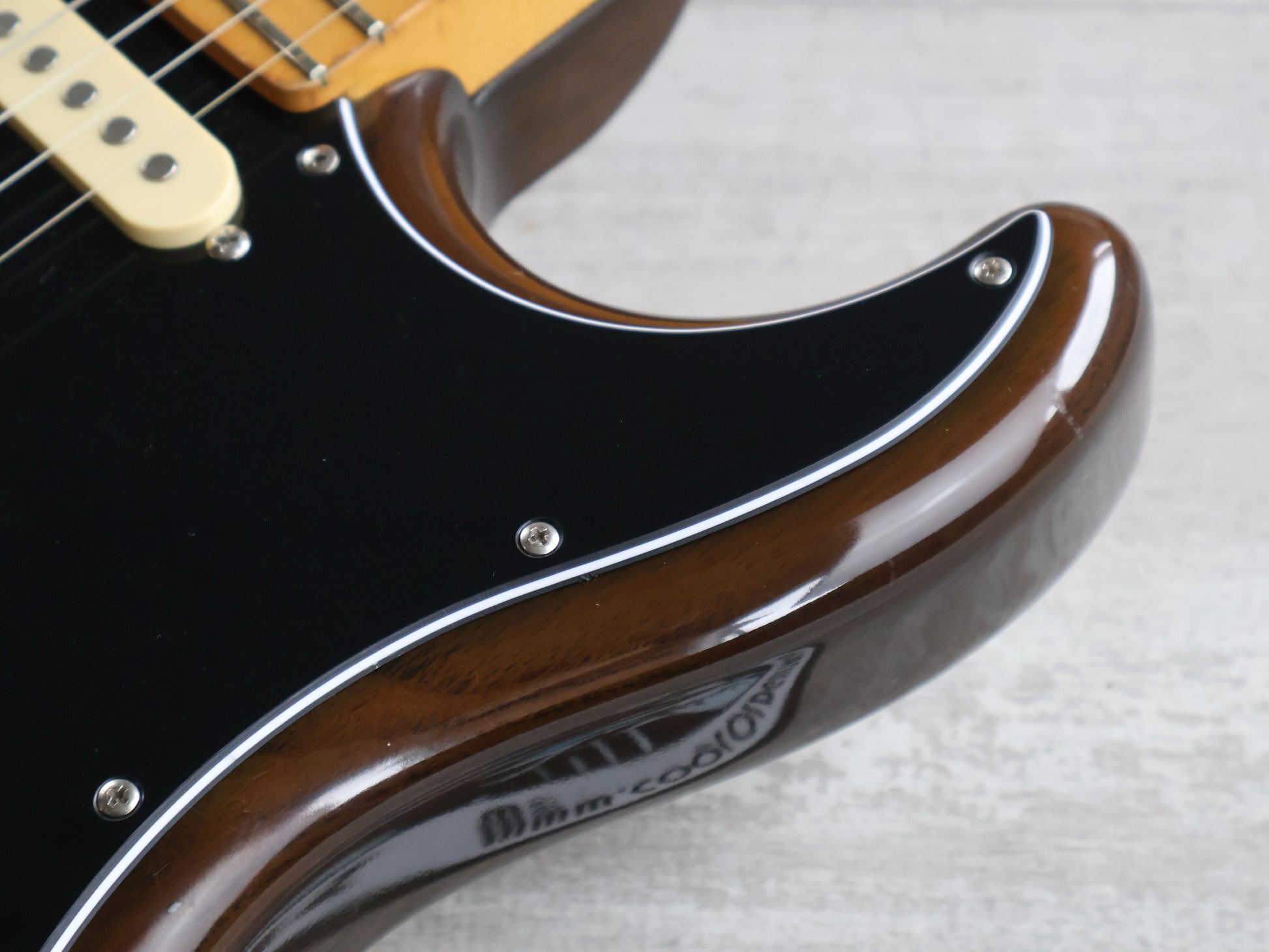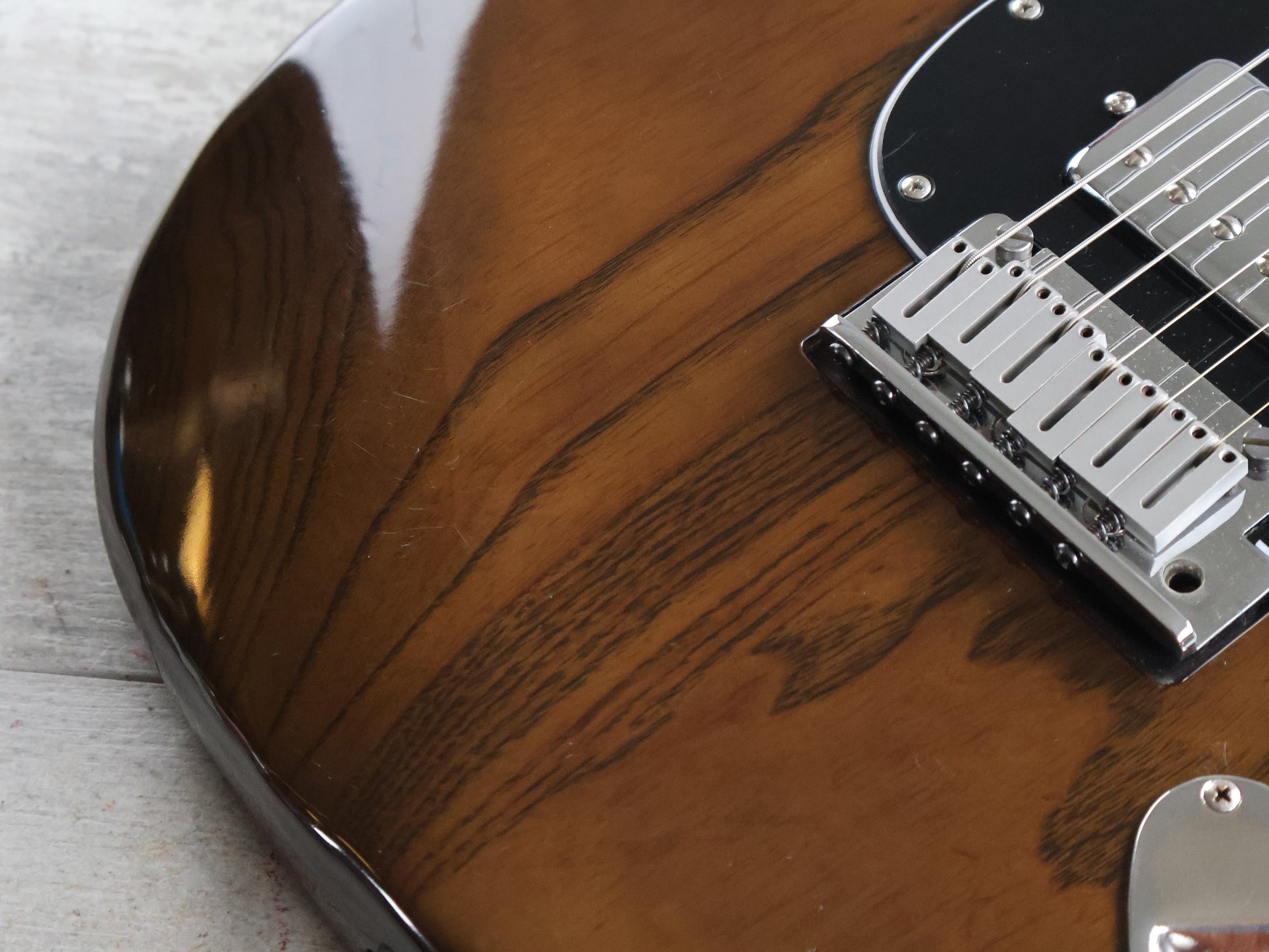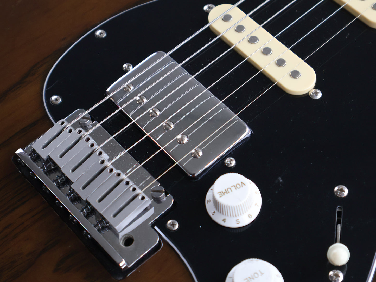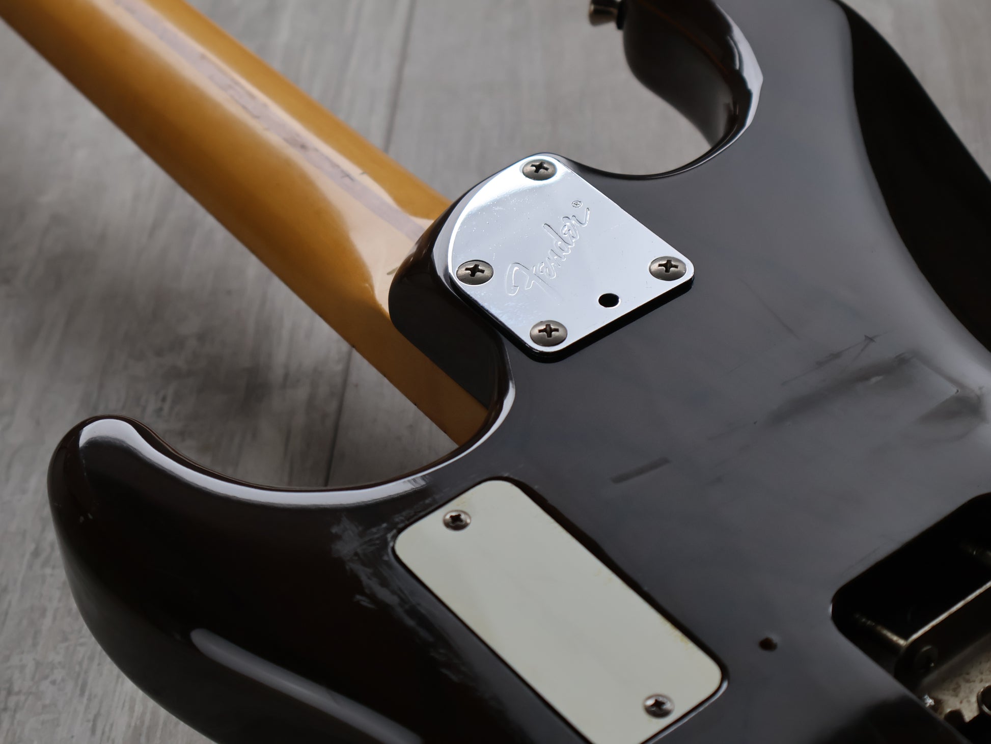 Ash body with a transparent brown finish bolted to a satin feel birds-eye maple neck (22 frets, 648mm scale length, 10" radius, 43.5mm nut width), it weighs 4.1kg's. Factory loaded with an "American Standard" bridge system and roller nut along with the original Gotoh tuners. The previous owner appears to have removed the original pickups/wiring and installed a standard unbranded HSS Stratocaster loadout.
