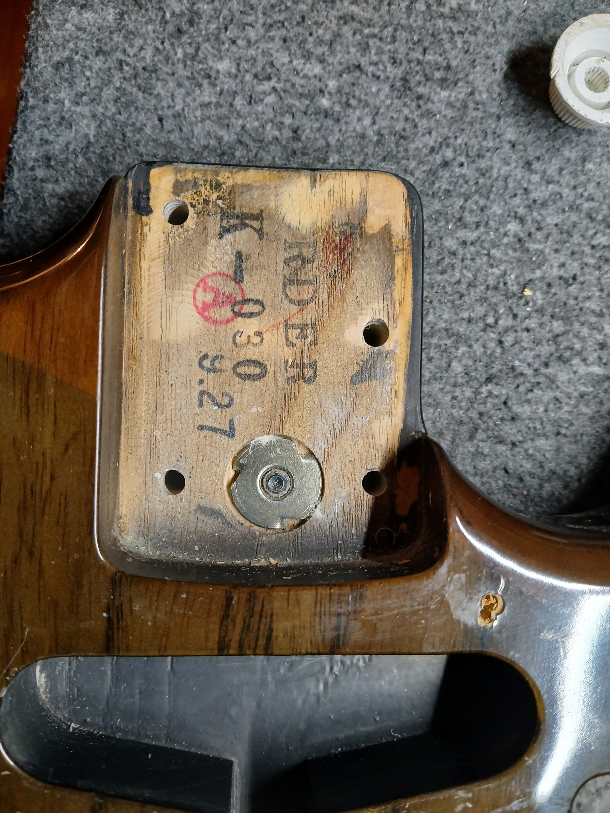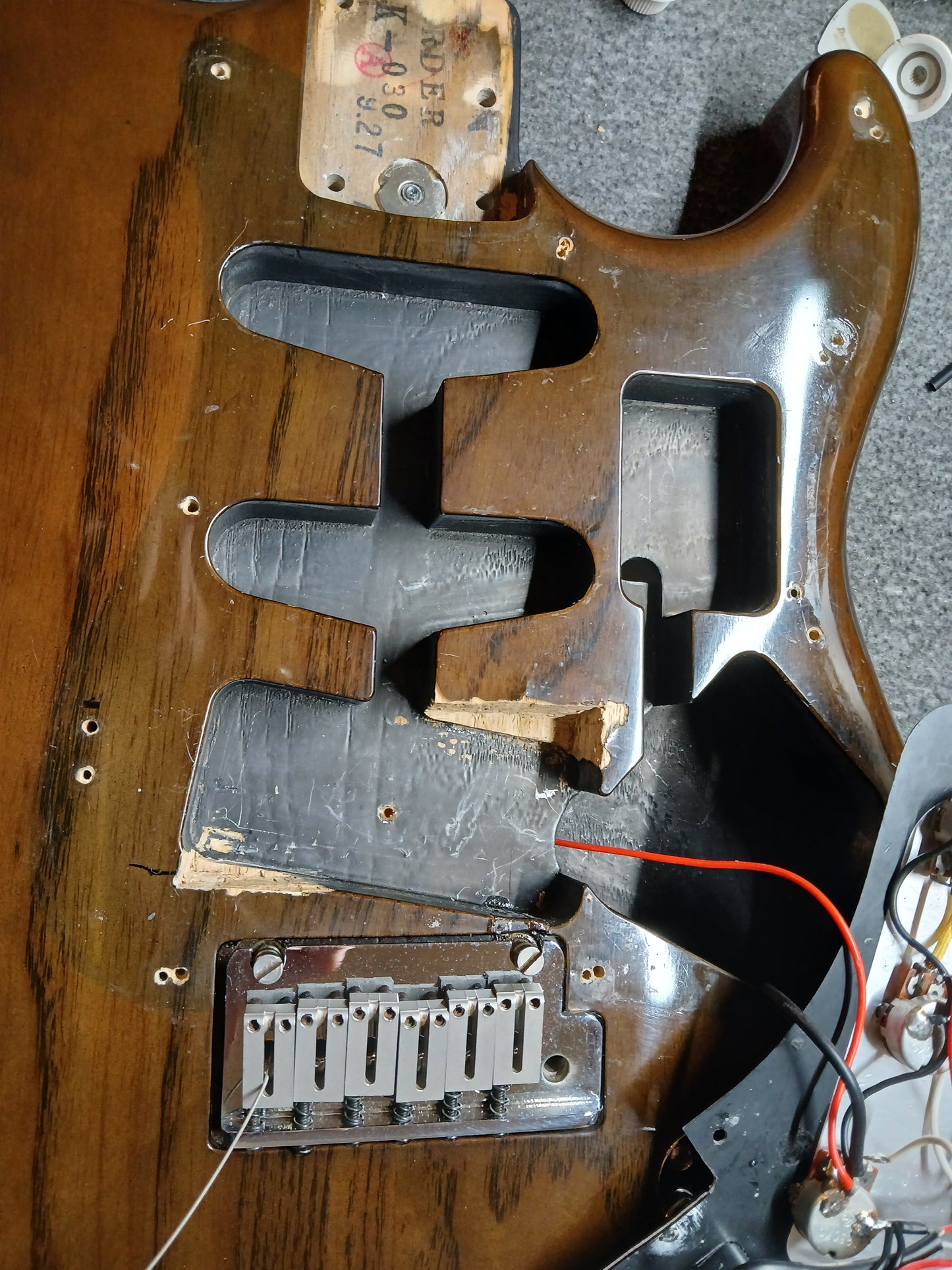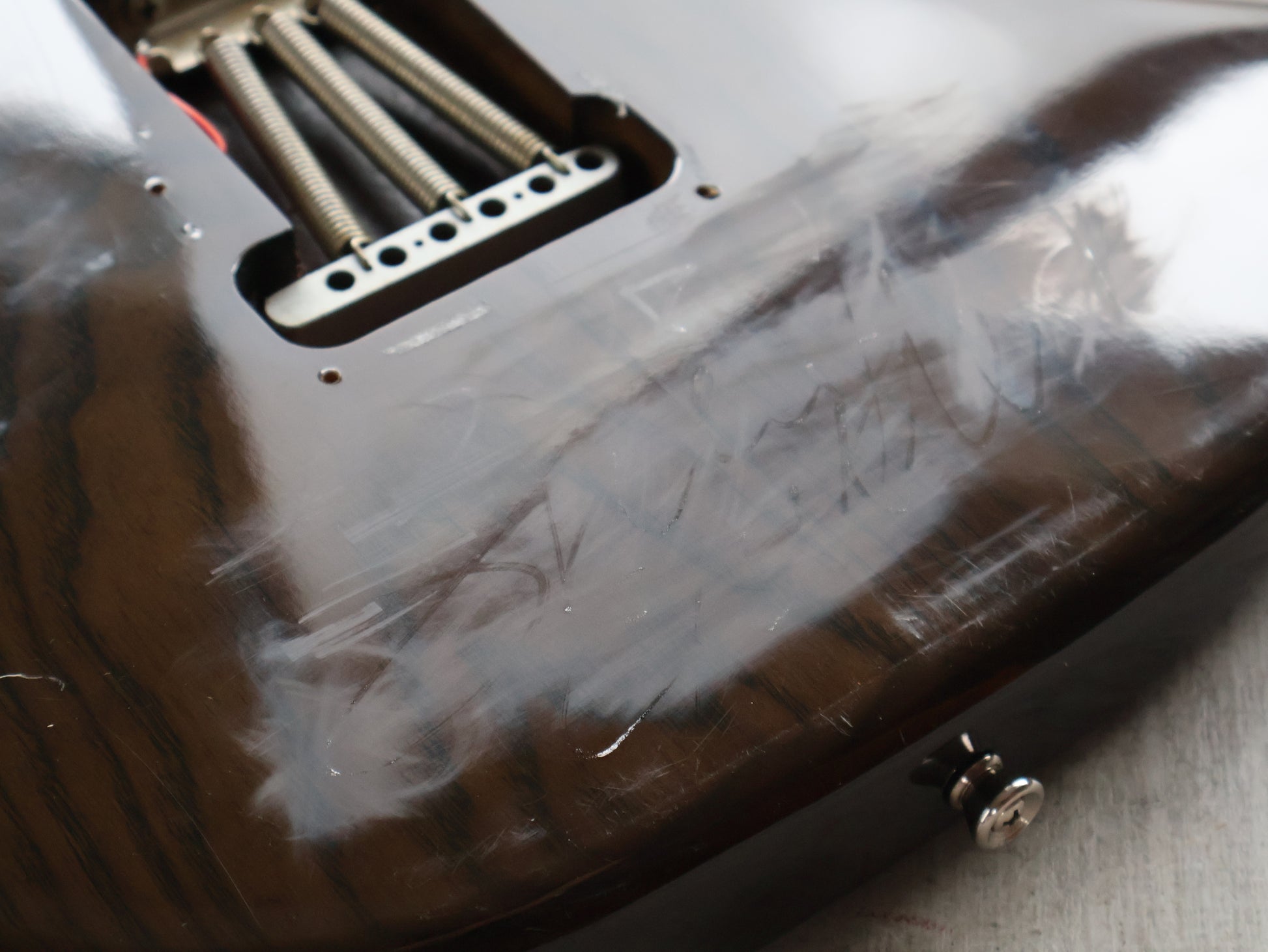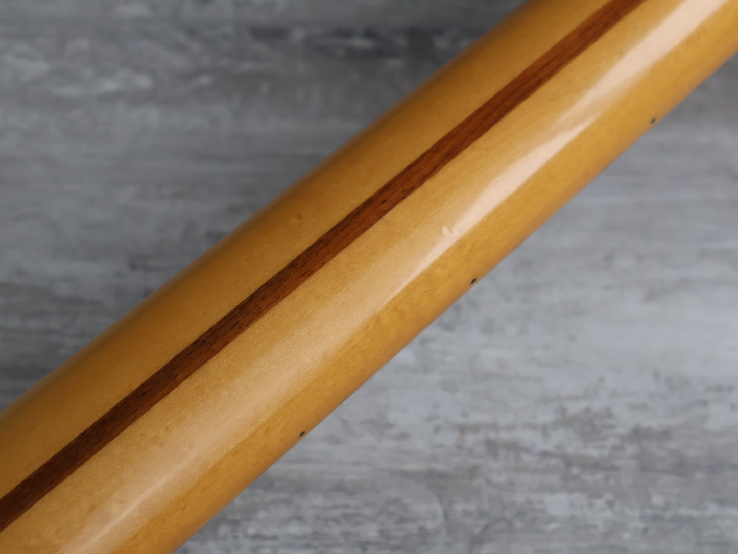 Ash body with a transparent brown finish bolted to a satin feel birds-eye maple neck (22 frets, 648mm scale length, 10" radius, 43.5mm nut width), it weighs 4.1kg's. Factory loaded with an "American Standard" bridge system and roller nut along with the original Gotoh tuners. The previous owner appears to have removed the original pickups/wiring and installed a standard unbranded HSS Stratocaster loadout.
