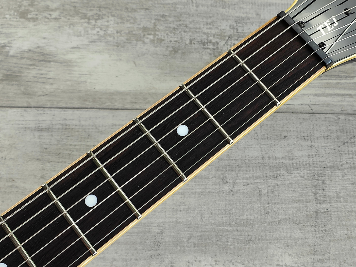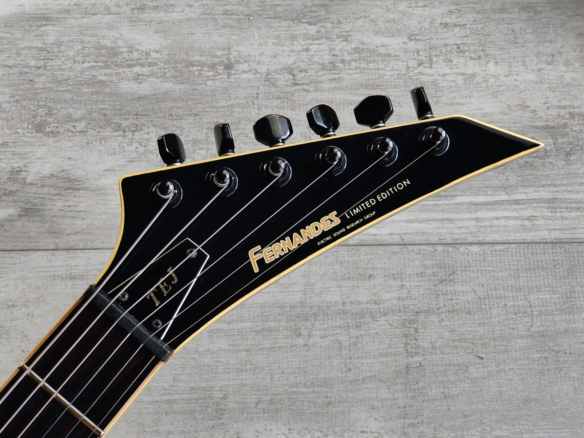Made in Japan by Fernandes in 1991, the TEJ is an ultra-modern variation on the Fender Telecaster design. Basswood body bolted to a painted maple neck with a 22 fret rosewood fingerboard (13.75" radius, 648mm scale length, 43mm nut width), it weighs 3.5kg's.