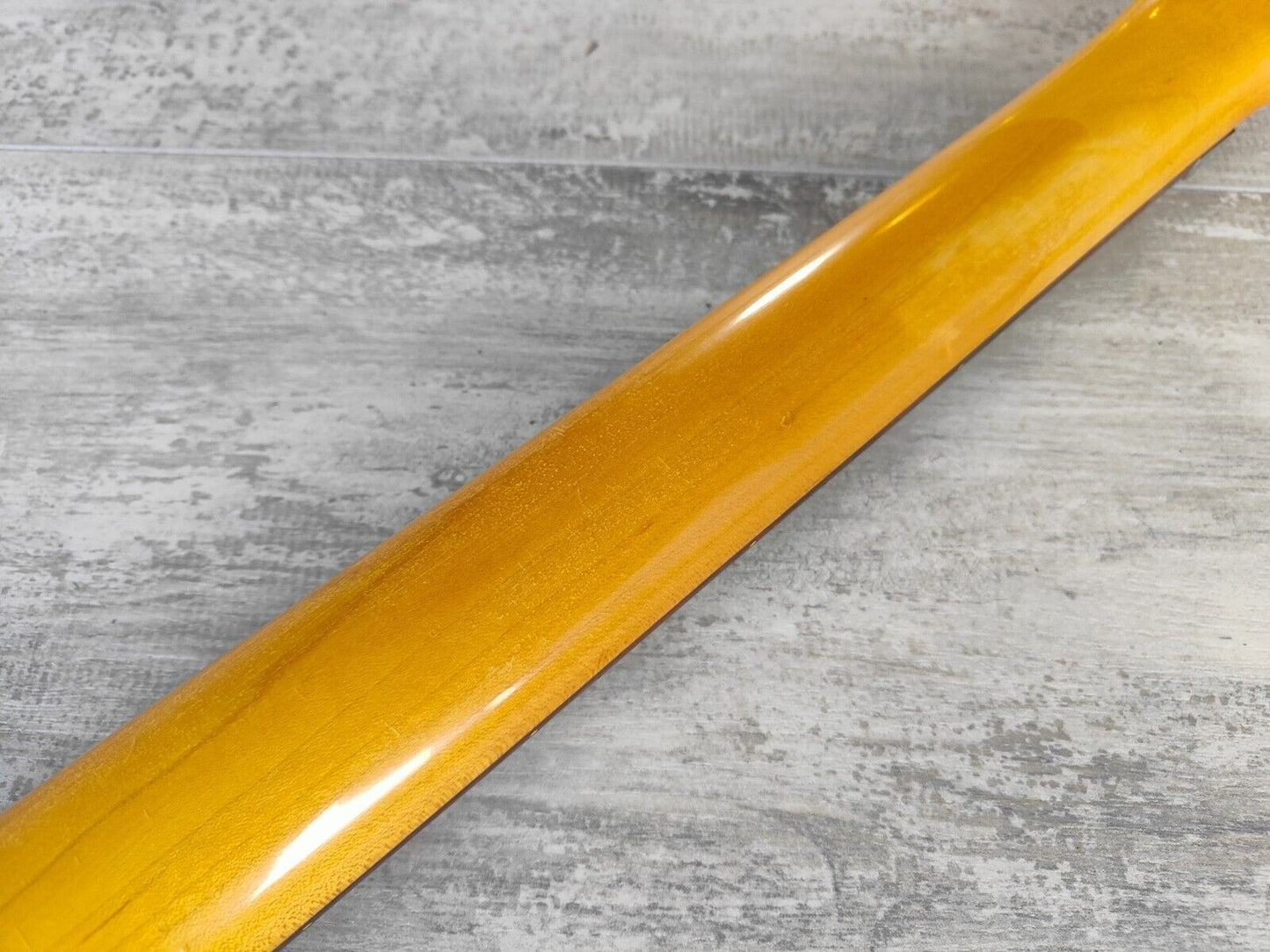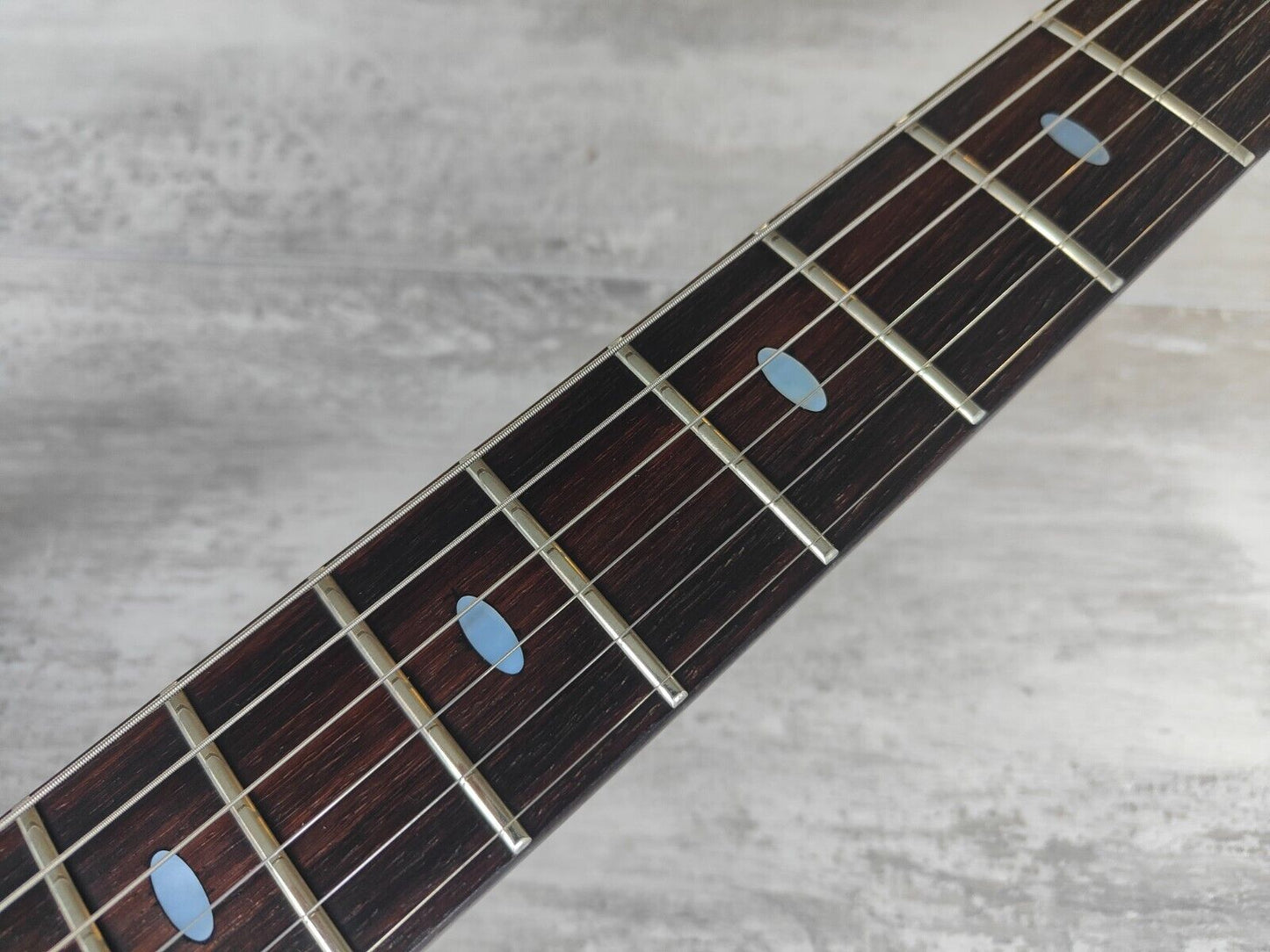 A higher end model from the Aria Pro II Magna Series of 1992, the MA-75 has a carved sen (ash) body with a slim maple neck and a 22 fret rosewood fingerboard (13.75" radius, 628mm scale length), weighs 3.4kg's. Loaded with factory 2AL HSH pickups controlled by volume/tone knobs, a 5-way switch and coil split toggle, chrome Gotoh tuners and a TRS-101 Floyd Rose tremolo system.