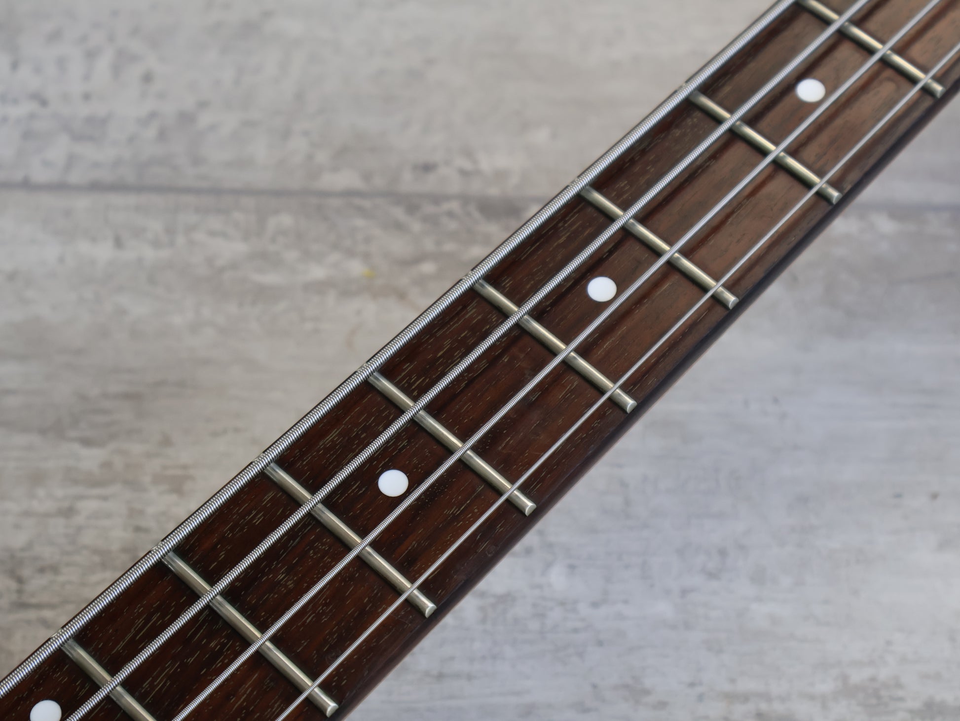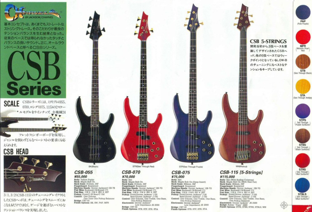 Japanese made in 1992, the CSB-070 was a medium scale offering from Charvel Jackson. Solid Sen Ash body with a bolt on maple neck and 24 fret rosewood fingerboard (32" scale, 38mm nut width), it weighs 3.6kg's.