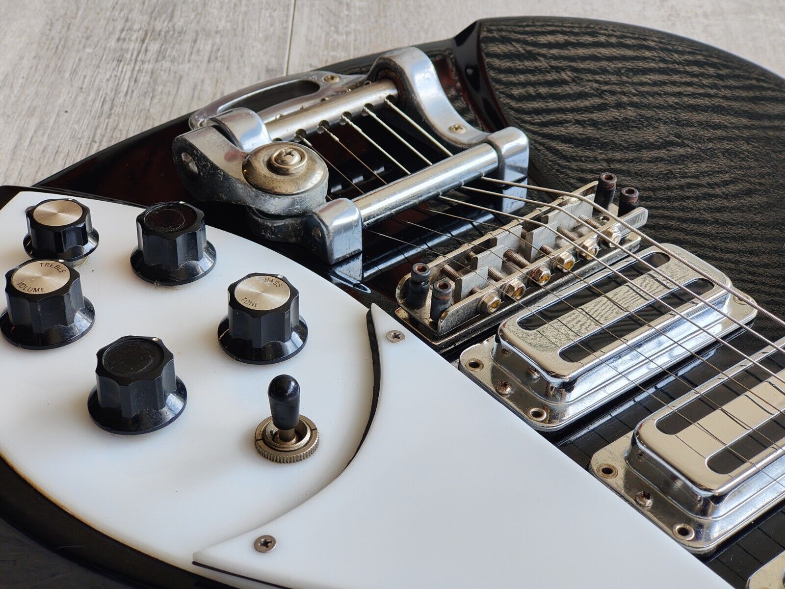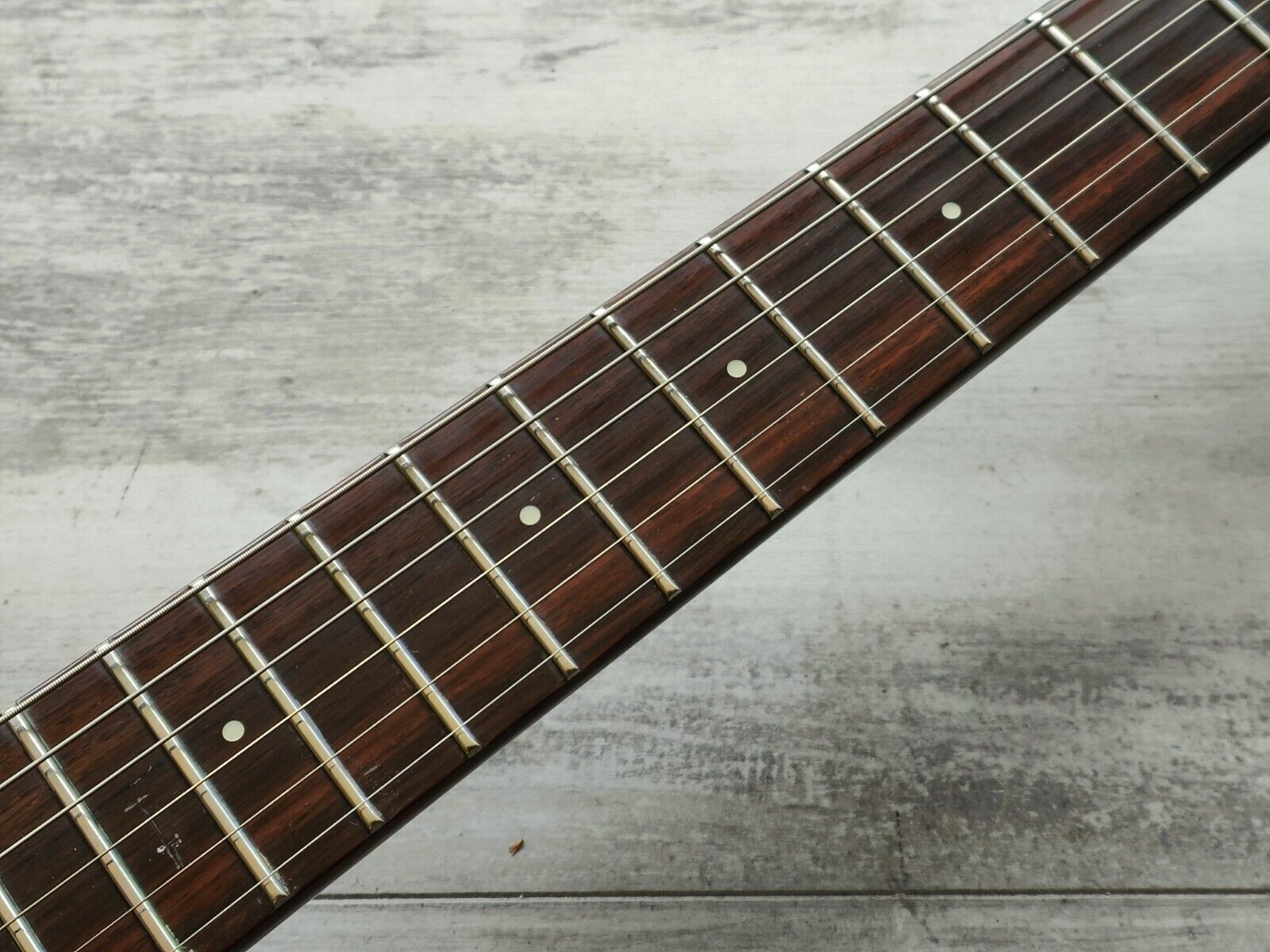 Made by Fernandes in the early 1990's, this very obviously emulates a model from a guitar brand that i'm not allowed to mention on marketplaces (but you know what it is). Solid maple body with a maple neck and a rosewood fingerboard (20" scale length, 41mm nut width), it weighs just under 3kg's. The parts on these were completely fabricated by Burny/Fernandes for these models with custom plastics, custom pickups, custom hardware and a Bigsby style tremolo (although the previous owner removed the arm and spring to create a hardtail). Traditional 325 wiring with two volume knobs, three tone controls and a three-way pickup selector.