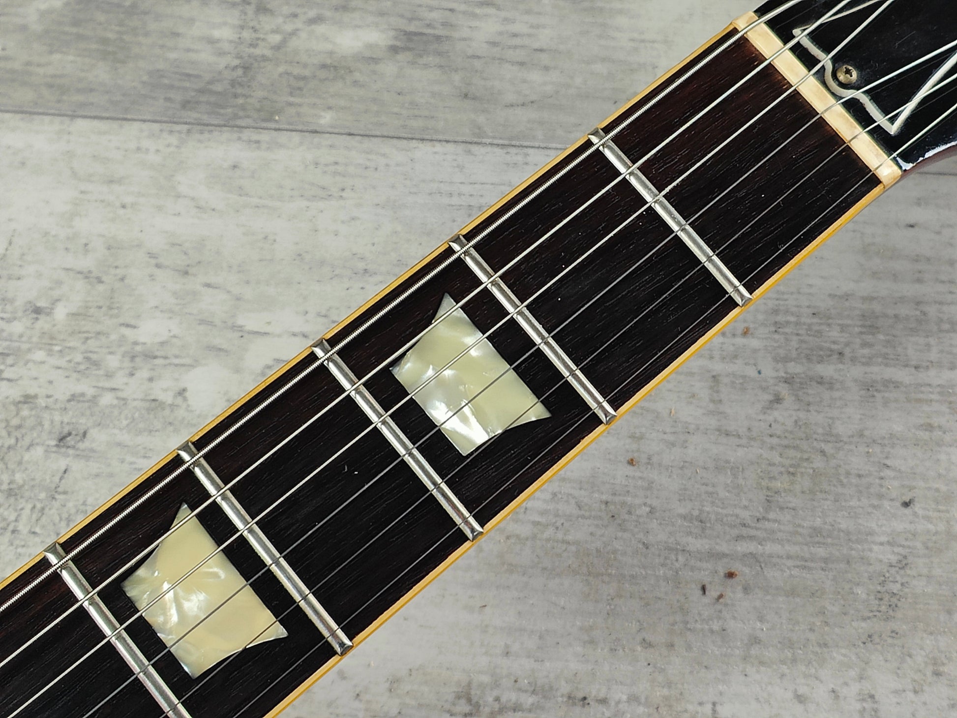 A lesser seen 1990's model from Greco, the EG-90 was a Japanese made Les Paul Standard that continued to solidify their reputation as masters of the affordable Les Paul. With a solid mahogany back paired, lightly carved solid maple top (with a laminate amber flame), long tenon mahogany slim 60's neck and a 22 fret rosewood fingerboard, it weighs a hefty 4.6kg's.