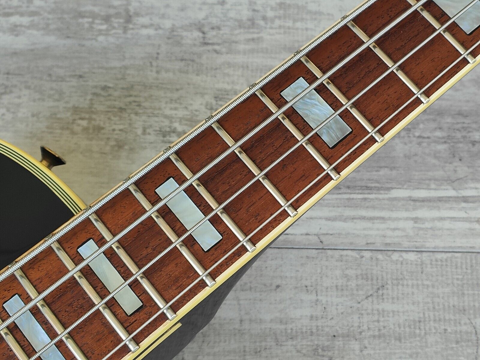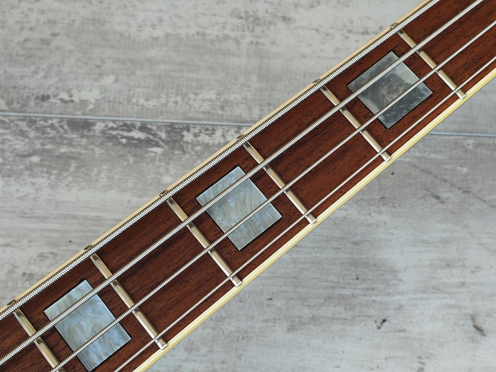 Made in Japan in the 1990's for the Japanese market (hence the full Gibson aesthetic with an open book headstock and Gibson style inlays), the EGB-850 was Greco's interpretation of a short-scale Les Paul Custom bass. Solid mahogany body with a maple top and set maple neck with a rosewood fingerboard (24 frets, 770mm scale length, 39mm nut width), it weighs 4.6kg's. The previous owner loaded with with a pair of active EMG's (original pickups not included) controlled by a pair of volume/tone knobs and a three-way pickup selector.
