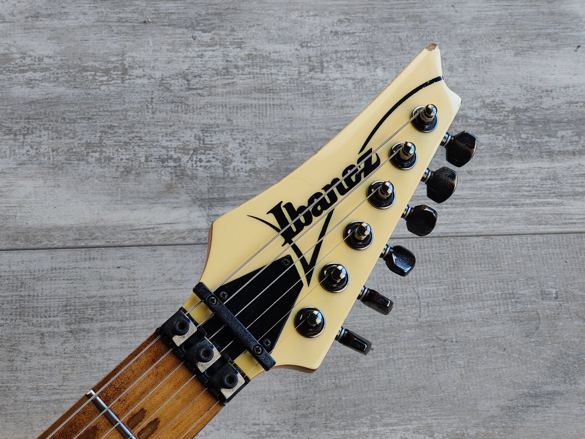 Paul Gilbert's longest running signature model, the PGM300 was made by the Fujigen factory from 1991 until 2004. This is a 1992 build with the classic aged white finish on a solid basswood body bolted to a Wizard profile maple neck with a 24 fret fingerboard (jumbo nickel frets, 44mm nut width, 648mm scale length), weighs 3.5kg's.