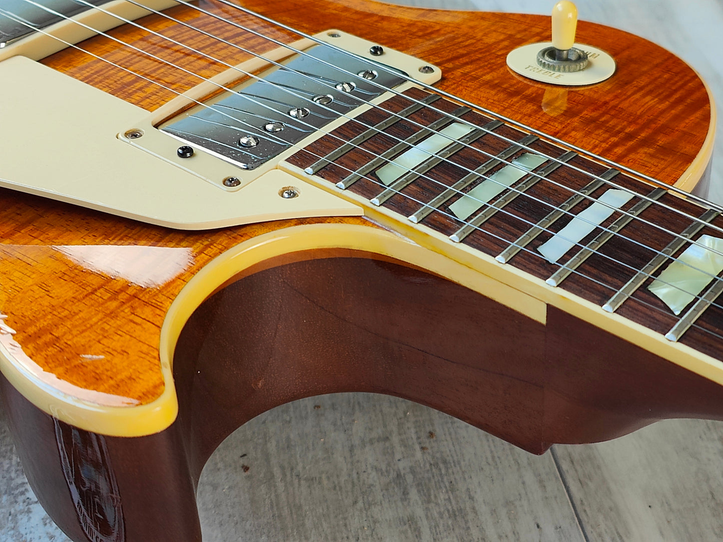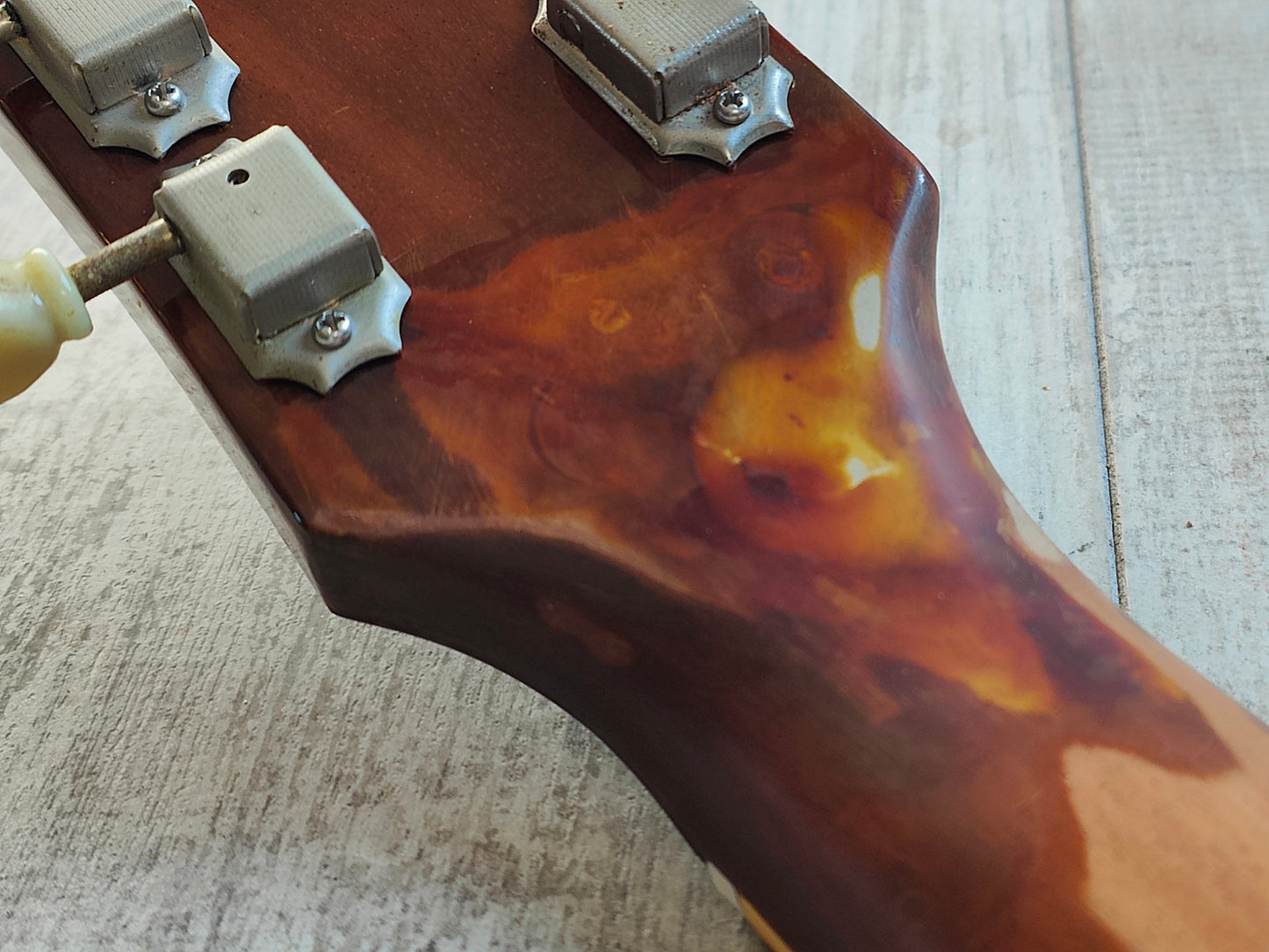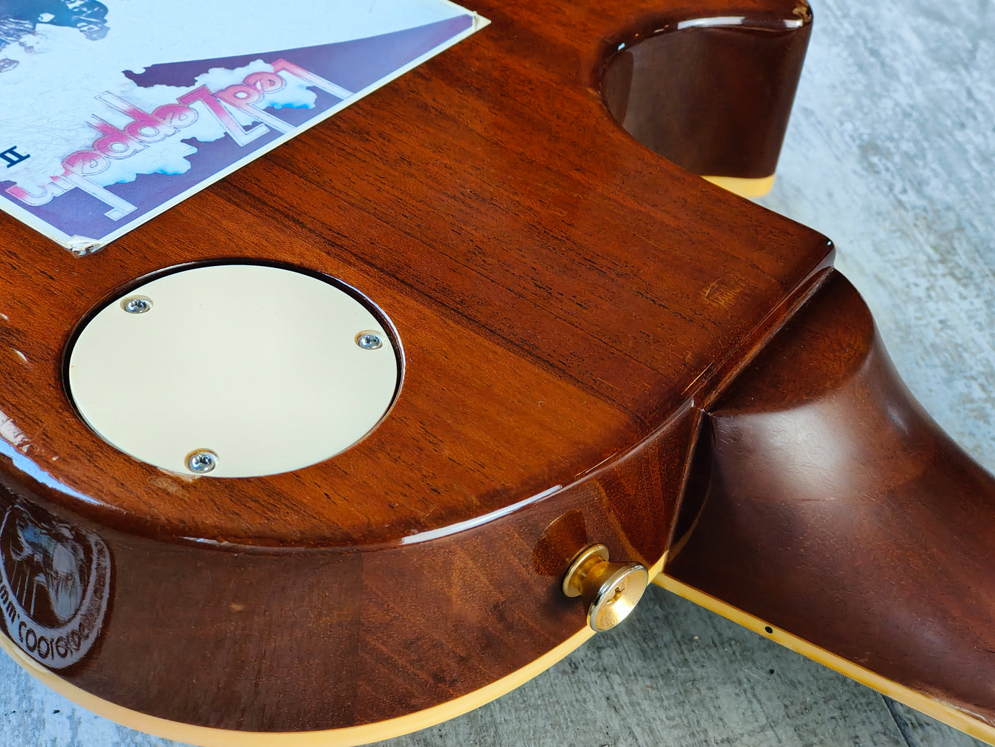 This one has a pair of Gotoh humbuckers installed along with Japanese hardware and wiring (two replacement pots). There's also two replacement inlays that seem to be made of rubber.