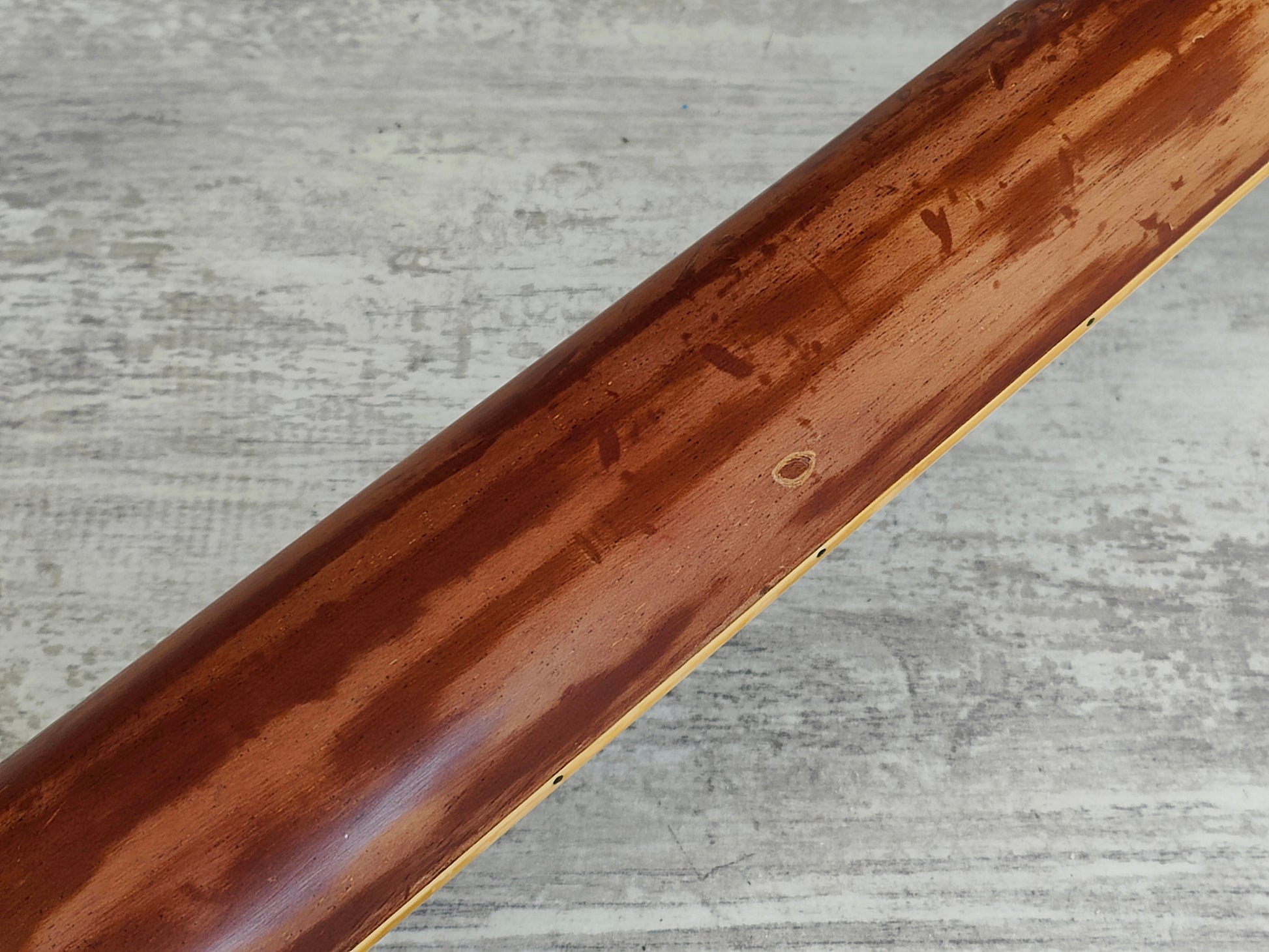 Heavily used condition as pictured with plenty of wear and tear and a previously repaired headstock break that's ugly but rock solid. The neck was sanded smooth at some point too so it has a satin feel. Received a full professional setup and service prior to listing including a fretboard oil, truss adjustment, fret polish and level and electronics cleanup. The frets have some pitting but play as they sit and the neck is straight.