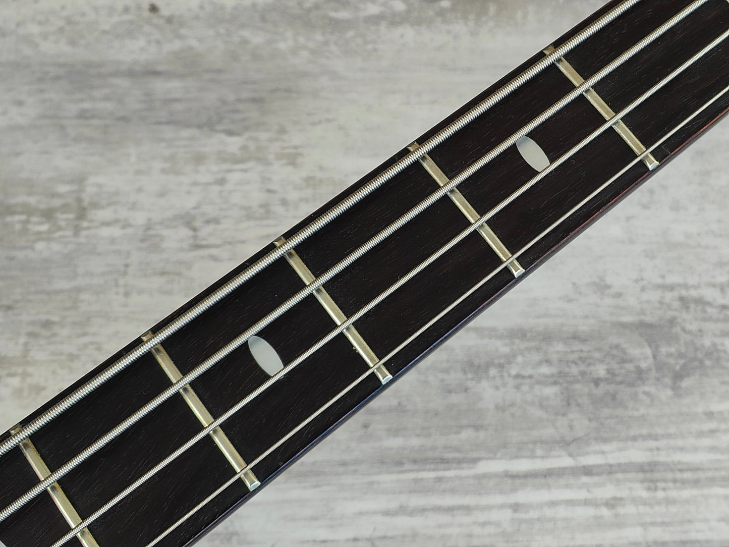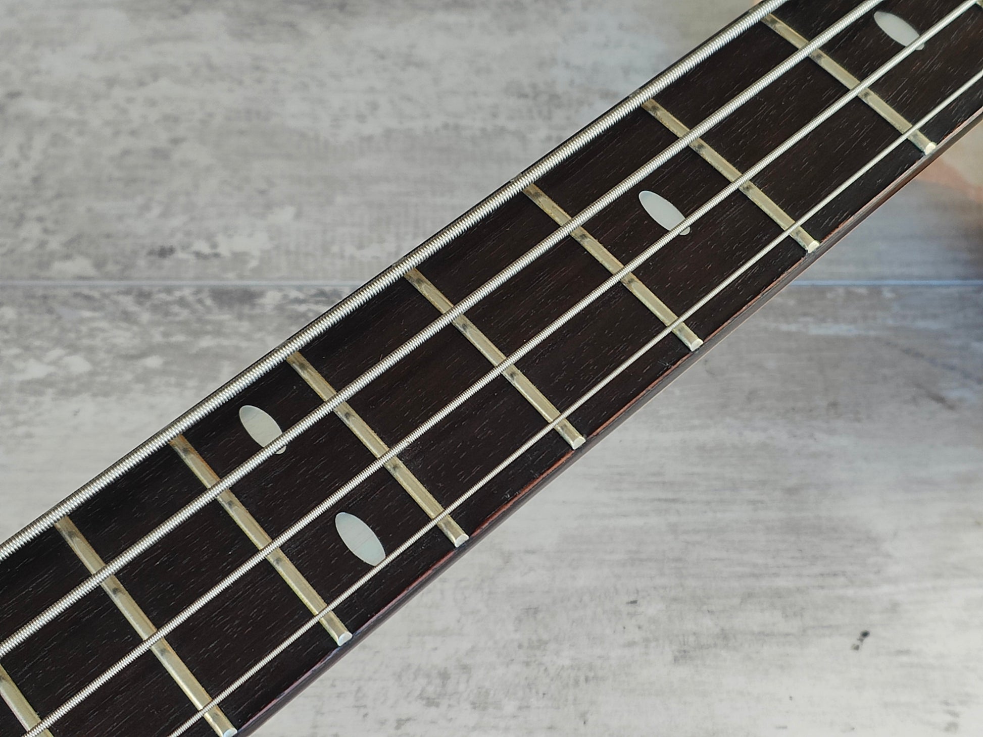 Japanese made in 1993 by the AP Custom Shop, this absolutely ridiculous Bass was an artist model conceptualised by Tsunematsu Matsui. With a carved alder body, maple neck, 20 fret rosewood fingerboard (15.75" radius, 40mm nut width, 34" scale length), it weighs just under 4kg's. Loaded with a single MTB--01 P style pickup controlled by just an on/off push switch along with the original BTB-04 bridge and Gotoh tuners.