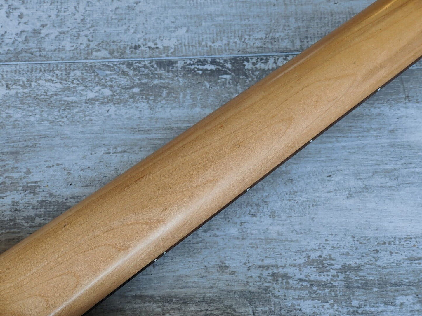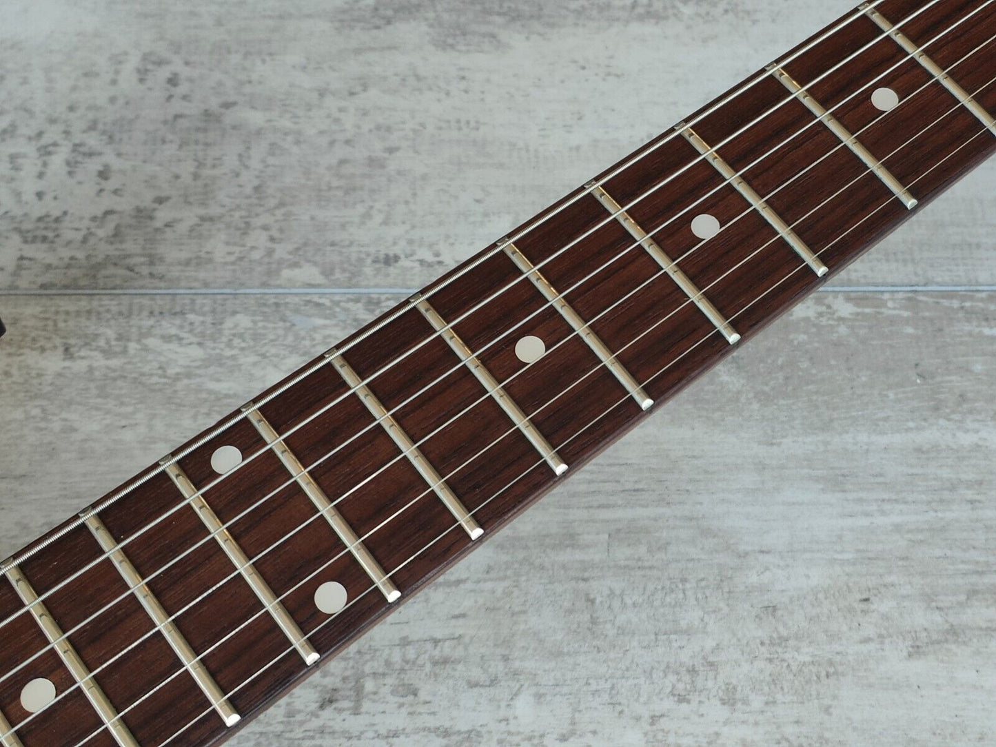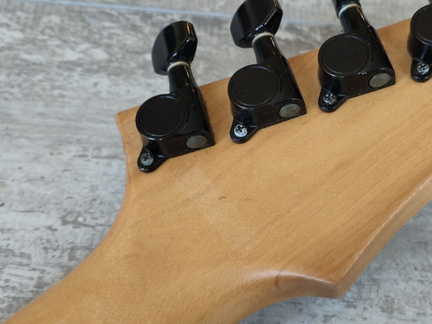 A Japanese made NJ Series Warlock from the domestic market in the early 1990's (dated using the pot codes as the serial sticker has been removed). Maple body bolted to a slim maple neck with a dark slab rosewood fingerboard (24 frets, 628mm scale length), it weighs 3.6kg's. Loaded with a Licensed Floyd Rose tremolo system and the original BC Rich "Super Distortion" style humbuckers controlled by two volume knobs, a tone knob and a three-way pickup selector.