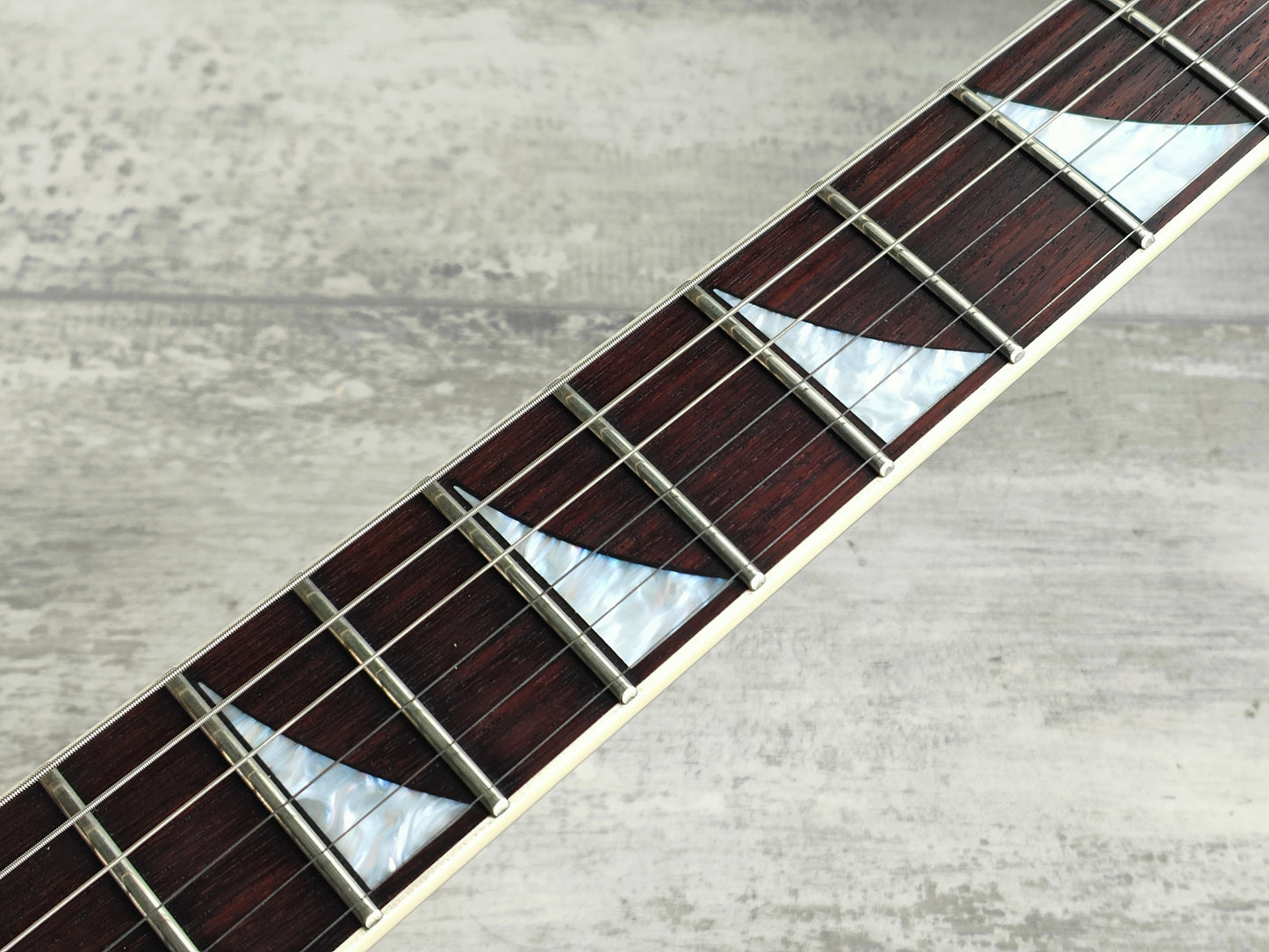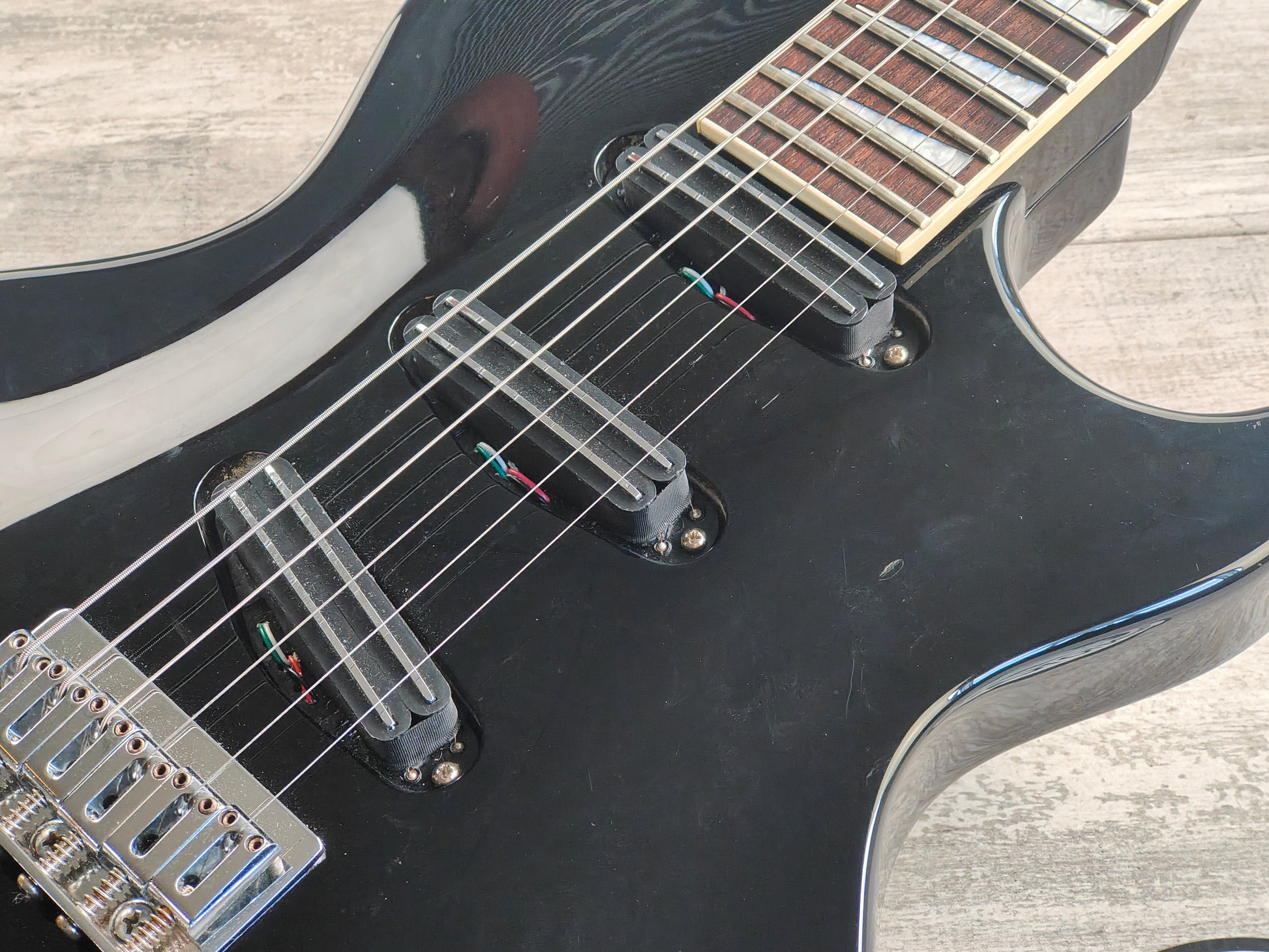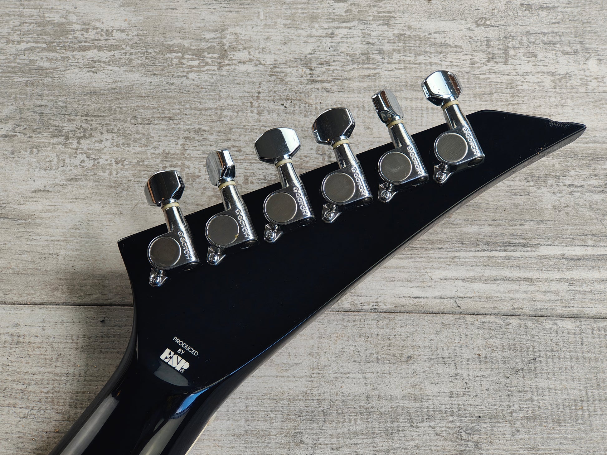 Made in Japan under the watchful eye of ESP in 1993, the EI-110LP was a new model that was inspired by the ESP signature model for Inoran of Luna Sea. With an alder body bolted to a maple neck with a 22 fret rosewood fingerboard (44mm nut width, 628mm scale length), it weighs 3.4kg's. Loaded with three mini rail humbuckers (unbranded) controlled by a 5-way selector, the hardtail bridge and Gotoh tuners give plenty of stability.