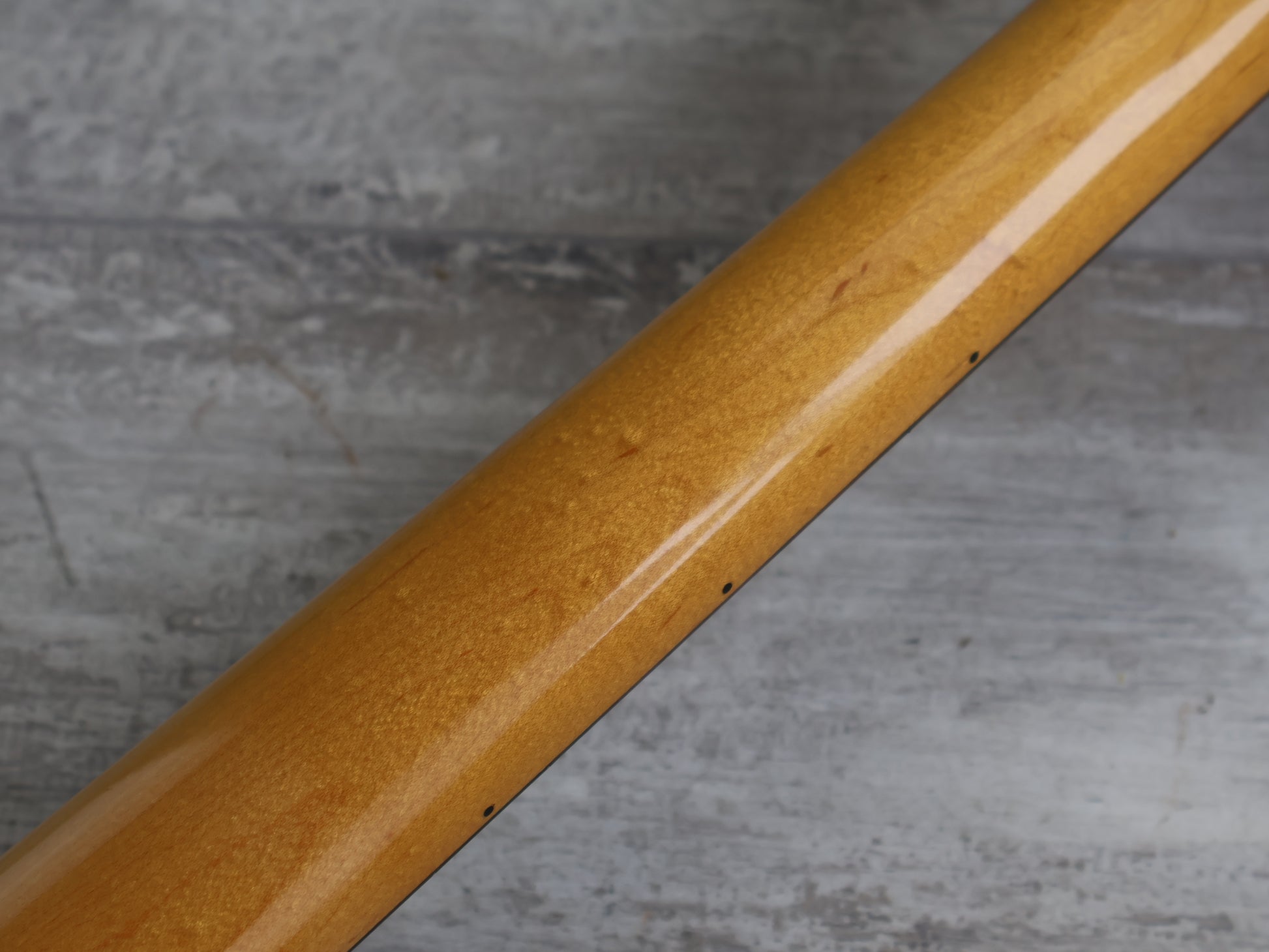 Basswood body bolted to a maple neck with a rosewood fingerboard (7.25" radius, 40mm nut width), it weighs 3.5kg's. Loaded with a pair of Gotoh P90's that were professionally routed and installed along with a Gibson-style three-way selector, it has a "Pawn Shop" series vibe while still retaining most of the original Mustang charm.