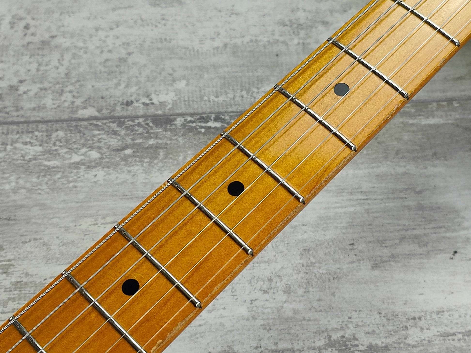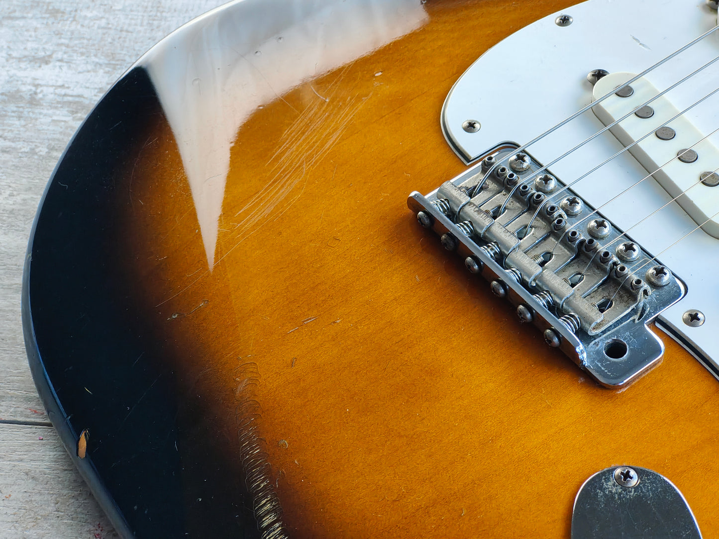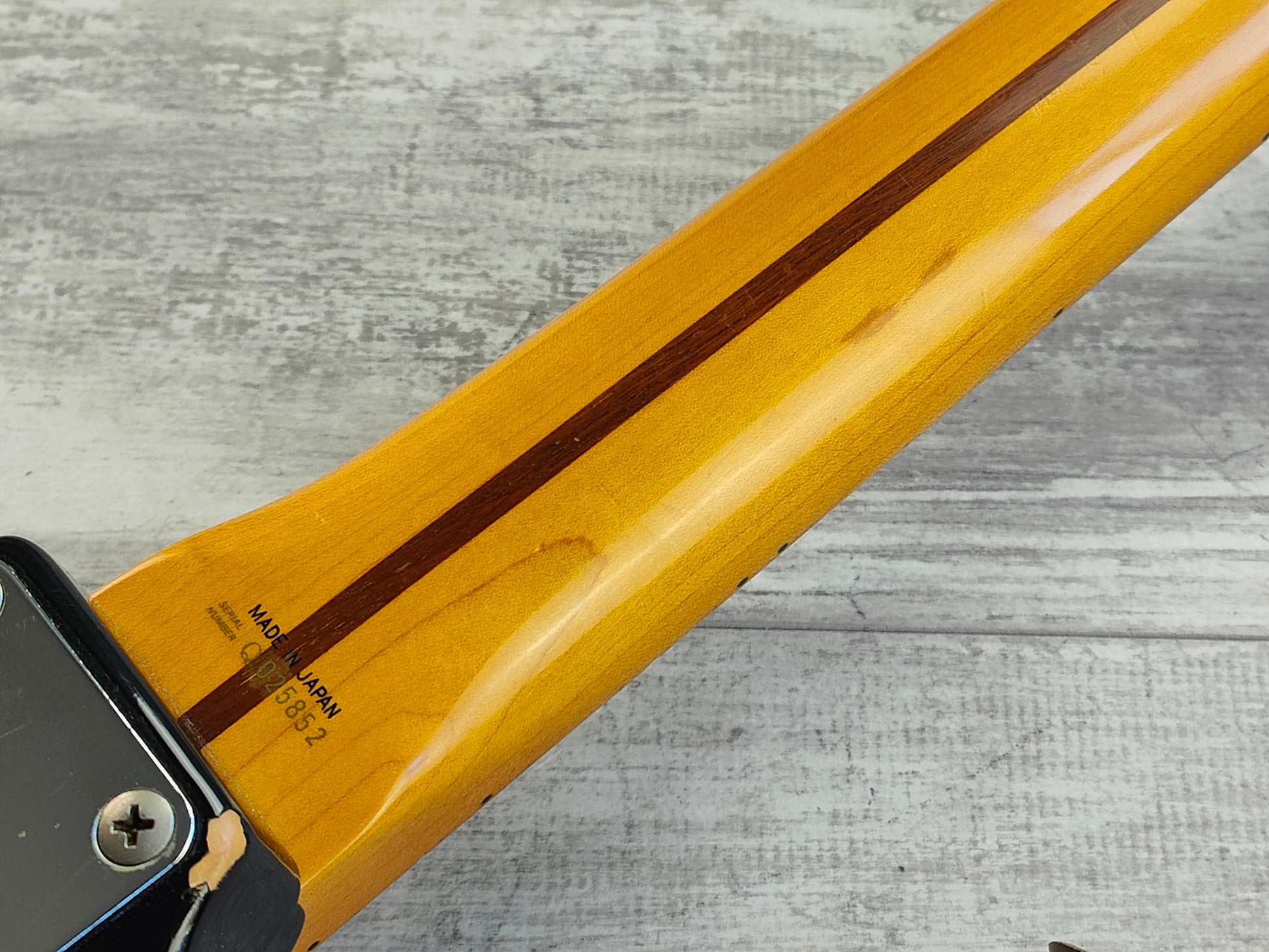 Made by the Fujigen factory in 1993, the ST57-53 was Fender Japan's entry level '57 reissue model. Basswood body wearing a timeless sunburst finish bolted to a 21 fret maple neck (7.25" radius), it weighs 3.5kg's. Loaded with Fender Japan single coil pickups, the original vintage style tuners and vintage saddles are working perfectly.