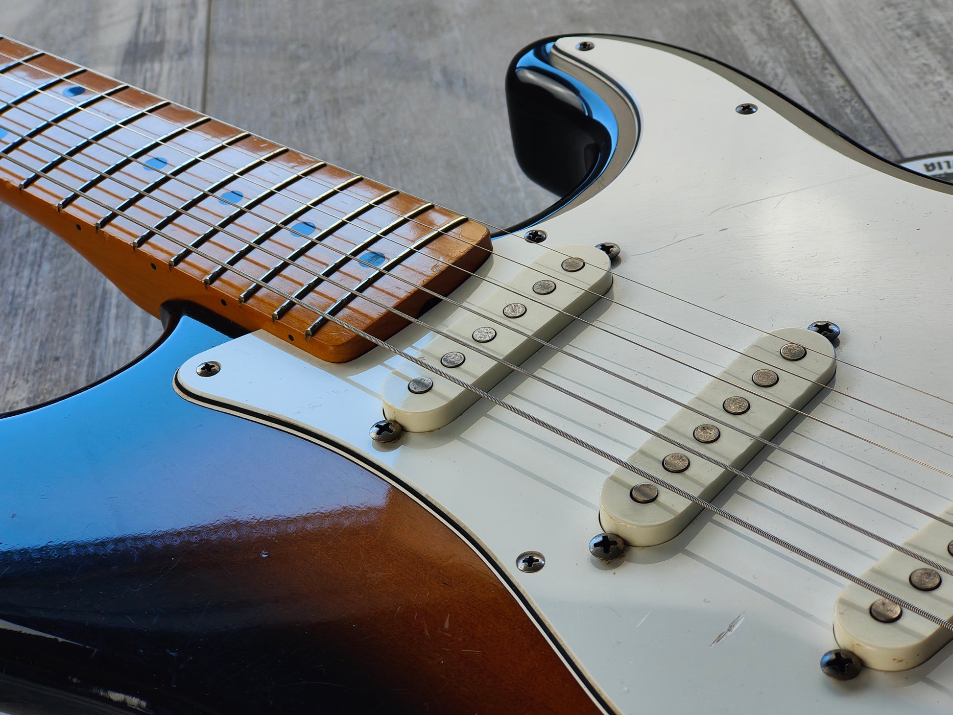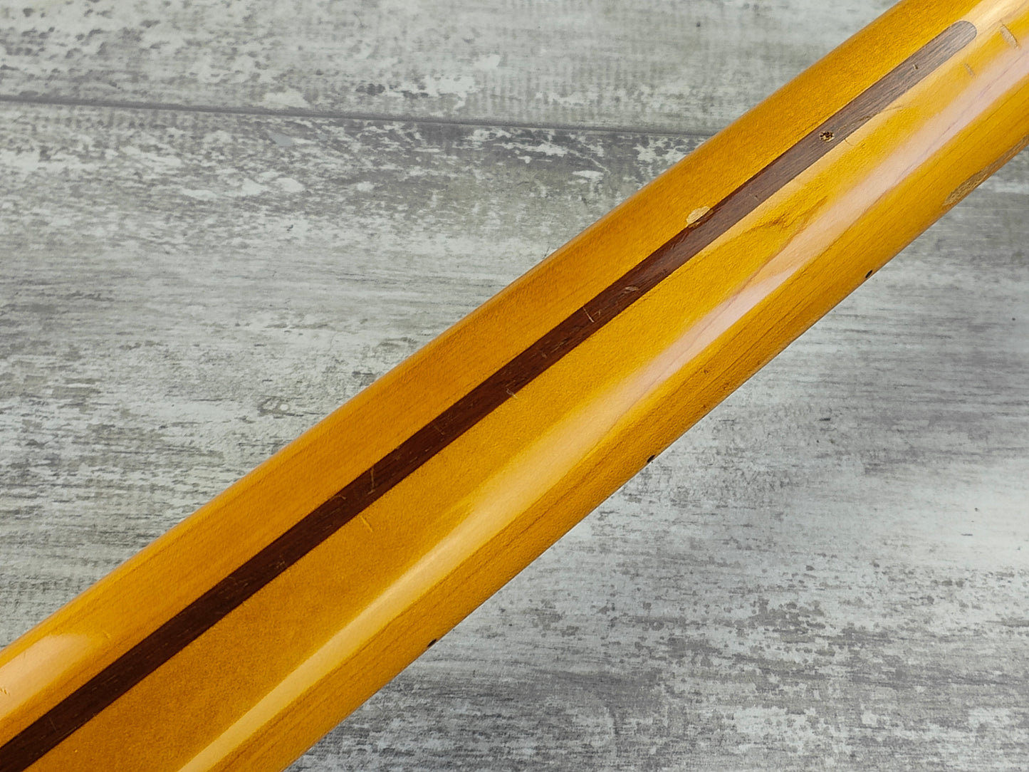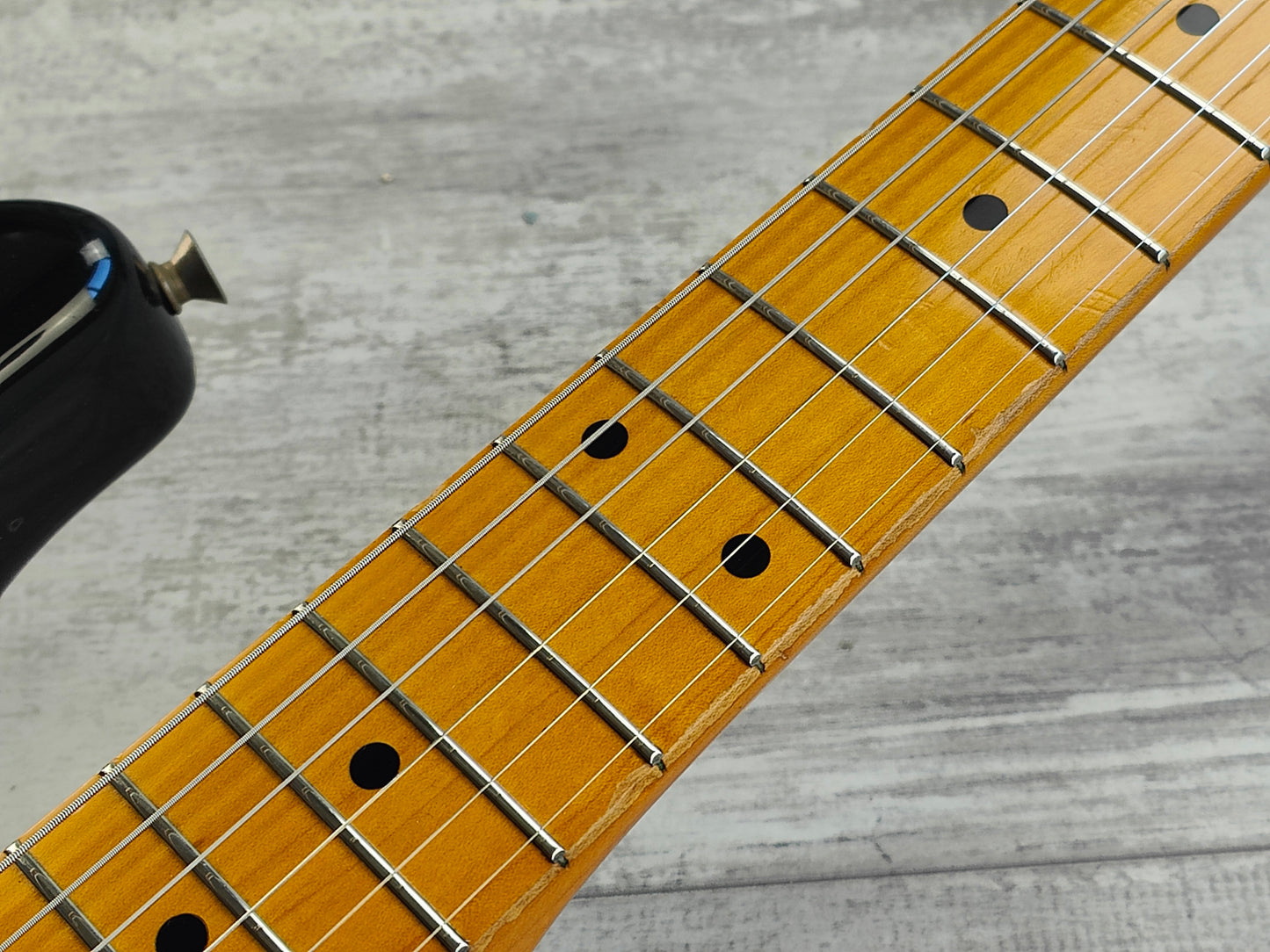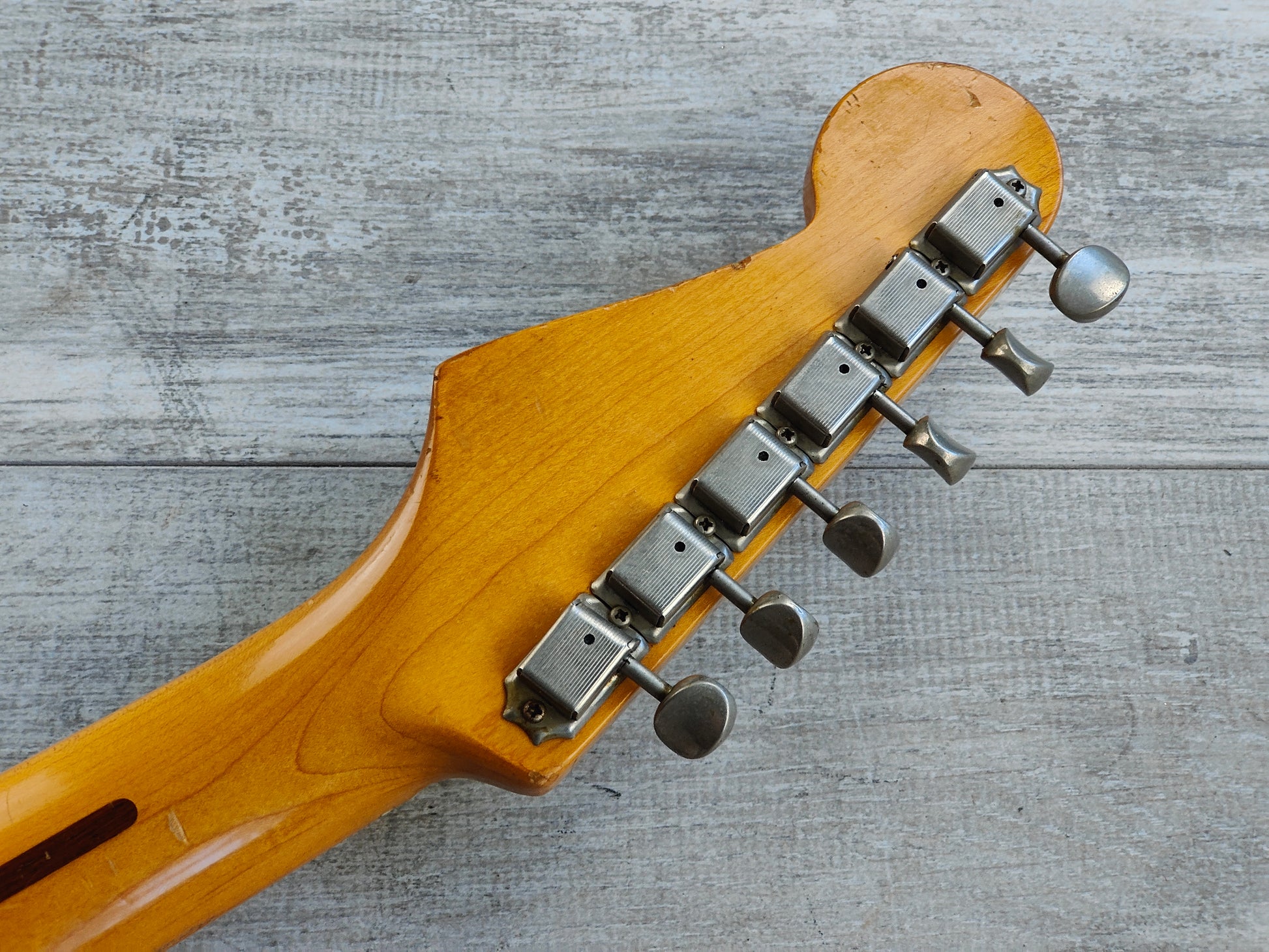 Made by the Fujigen factory in 1993, the ST57-53 was Fender Japan's entry level '57 reissue model. Basswood body wearing a timeless sunburst finish bolted to a 21 fret maple neck (7.25" radius), it weighs 3.5kg's. Loaded with Fender Japan single coil pickups, the original vintage style tuners and vintage saddles are working perfectly.
