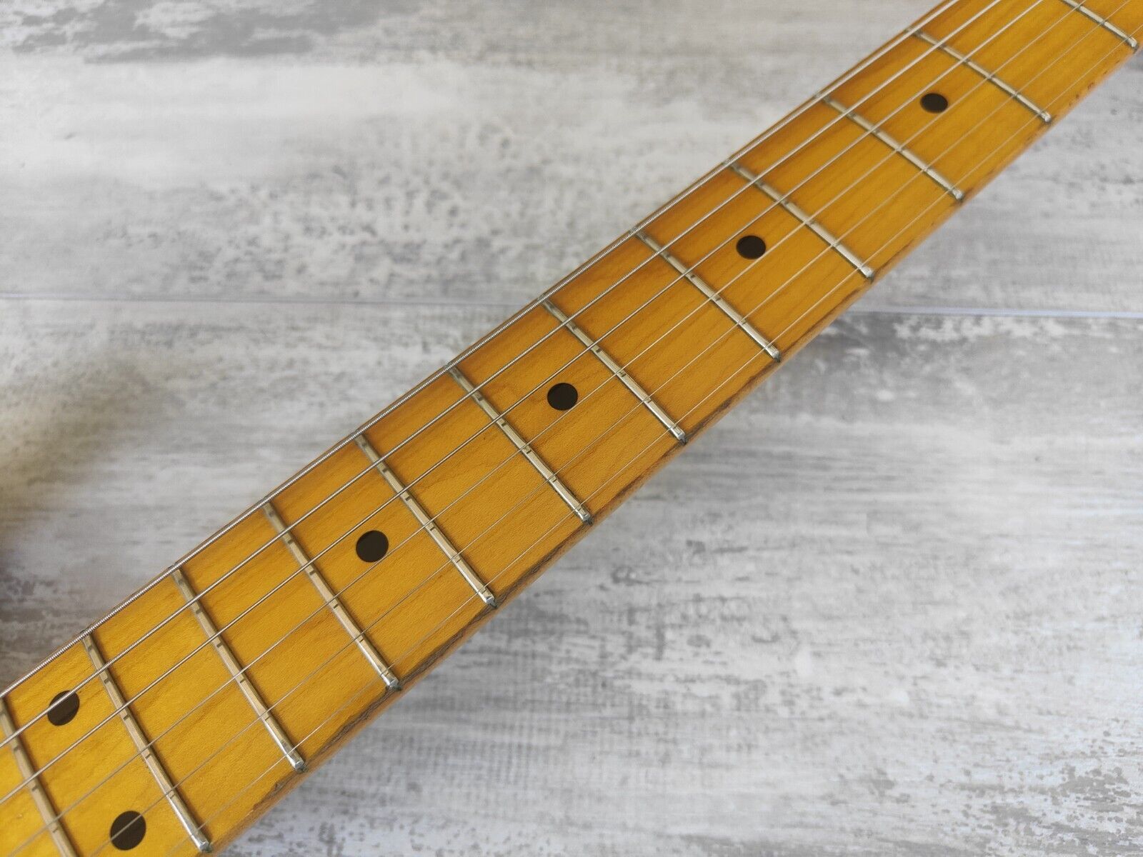 Made in Japan as part of the "Custom Edition" catalog in 1993, the ST57G-65 was a Fujigen built '57 reissue with some "custom shop" style factory upgrades. American Basswood body wearing a transparent "Charcoal Red" finish (Fender Japan's method for accentuating some of the grain), one-piece maple neck with a slim '57 profile (7.25" radius, 648mm scale length), it weighs 3.5kg's.