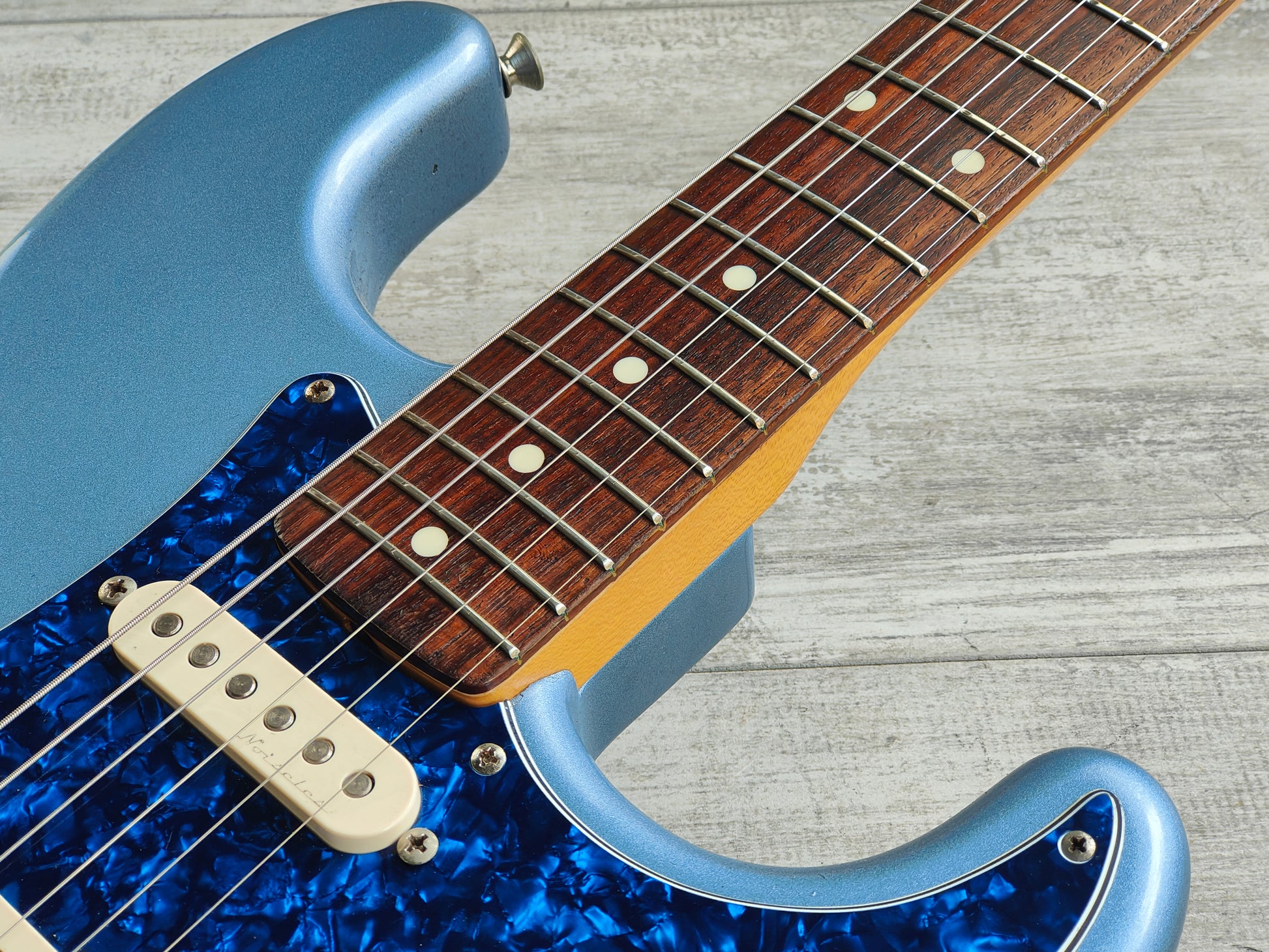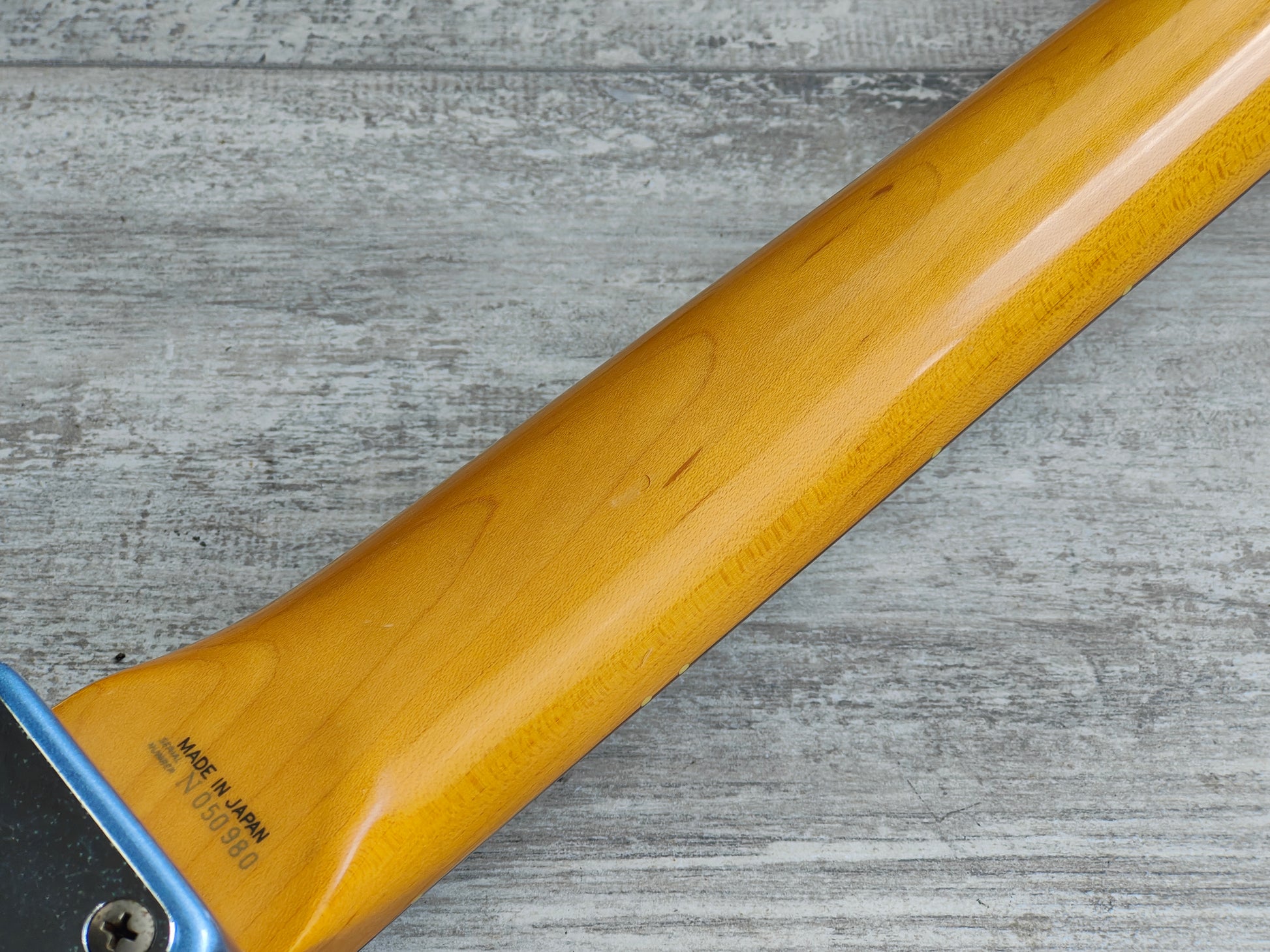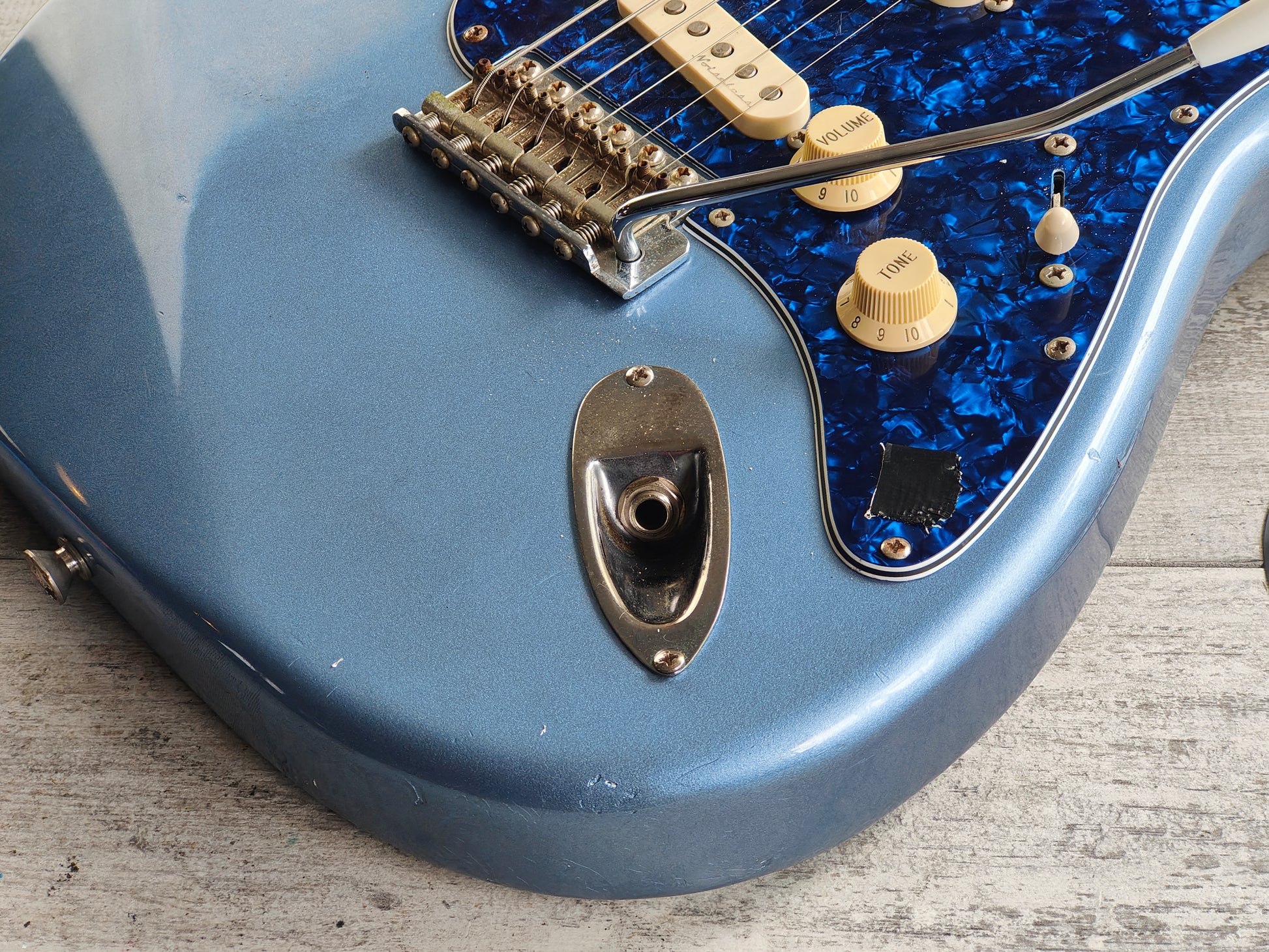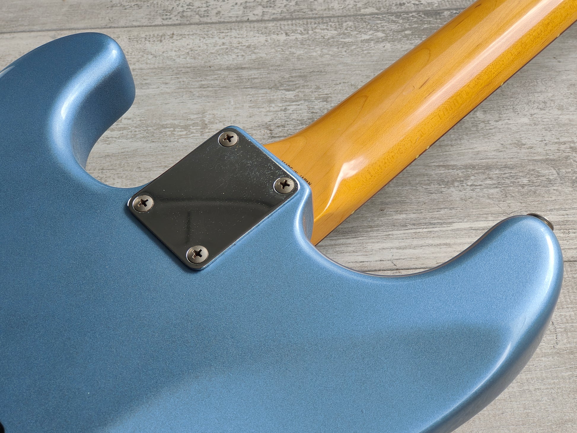 Made by the Fujigen factory in 1993, this '62 reissue from Fender Japan is loaded with a set of aftermarket Fender Noiseless pickups and wears an amateur Ice Blue Metallic refinish that was done by the previous owner. Solid body bolted to a '62 profile maple neck and slab rosewood fingerboard (43mm nut width, 7.25" radius), it weighs 3.6kg's. Currently loaded with master volume/tone knobs and a 5-way selector.