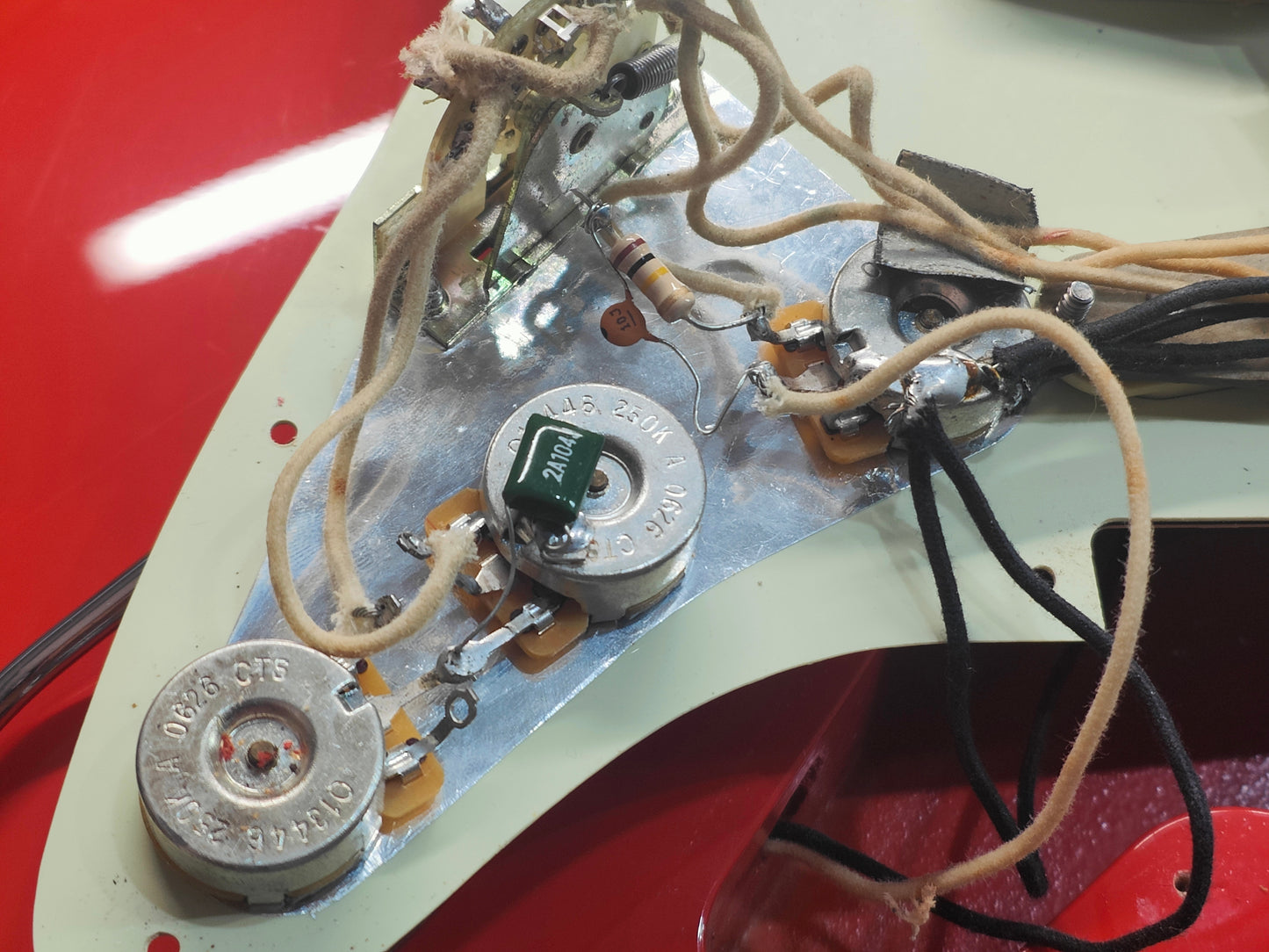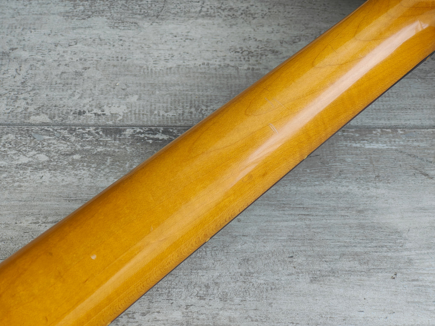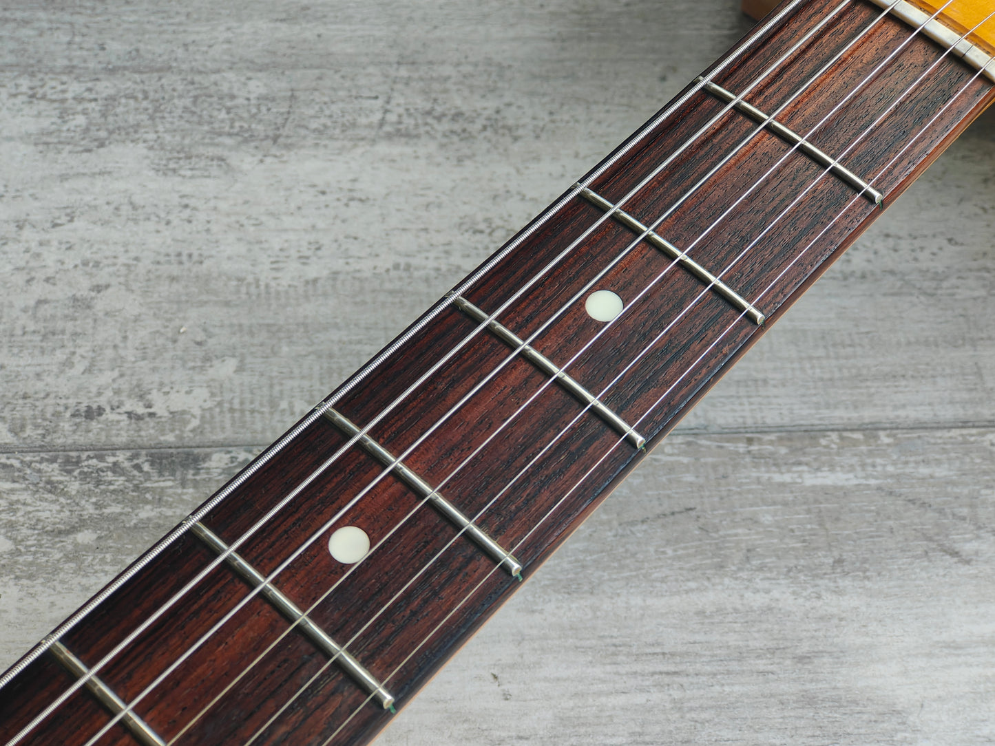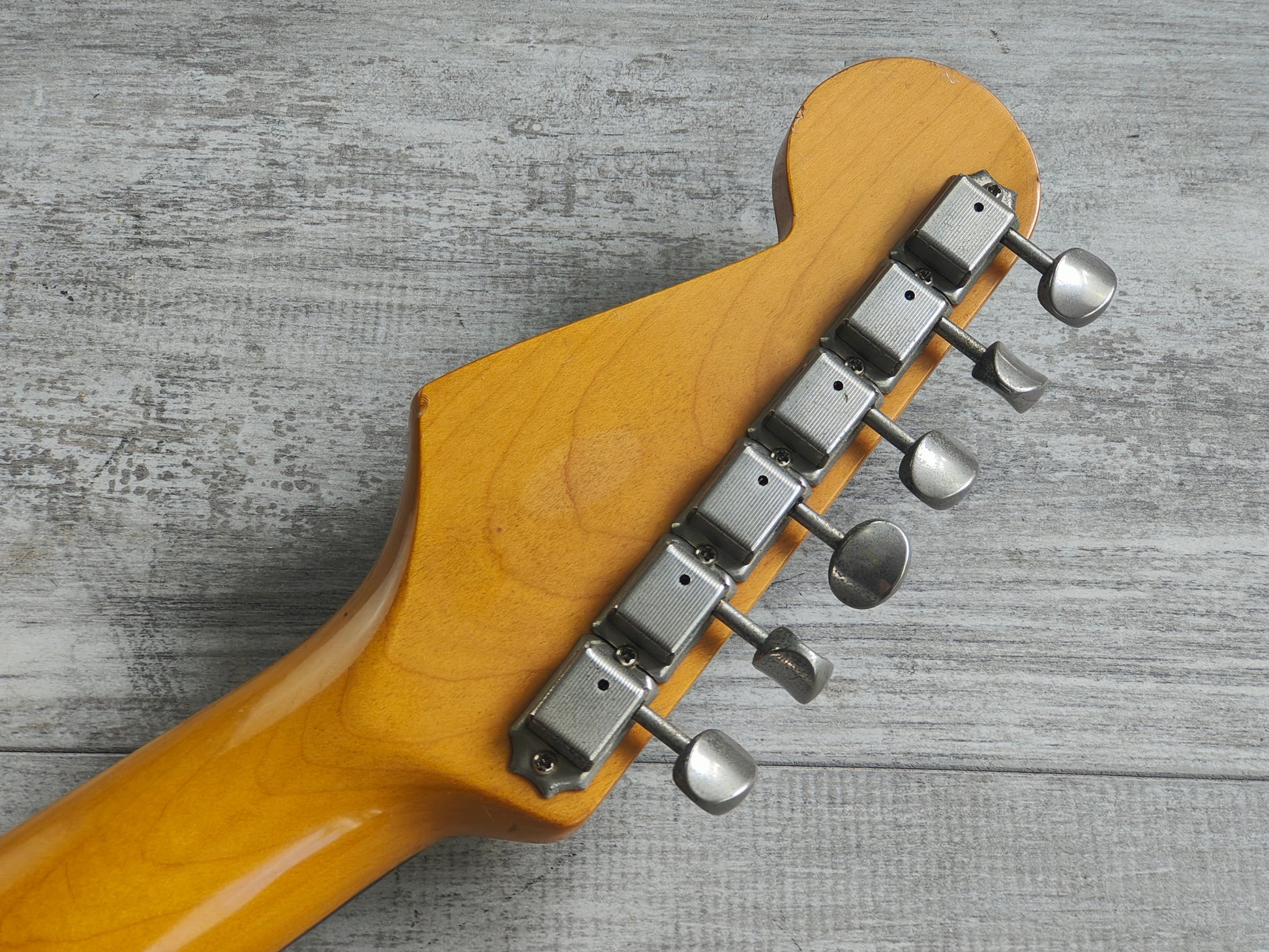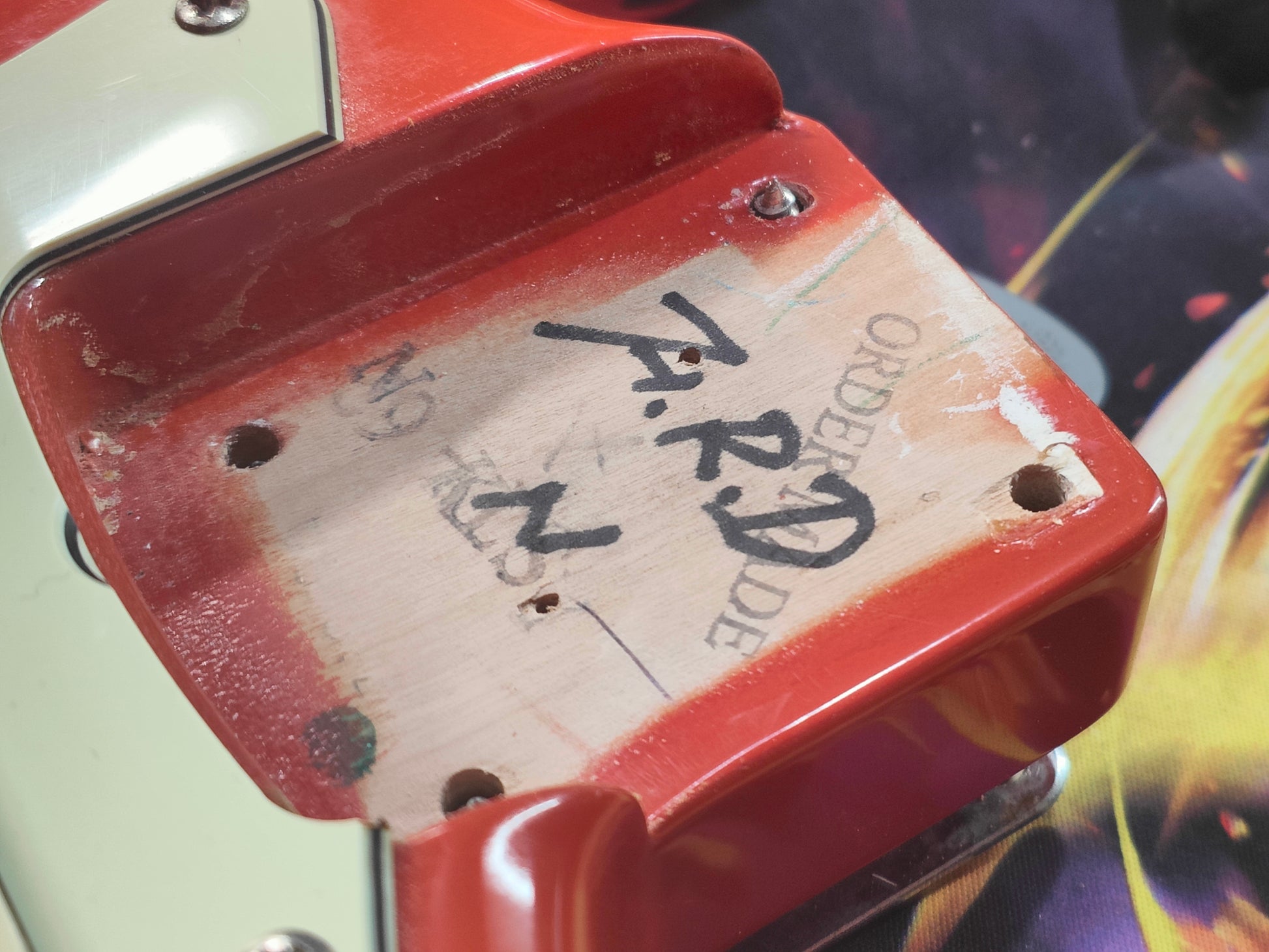 Made by the Fujigen factory in 1993, this was an Order Made model ST62 that was made specifically to a customer's specs. Solid alder body with a faded Fiesta Red finish bolted to a '62 profile maple neck and slab rosewood fingerboard (43mm nut width, 7.25" radius), it weighs 3.8kg's. Loaded with a what looks to be the original grey back Fender USA single coils (likely ordered by the customer) with CTS pots and cloth wiring along with the original Fender bridge with stamped saddles and vintage style tuners. The pickguard seems to have been swapped at some point otherwise it seems to be all original.