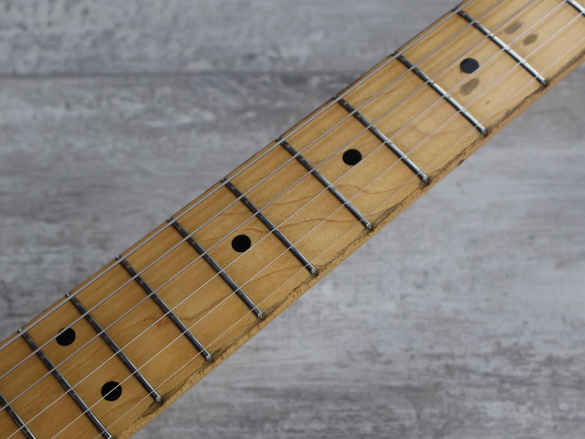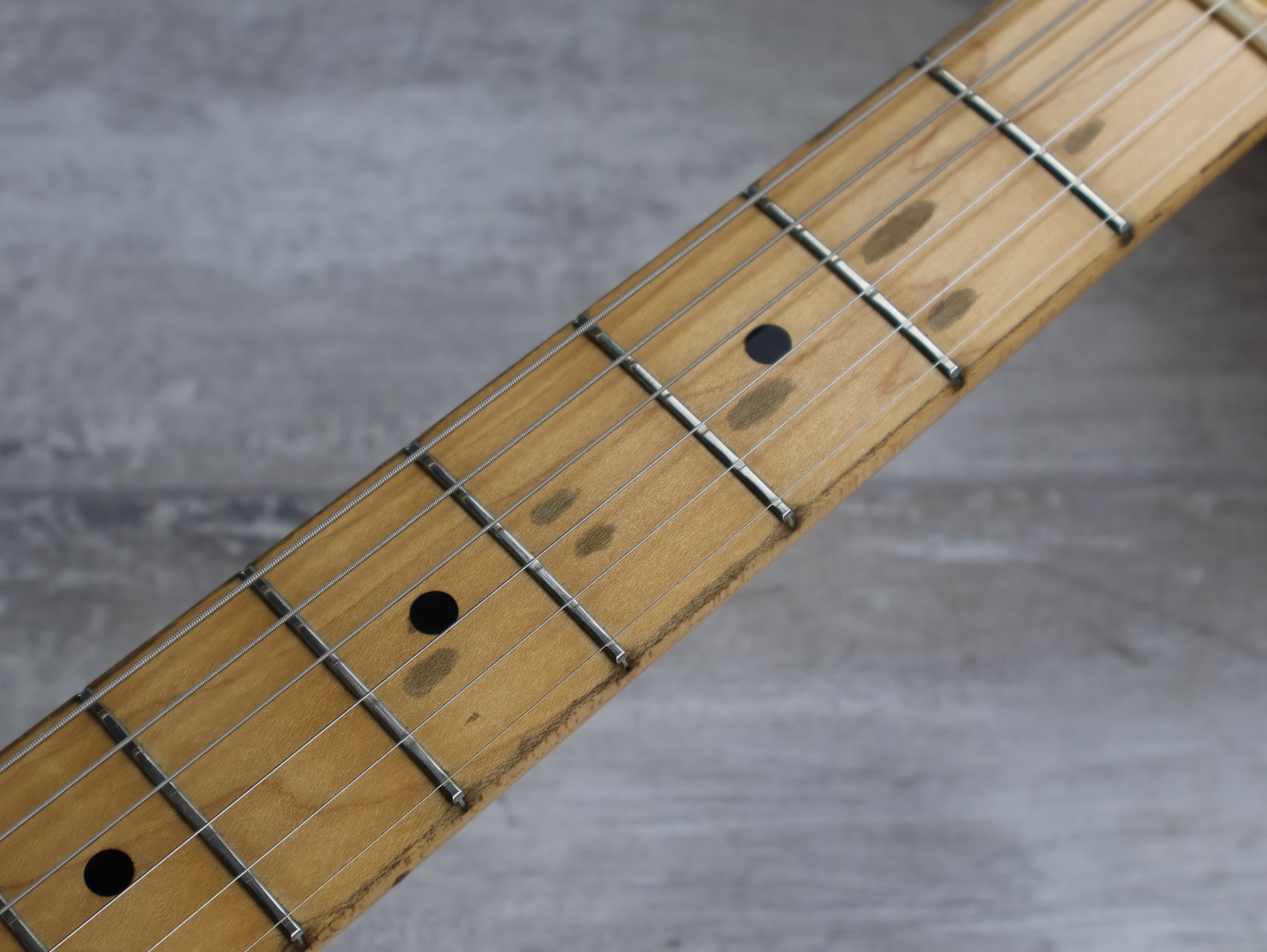 Restrung and given a basic setup and service prior to listing, this one has a pretty heavy amount of cosmetic wear as pictured including a sanded pickguard and some surface rust on the bridge. The neck is straight and the truss works as it should, the frets are shiny and smooth with some pitting but life left.