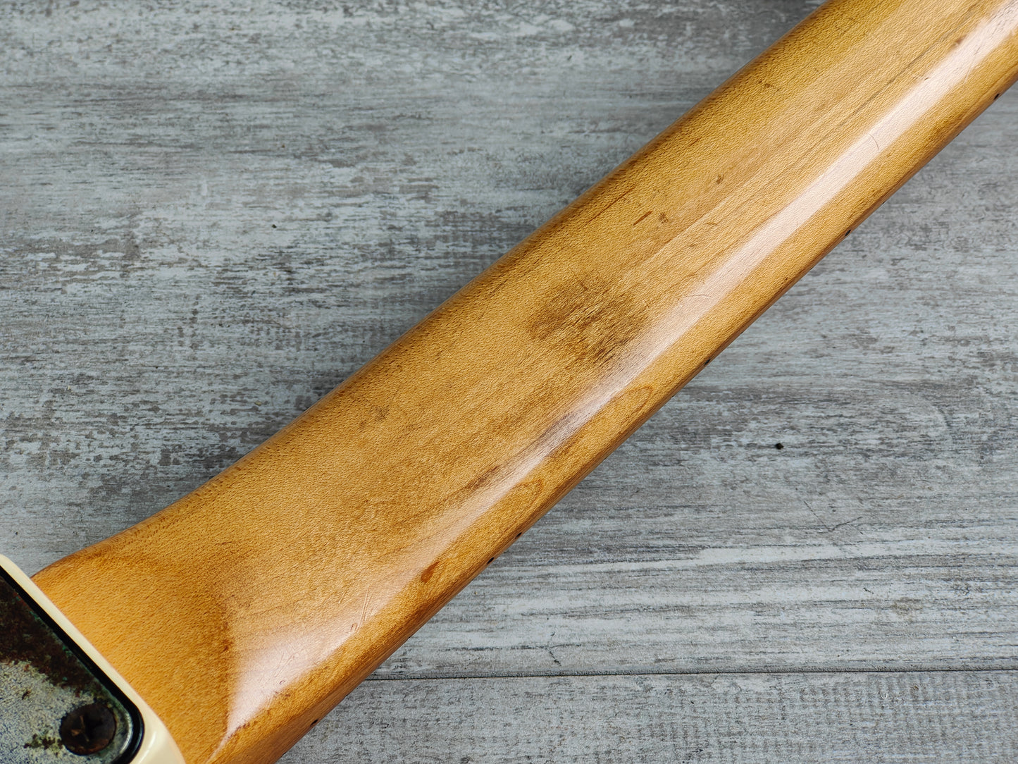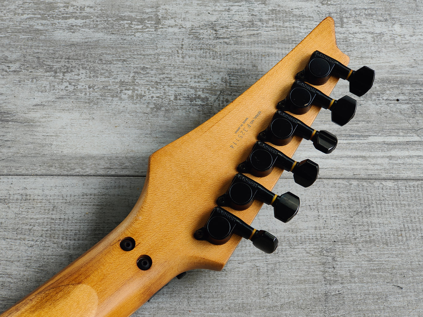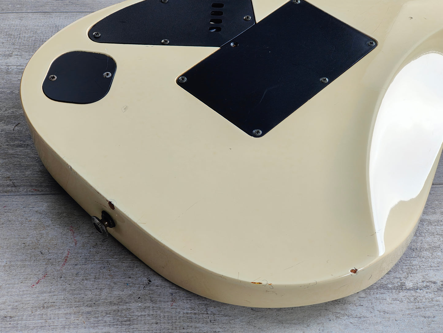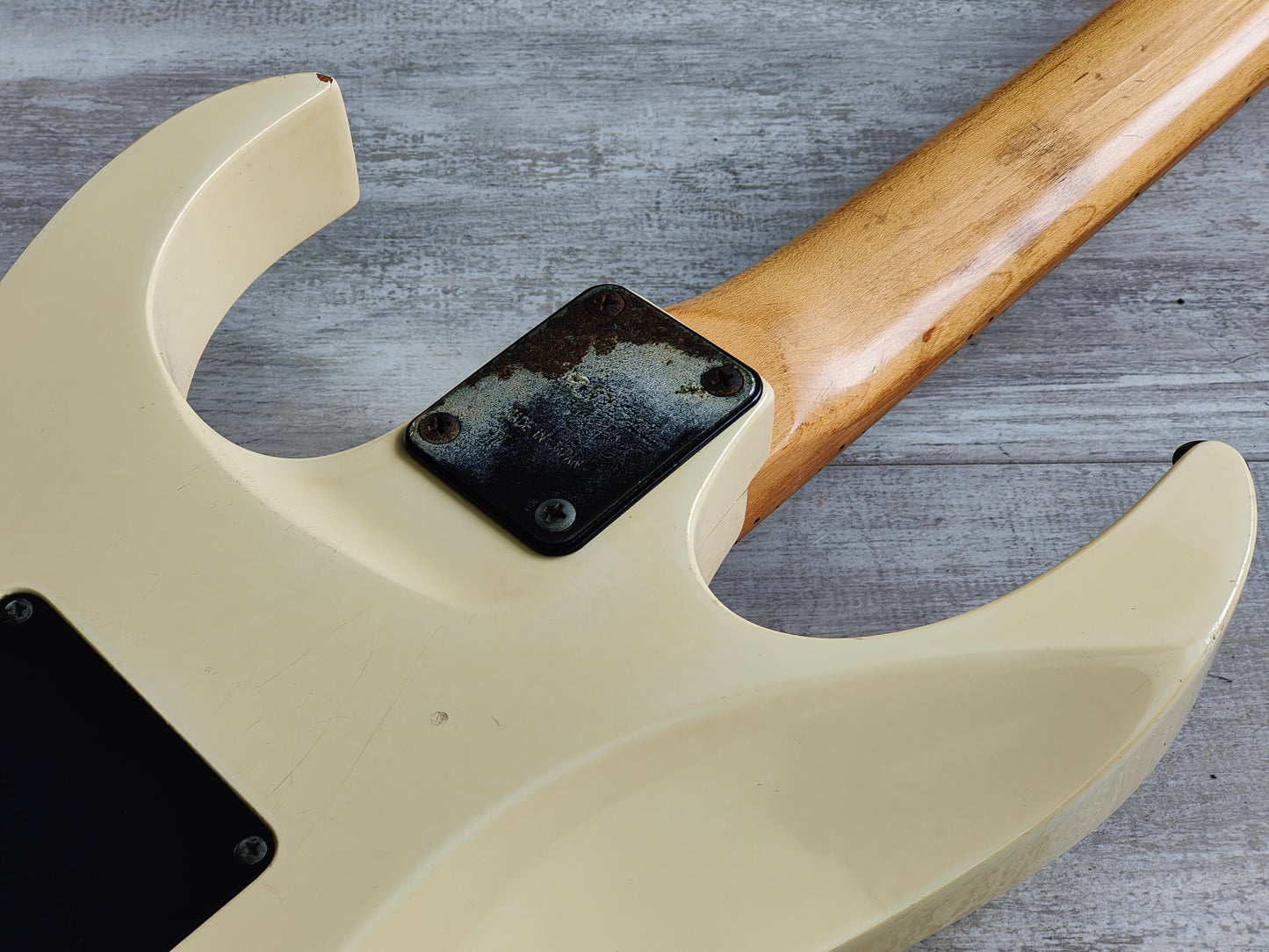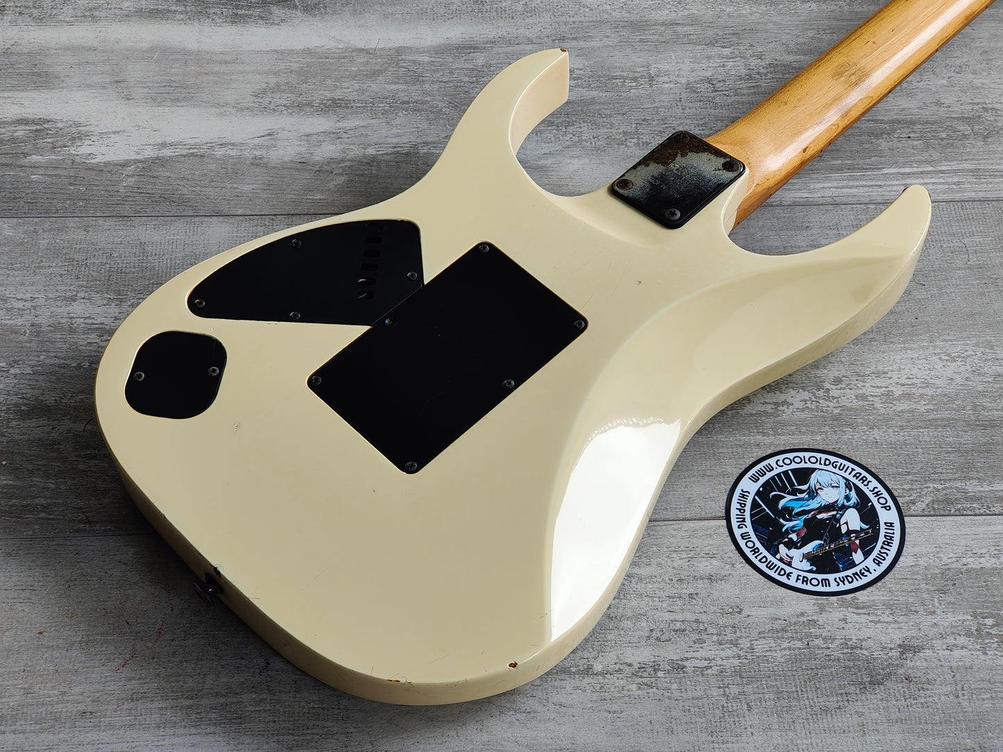 Made in Japan in 1993, this is one of the rare RG570 models to feature a maple fingerboard (as a vast majority were rosewood boards). The RG570M features a "Paul Gilbert" white aesthetic (without the silly F holes) on a basswood body bolted to a maple Wizard neck with a 24 fret maple fingerboard (648mm scale length, 43.5mm nut width) and weighs 3.4kg's. Loaded with a set of aftermarket pickups (Dimarzio DP158/9 Evolution Humbuckers and an unknown middle single coil) along with what appears to be the original pots and 5-way selector.