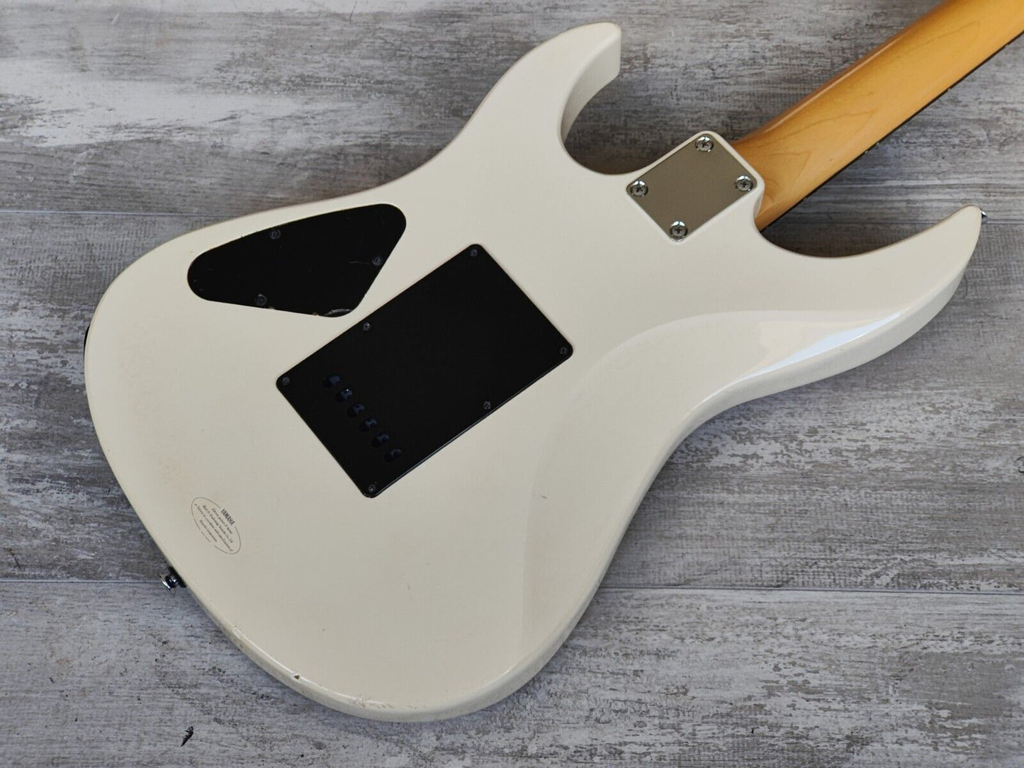 Made between 1991-1994, the Yamaha YGX-121FP model features the "Free Art Pickguard" (also found on the RGX models) that is essentially a clear plastic pickguard covering the whole body and a choice of 4 designs to go under the guard (this one has two included) or you can make your own! Alder body with a vintage white finish bolted to a maple neck and 22 fret bubinga fingerboard, it weighs 3.8kg's.
