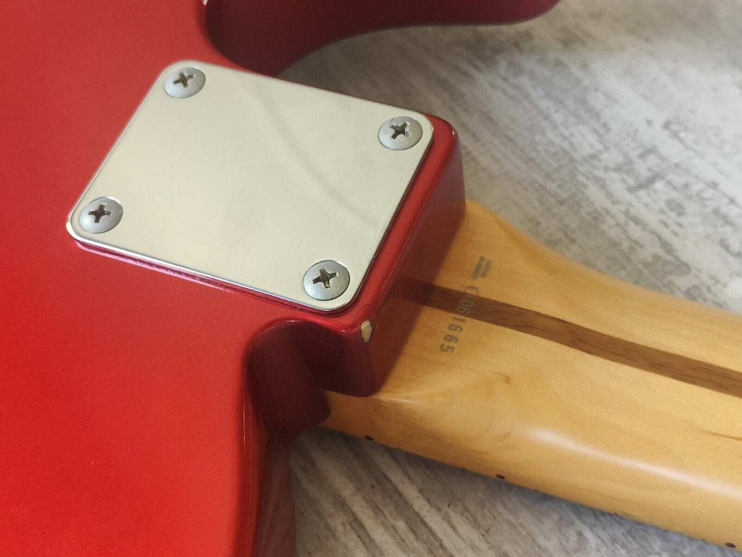 Made by the Fujigen factory in 1994, this Fender TL-STD was the Japanese version of a American Standard. 21 frets on a maple neck with a basswood body that wears a Candy Apple Red finish, it weighs 3.4kg's. Fender Japan pickups with Gotoh tuners and a toploader bridge.