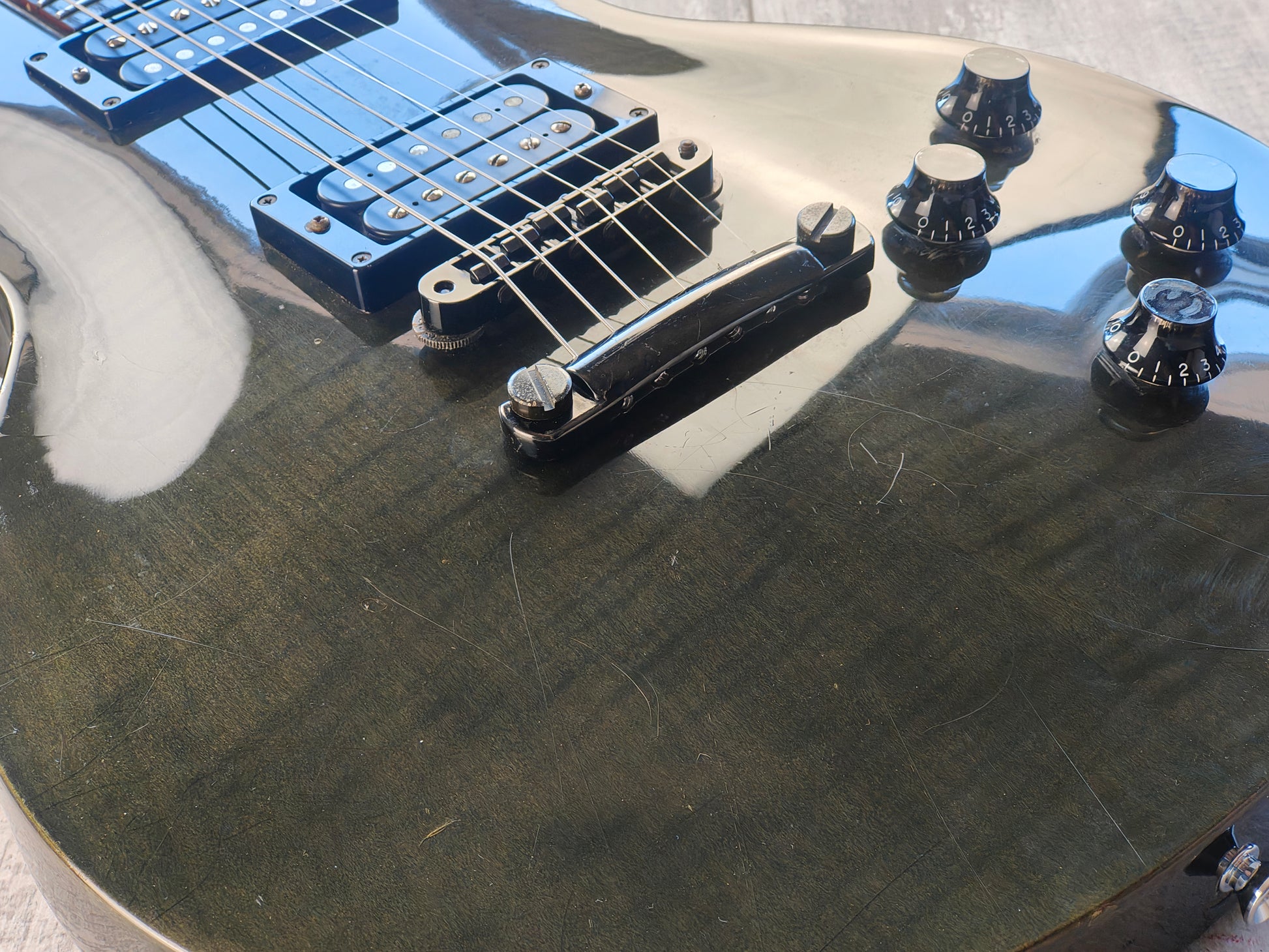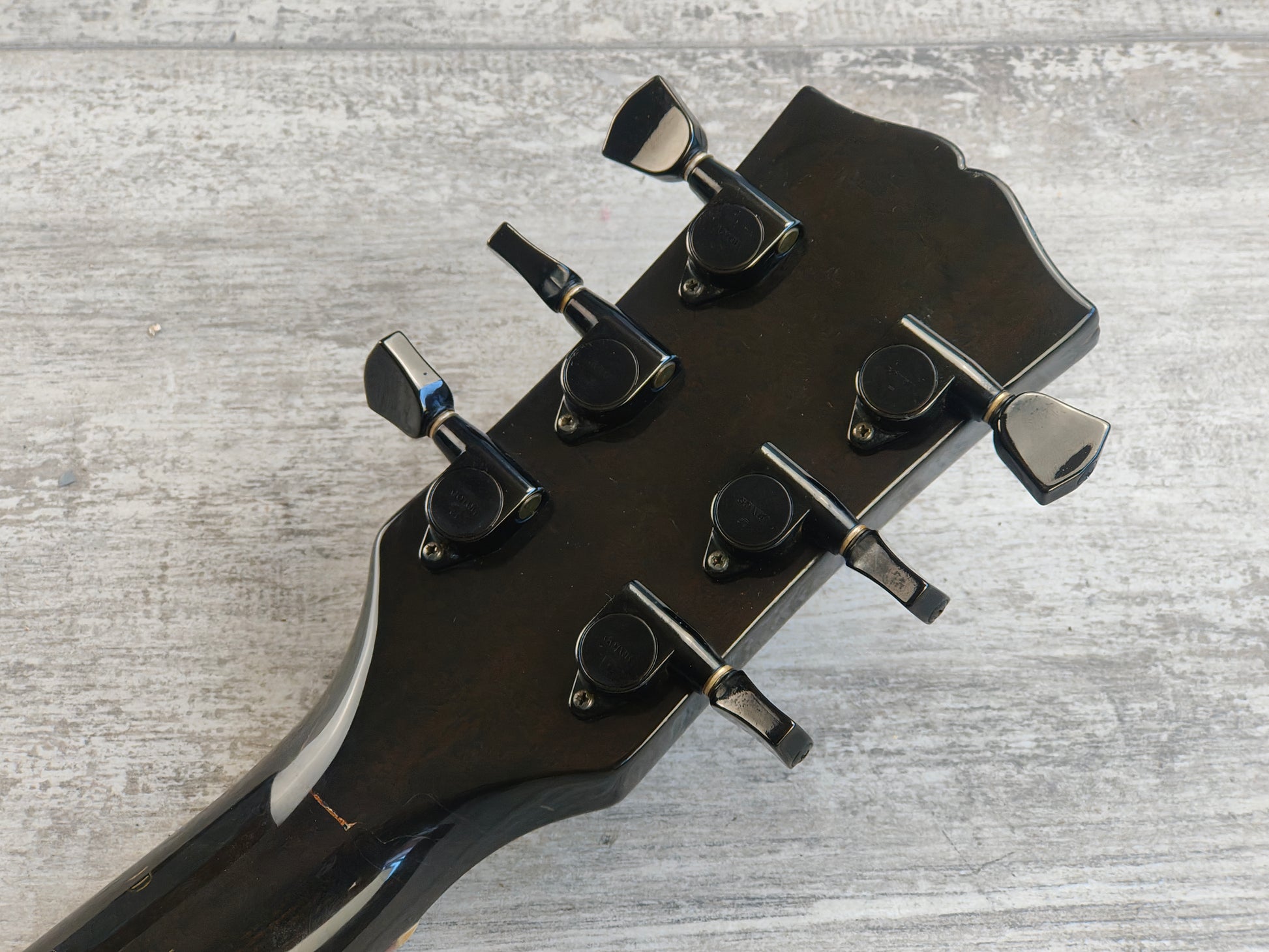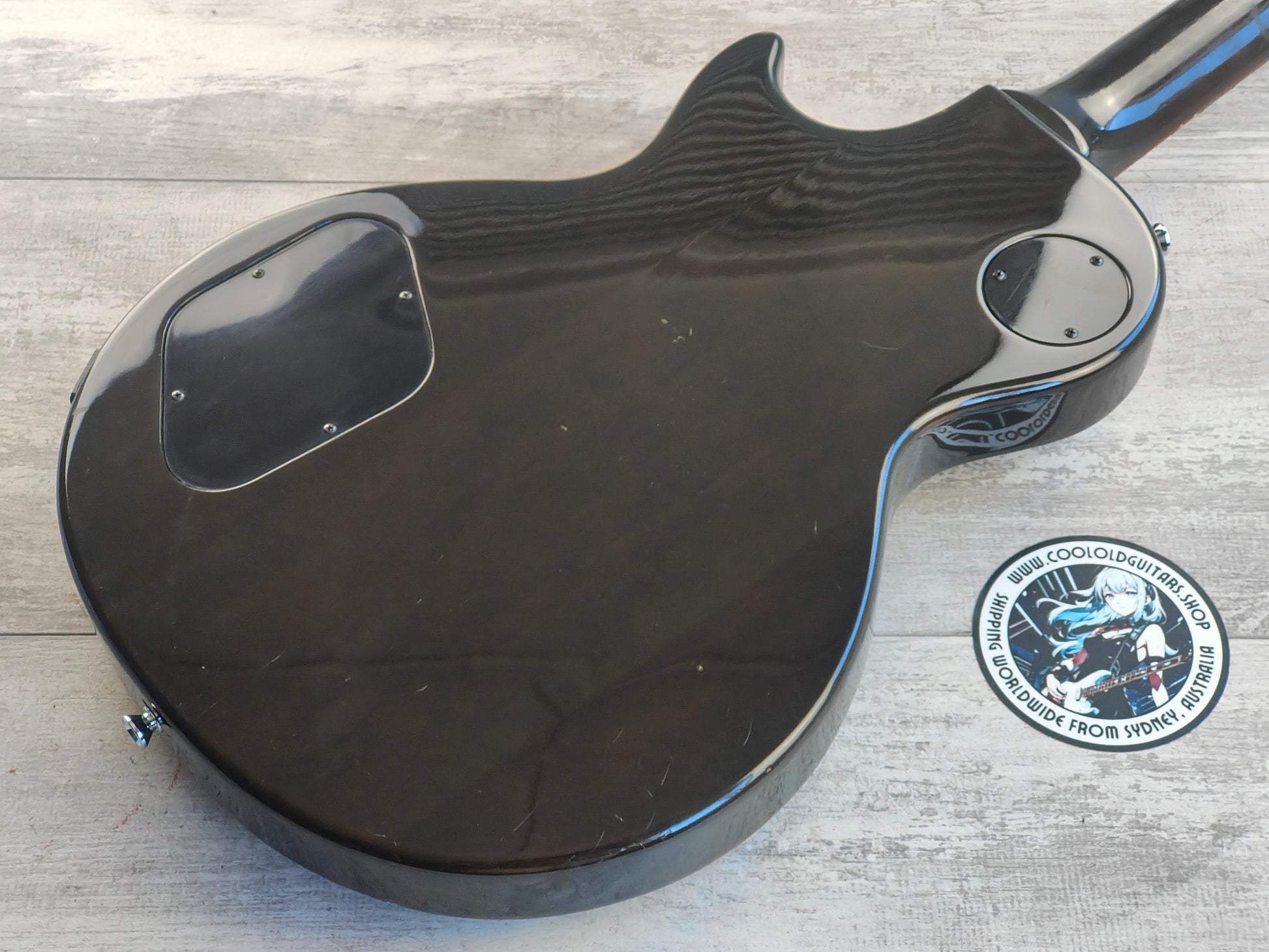 Made in Japan in 1995, the LG-75JP was Burny's "unofficial" Joe Perry signature model that was sold primarily to the domestic market (just after Aerosmiths 1994 tour of Japan). Transparent black maple top with a light flame aesthetic, mahogany back and neck, rosewood fingerboard, weighs 3.6kg's.