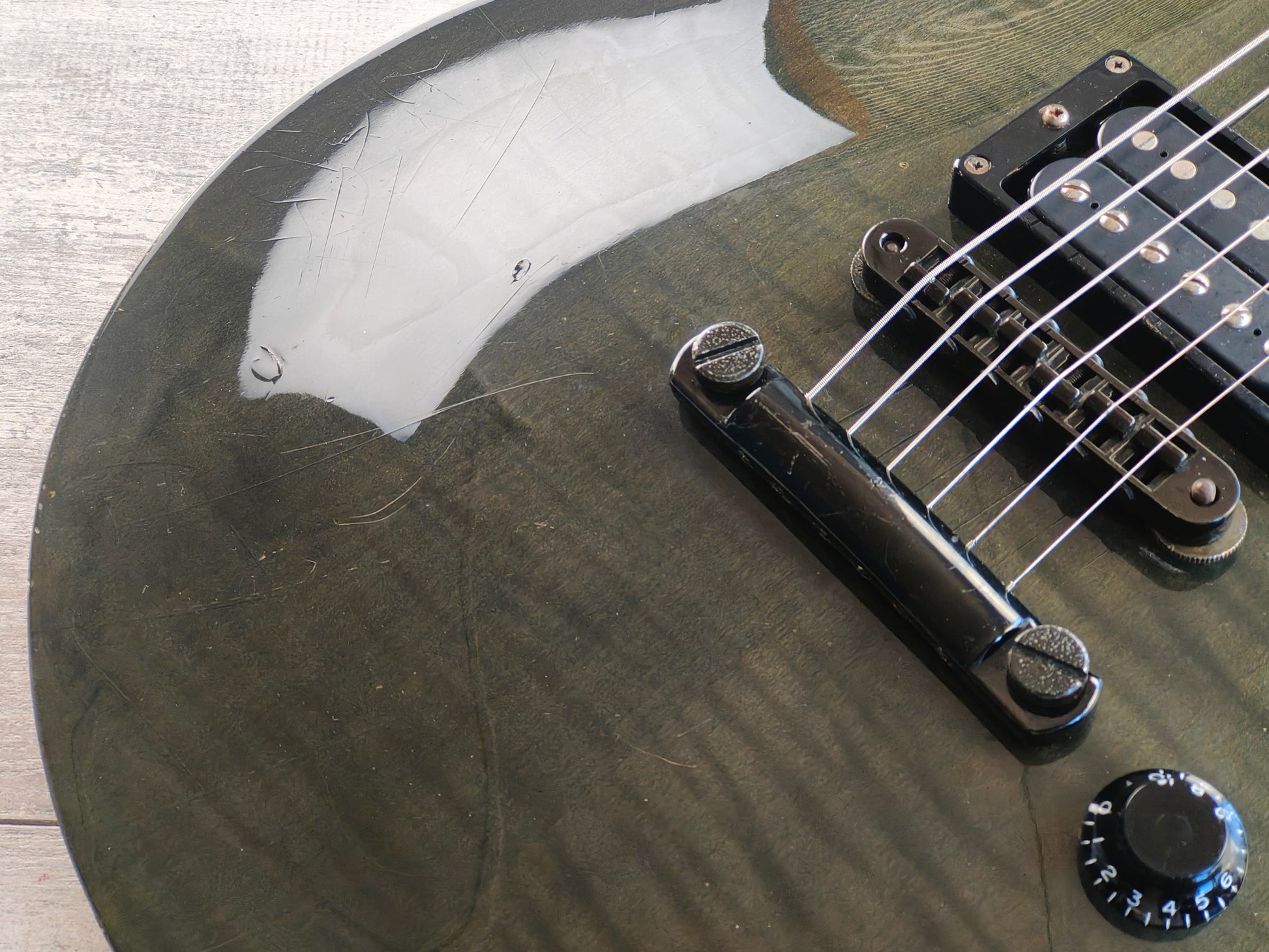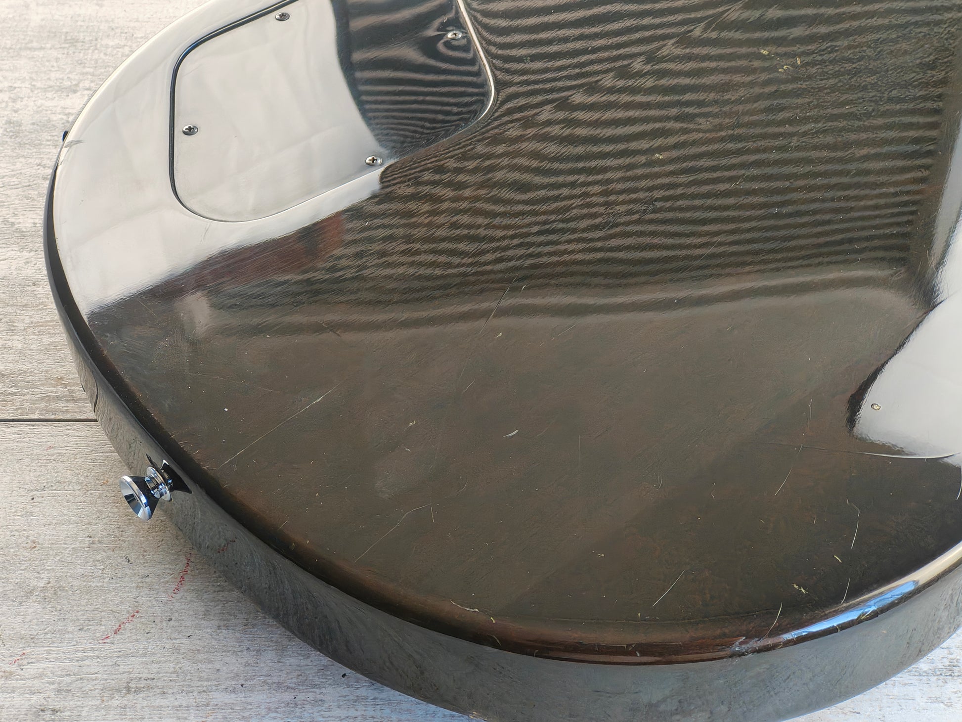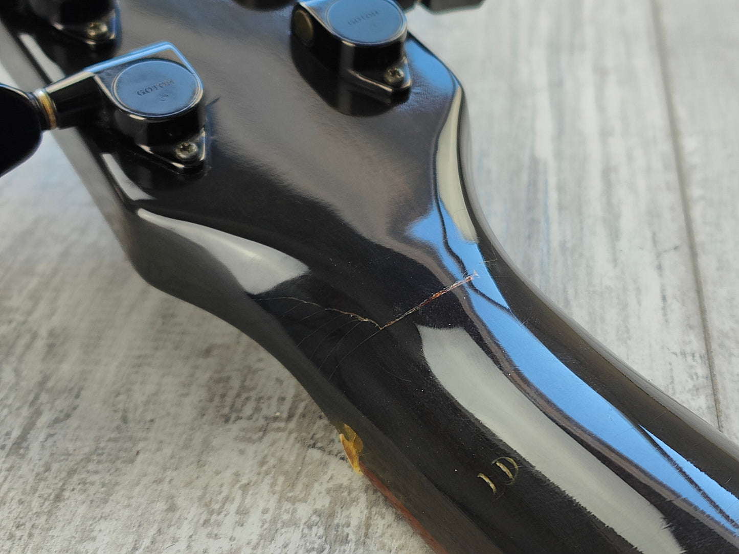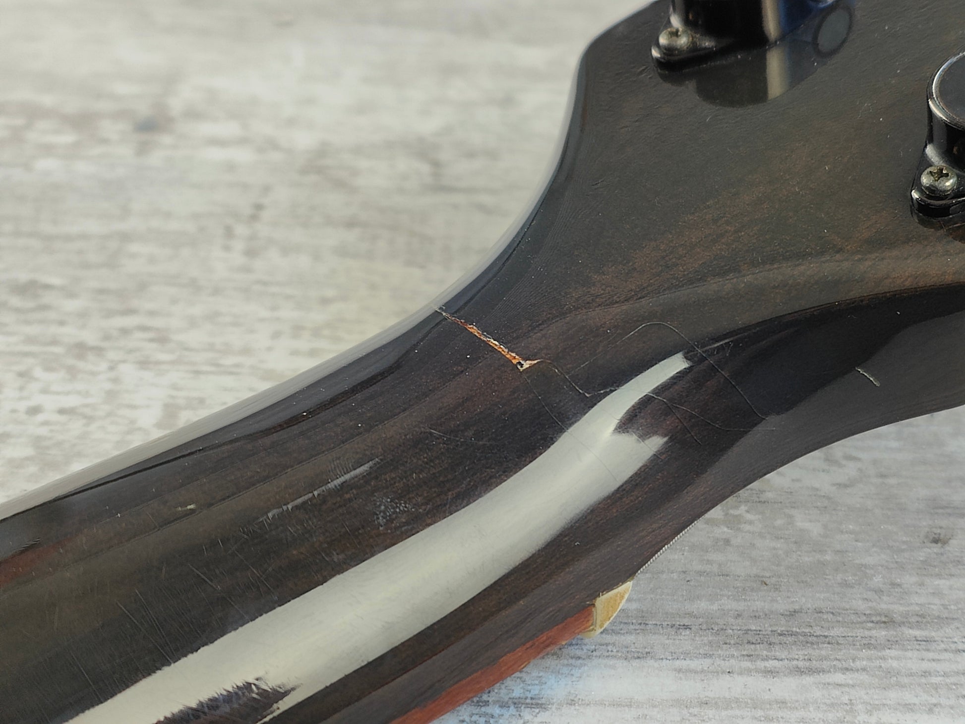 Good used condition with plenty of cosmetic dings here and there as pictured. Received a professional setup prior to listing, frets were polished and the fretboard was oiled. Light pitting to the frets but plenty of life left. The headstock has a very light repair done by us in-house with some glue injected into the crack before the area was clamped until solid. The impacted area was then lightly buffed so it's smooth to touch and undetectable in the hand.