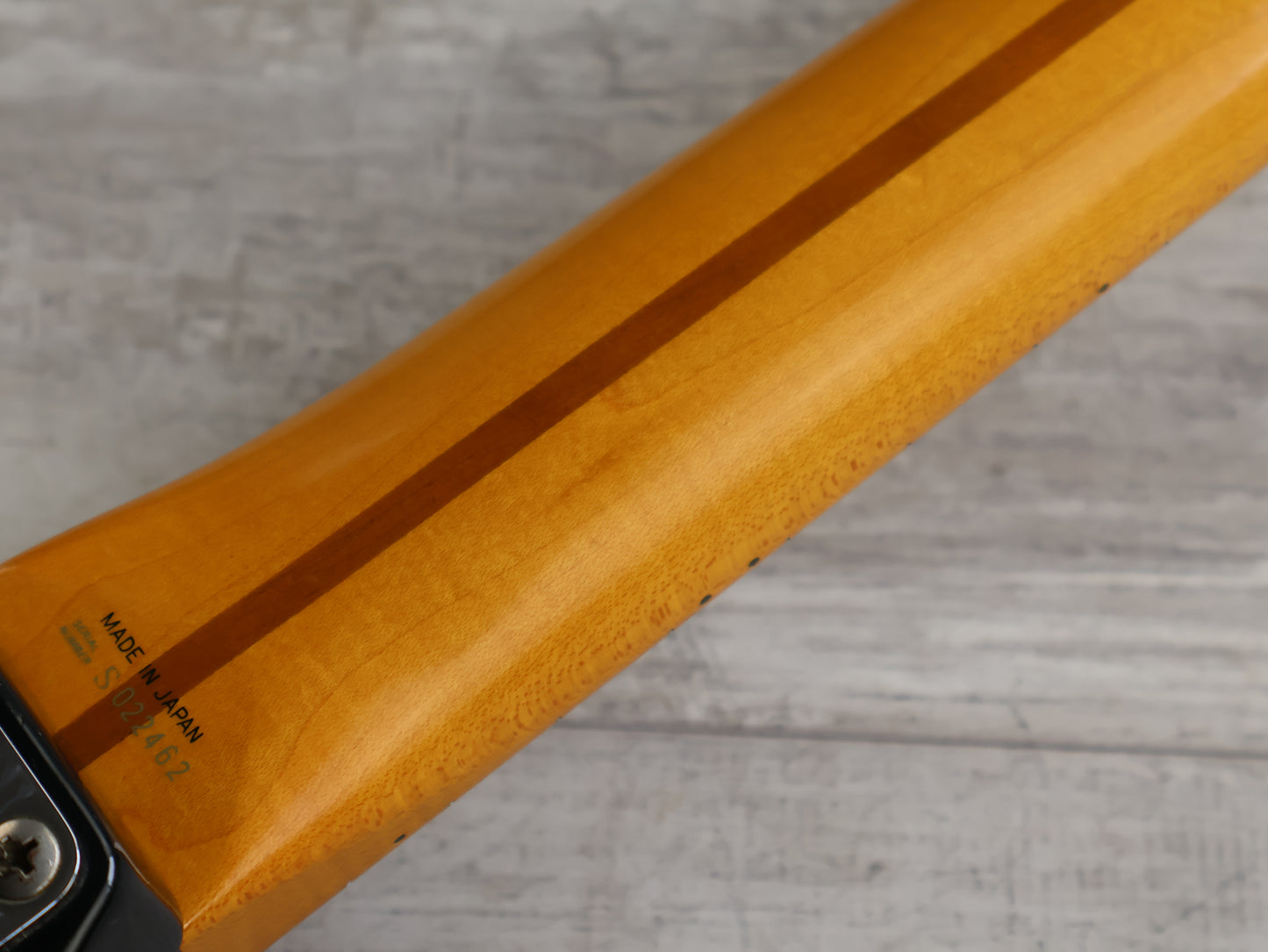 Loaded with Fender Japan single coil pickups, this one appears to be all original except for maybe a replacement pickguard as this one's got a tan tinge to it.