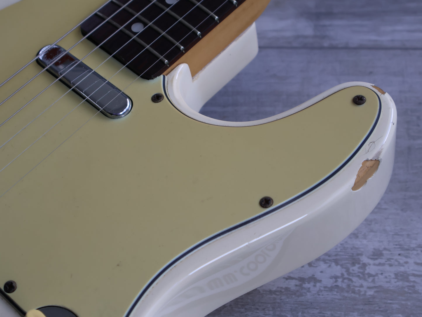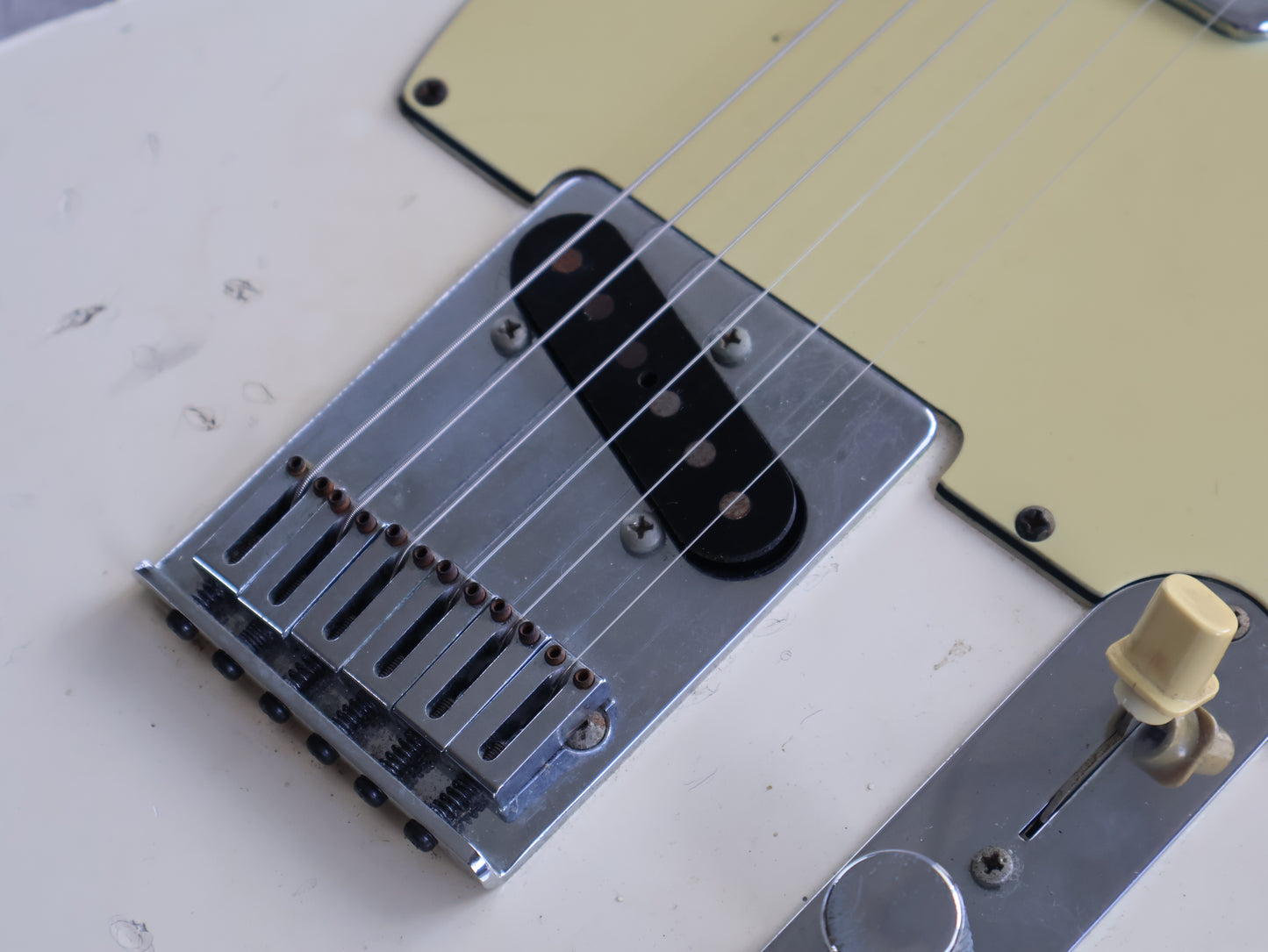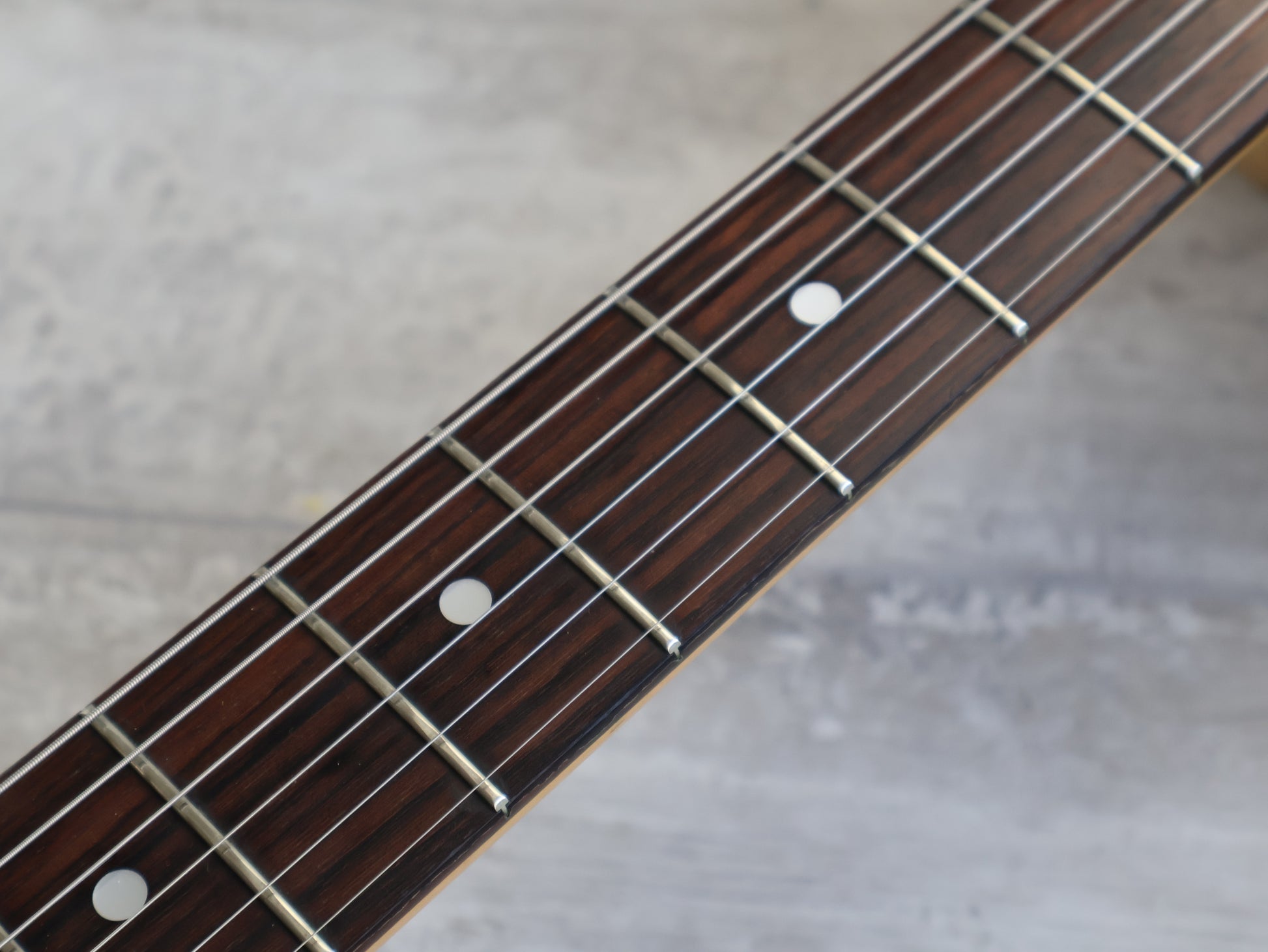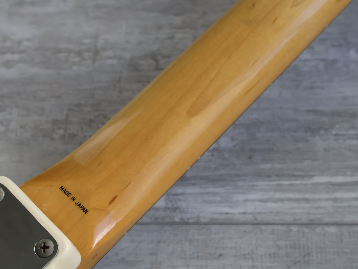Made by the Fujigen factory in 1995, this TL72 was a custom order version of the regular '72 model Telecaster (rather than the more famous Thinline or Custom models from that era). This one wears a well aged "Olympic White" finish on a basswood body bolted to an oval profile maple neck and rosewood fingerboard (7.25" radius, 21 frets), it weighs 3.7kg's.