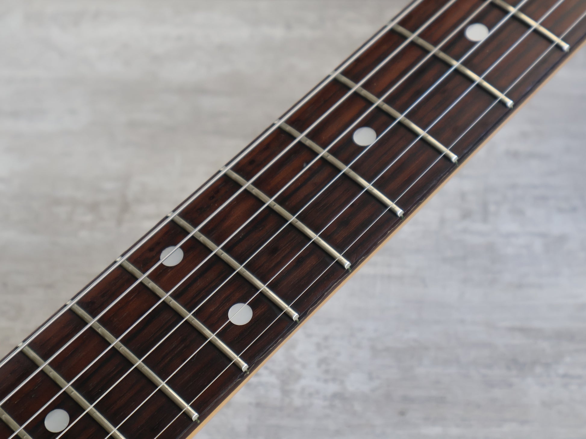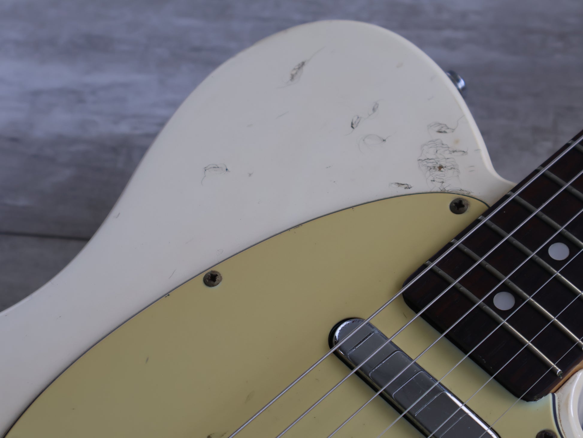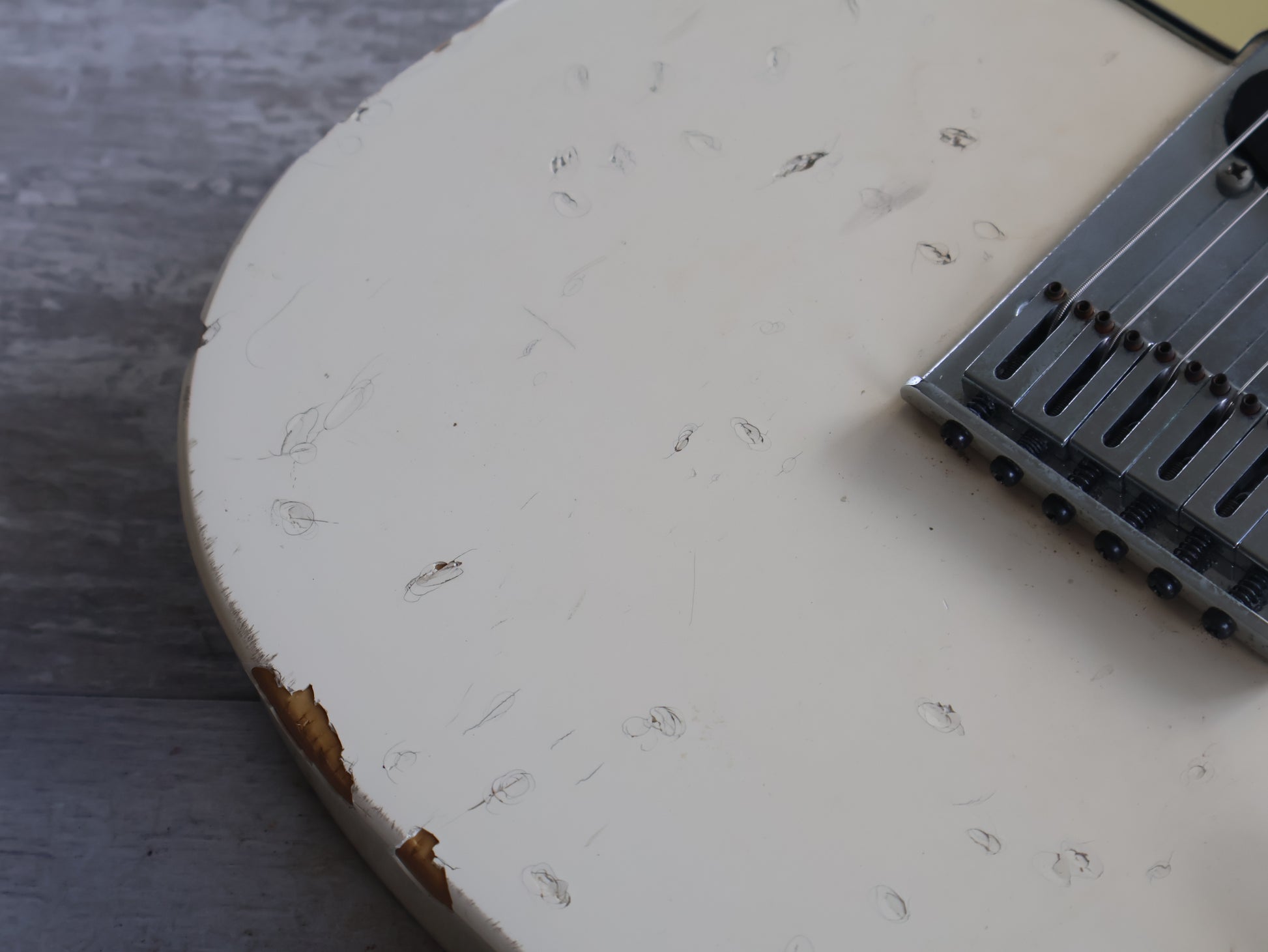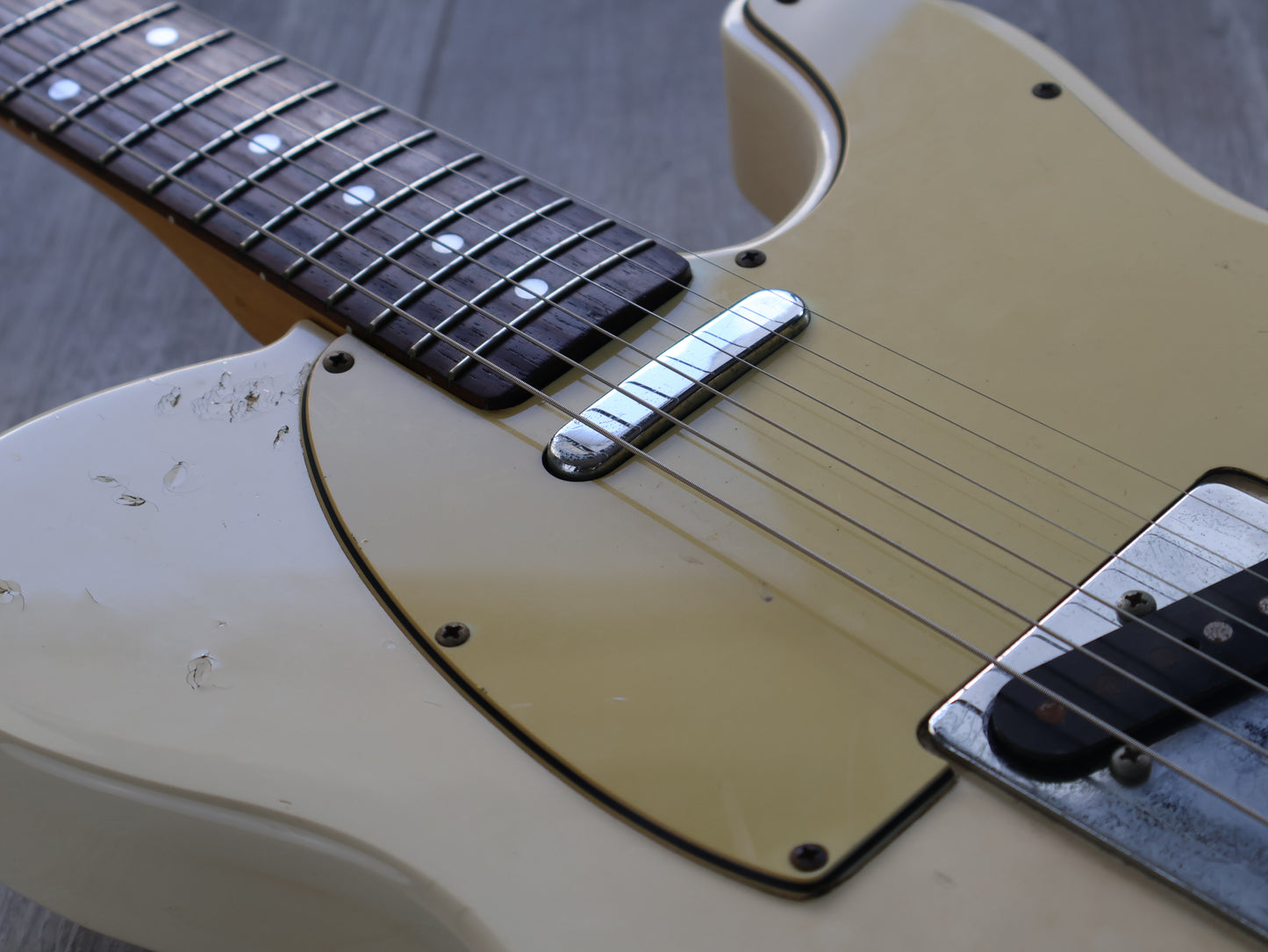 Made by the Fujigen factory in 1995, this TL72 was a custom order version of the regular '72 model Telecaster (rather than the more famous Thinline or Custom models from that era). This one wears a well aged "Olympic White" finish on a basswood body bolted to an oval profile maple neck and rosewood fingerboard (7.25" radius, 21 frets), it weighs 3.7kg's.