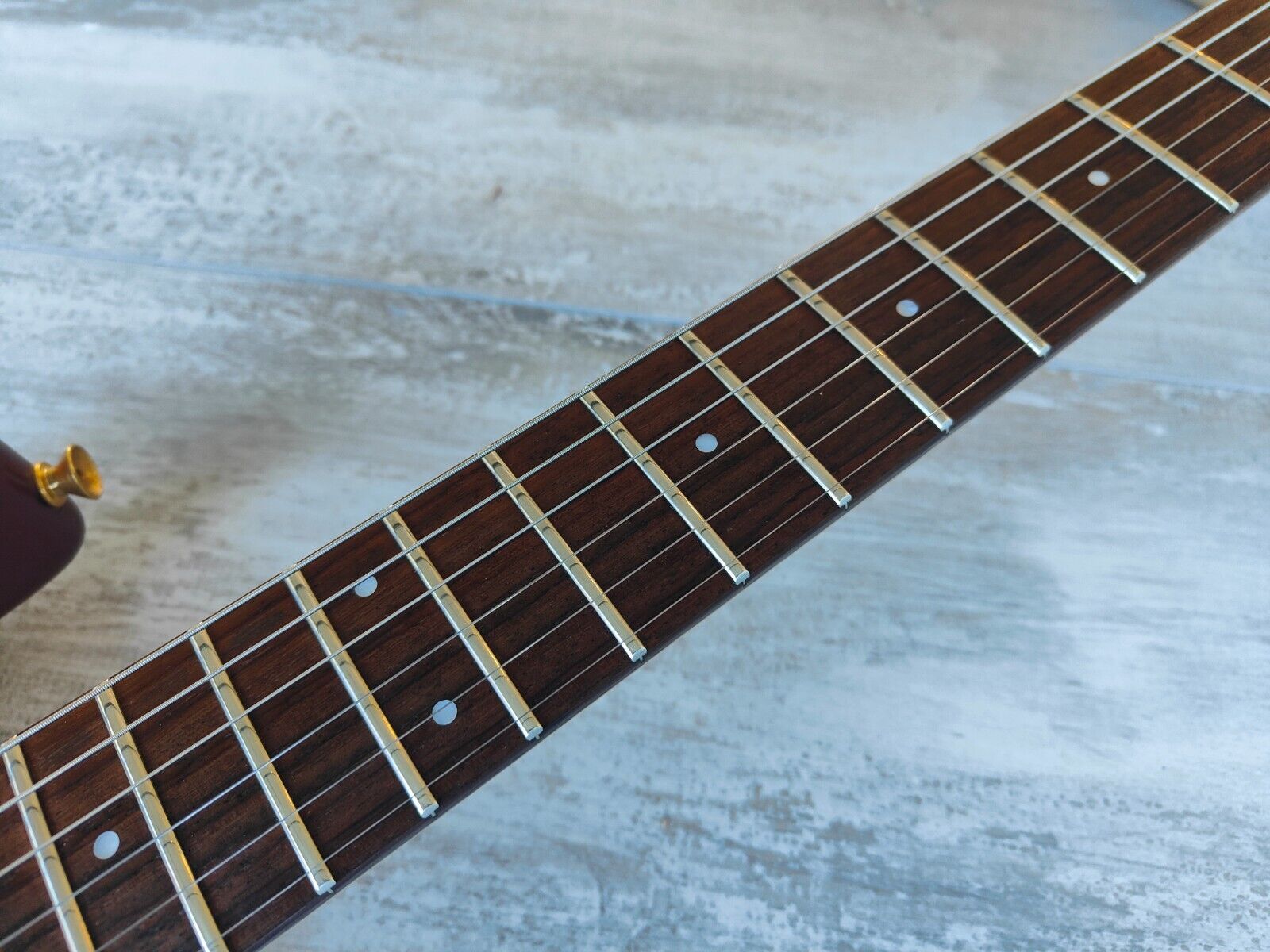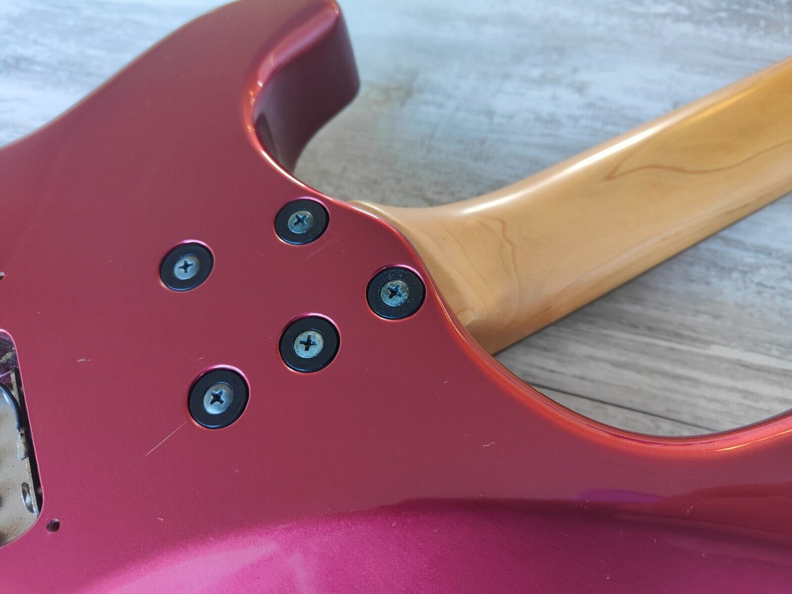 It appears to be all original except for a new battery clip, was given a full professional setup and service prior to listing. Neck is straight and plays well with a smooth action, frets were polished and have plenty of life with some light play wear. Metallic red finish has faded to a pink-ish tinge.