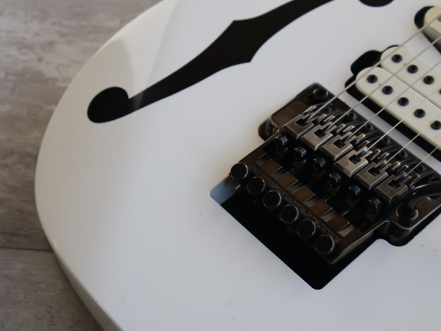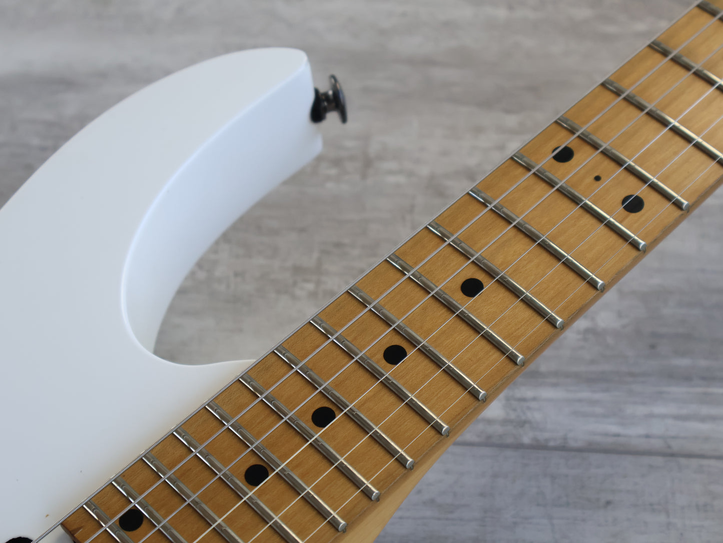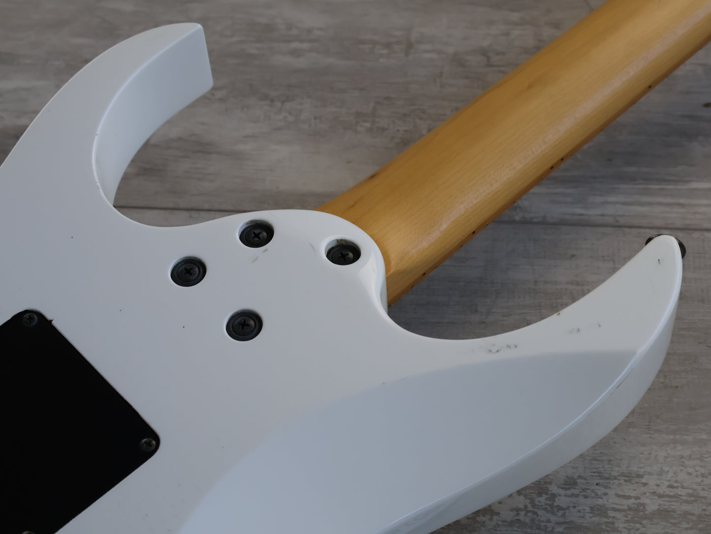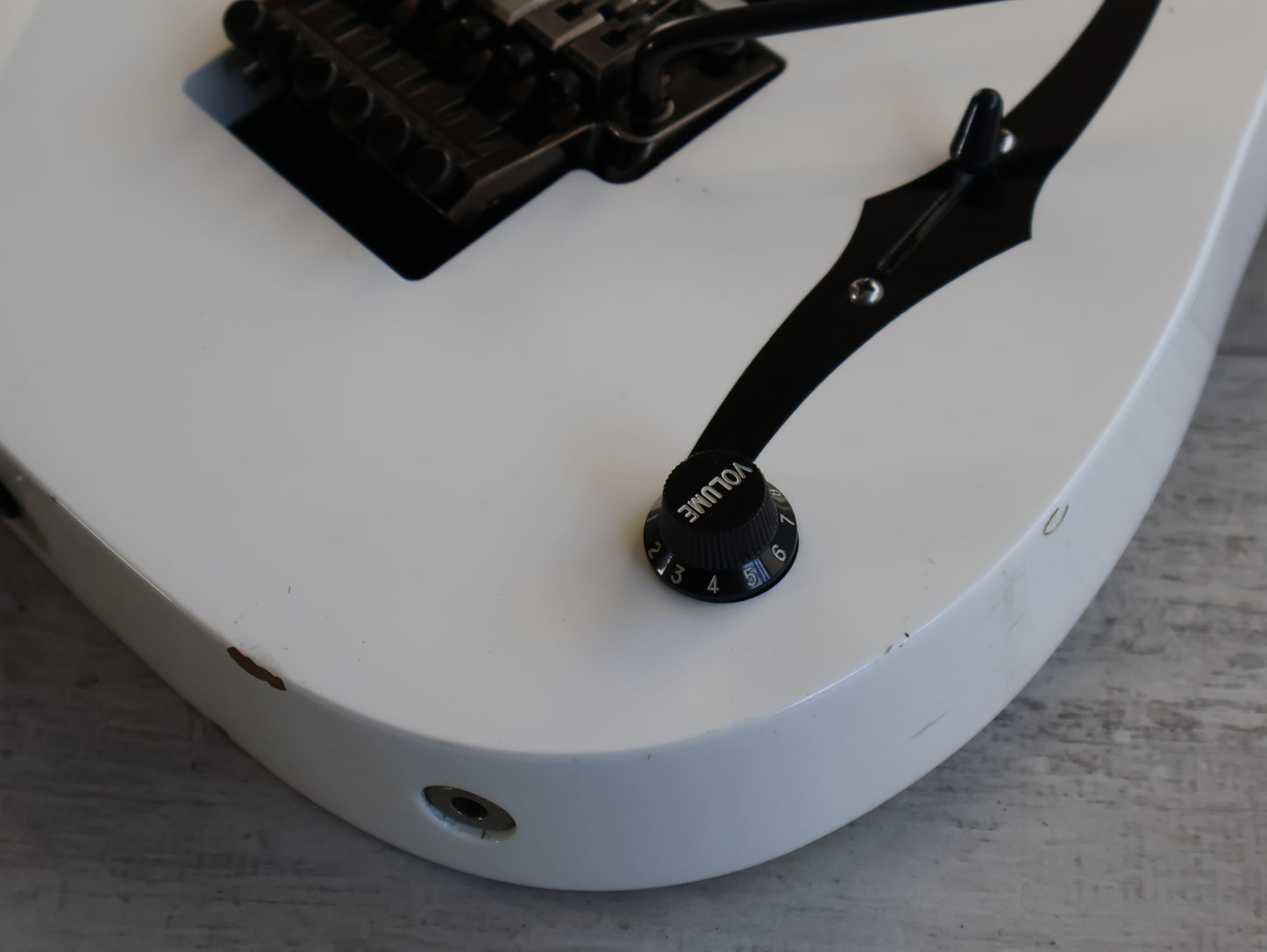 Paul Gilbert's longest running signature model, the PGM300 was made by the Fujigen factory from 1991 until 2004. This is a 1995 build with the classic aged white finish on a solid basswood body bolted to a Wizard profile maple neck with a 24 fret fingerboard (jumbo nickel frets, 44mm nut width, 648mm scale length), weighs 3.7kg's.