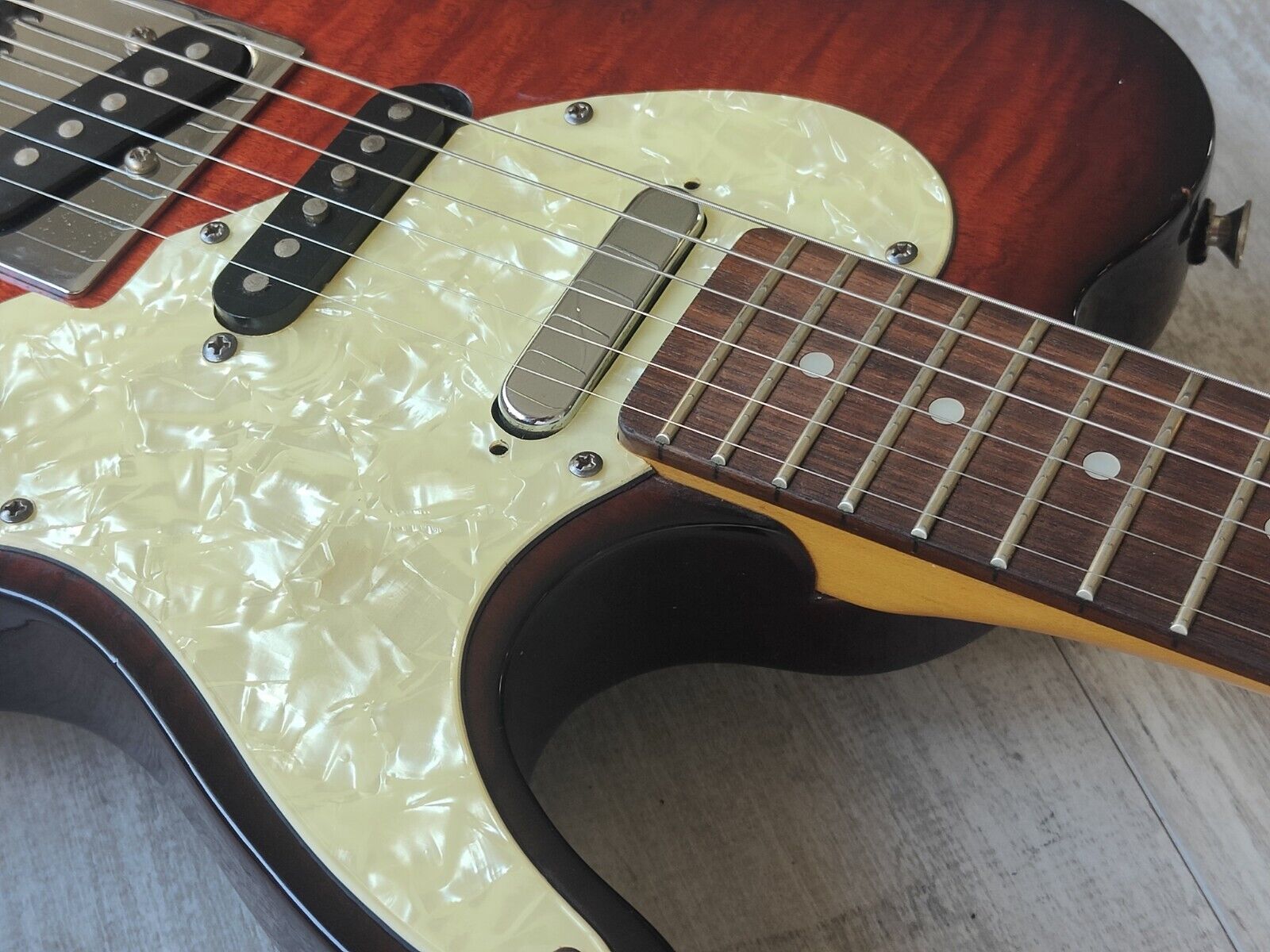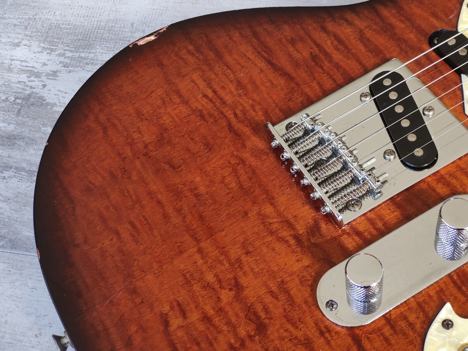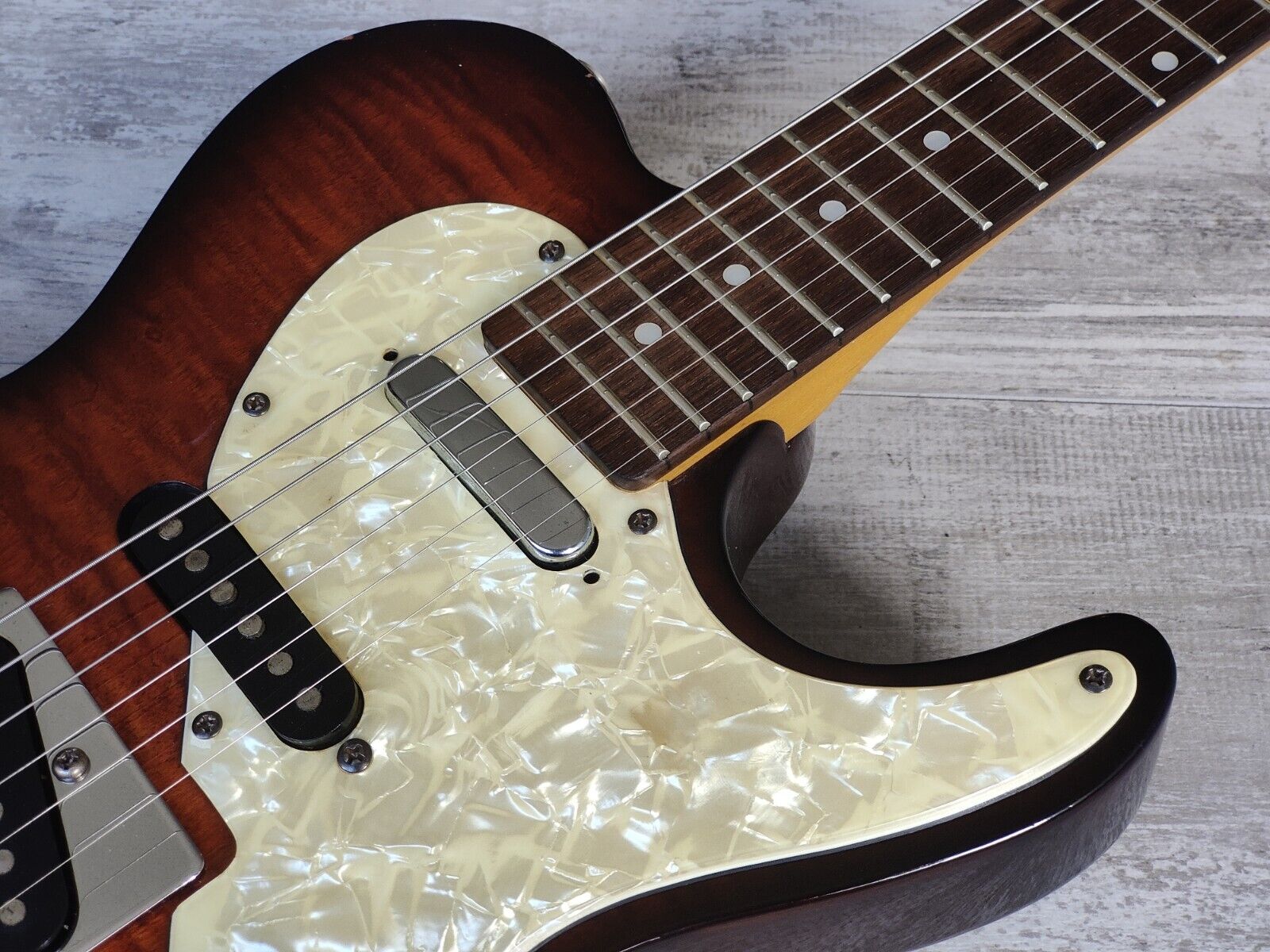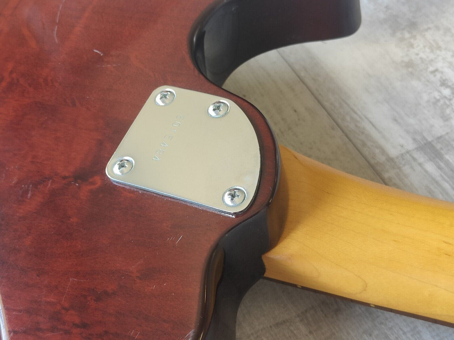 Made by Aria Pro II in the mid 1990's, the 615 model (named after the area code for Nashville) was a unique hybrid that's somewhere between a Nashville telecaster and a Les Paul Special. Looks to be an alder body with a figured top, maple neck with a 22 fret rosewood fingerboard (648mm scale length), it weighs 3.6kg's. Nashville style pickup loadout with a 5-way selector, master volume/tone knobs and a mini toggle to turn the neck pickup on/off.