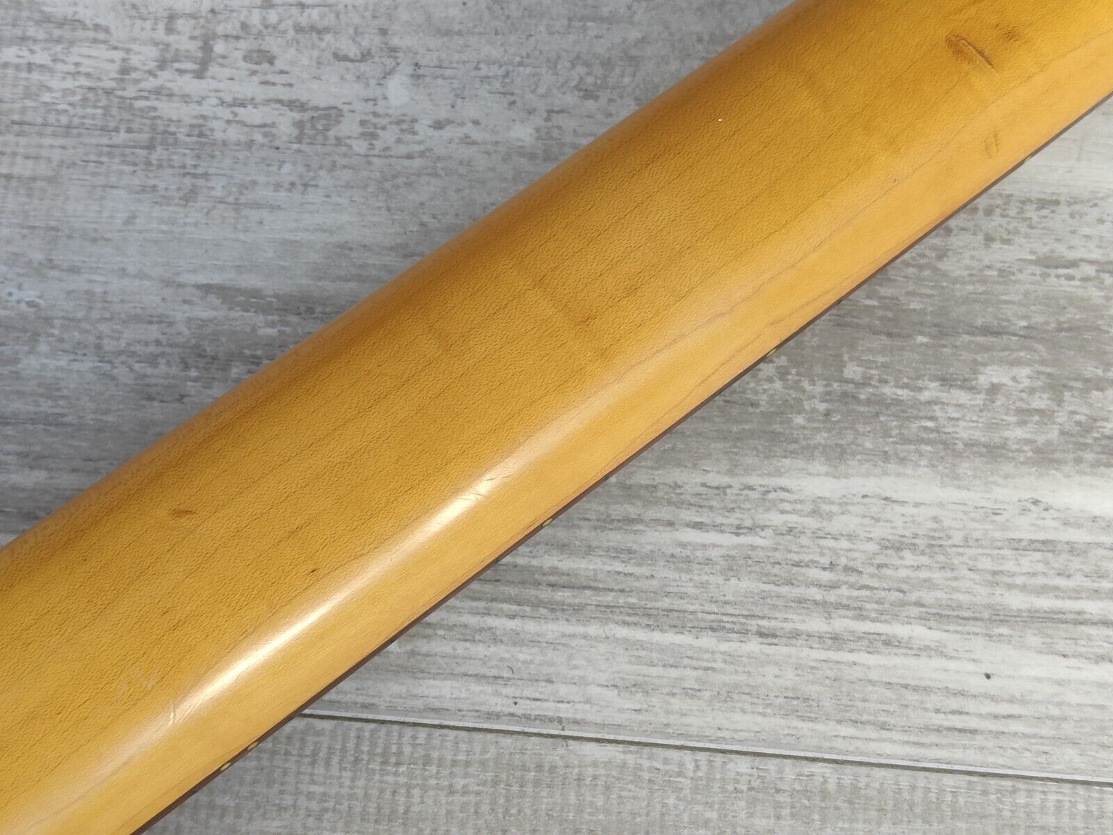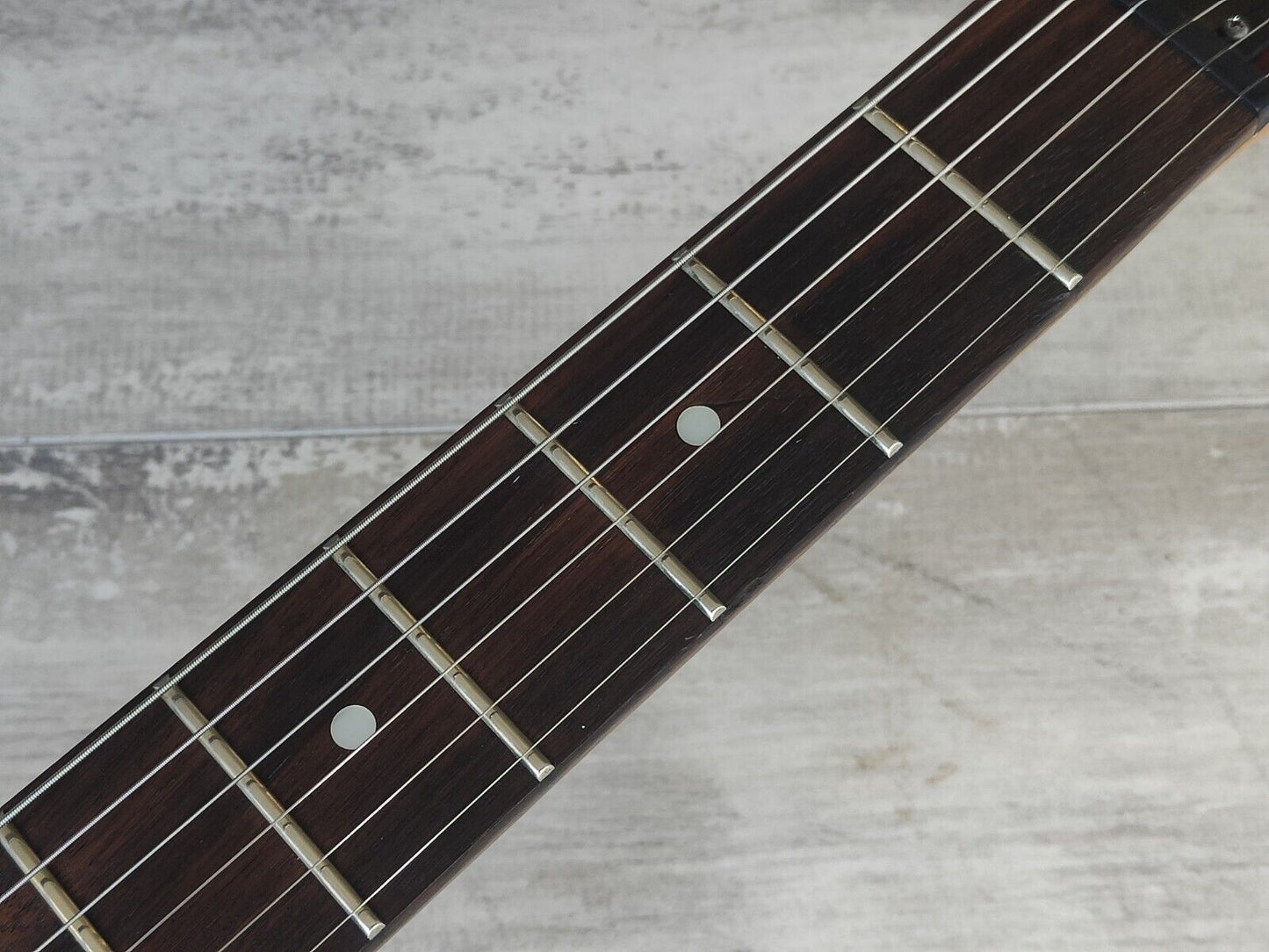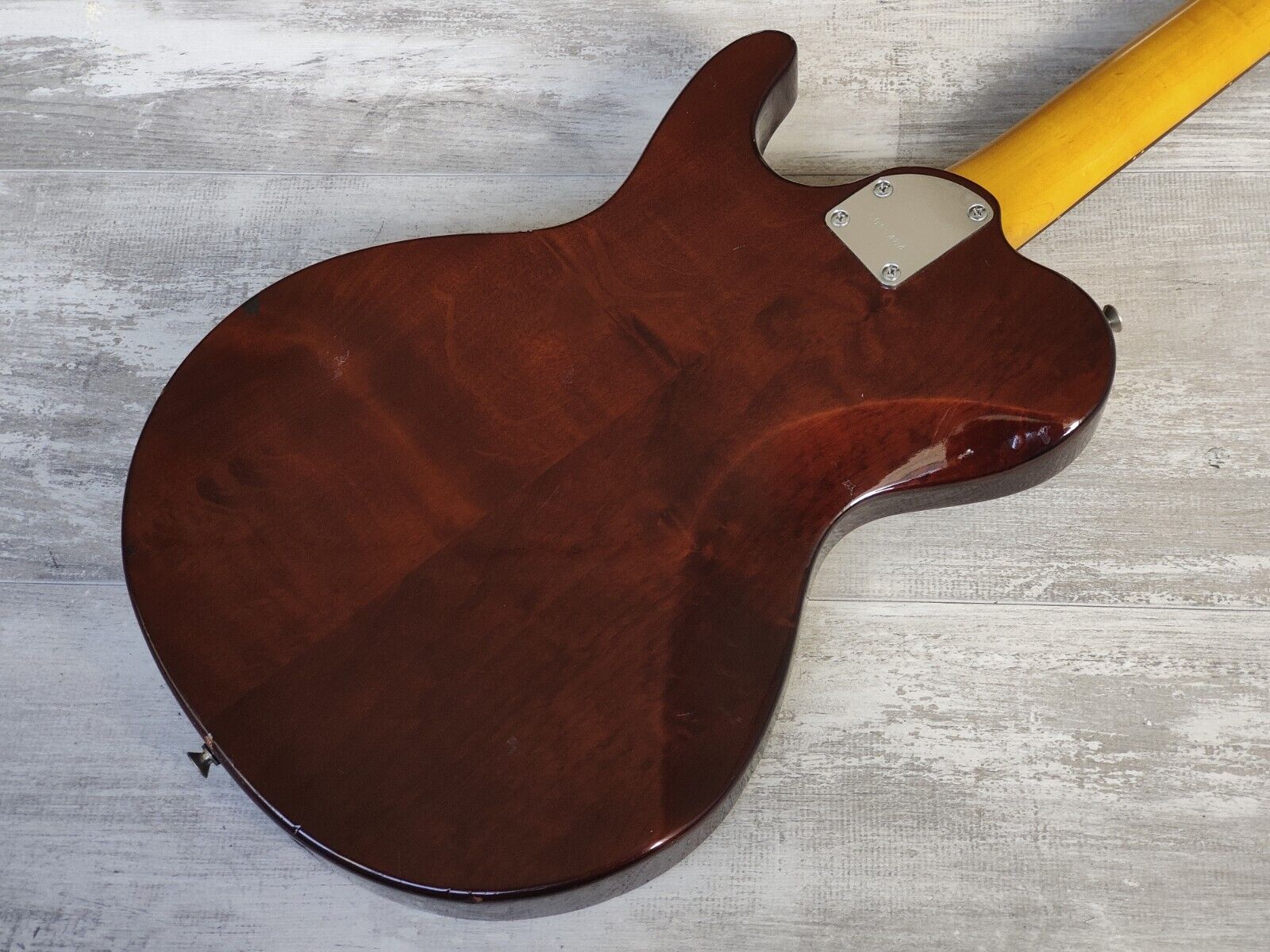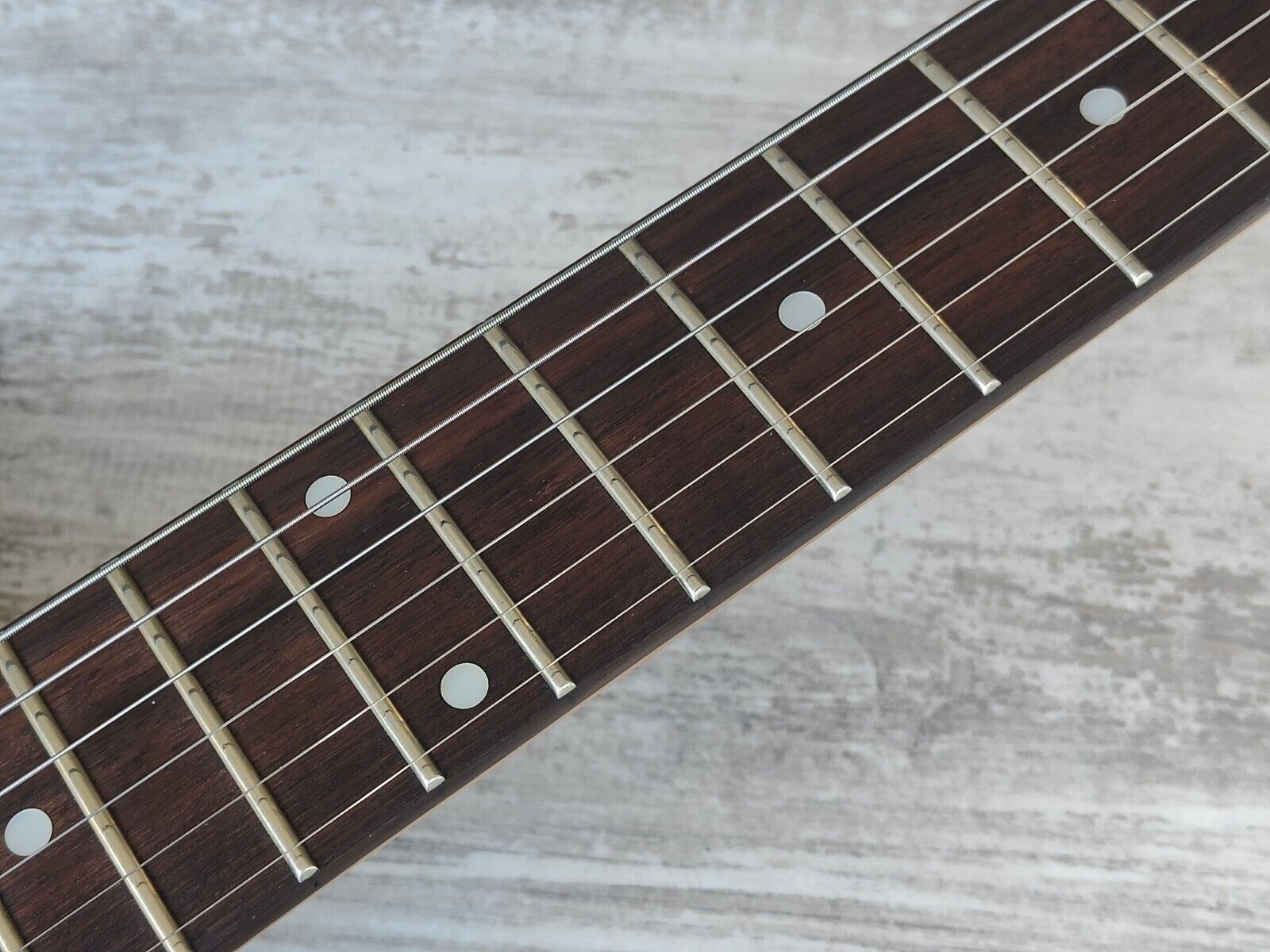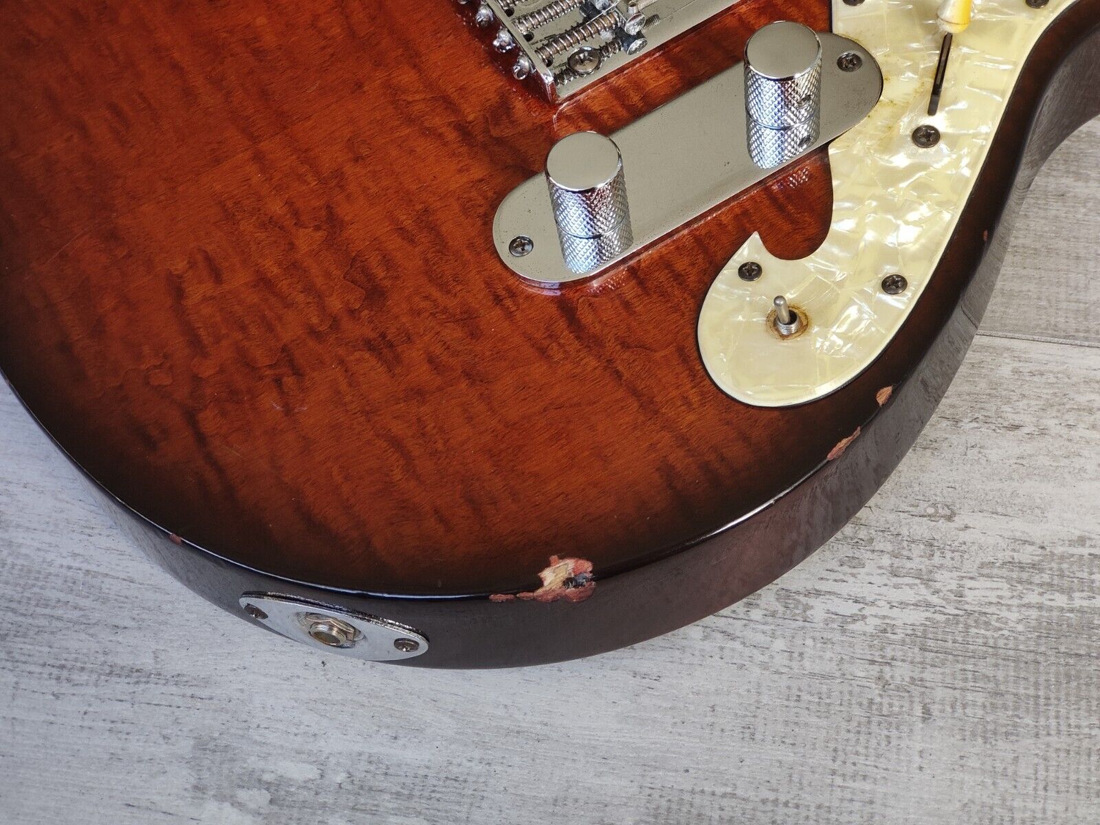 Made by Aria Pro II in the mid 1990's, the 615 model (named after the area code for Nashville) was a unique hybrid that's somewhere between a Nashville telecaster and a Les Paul Special. Looks to be an alder body with a figured top, maple neck with a 22 fret rosewood fingerboard (648mm scale length), it weighs 3.6kg's. Nashville style pickup loadout with a 5-way selector, master volume/tone knobs and a mini toggle to turn the neck pickup on/off.