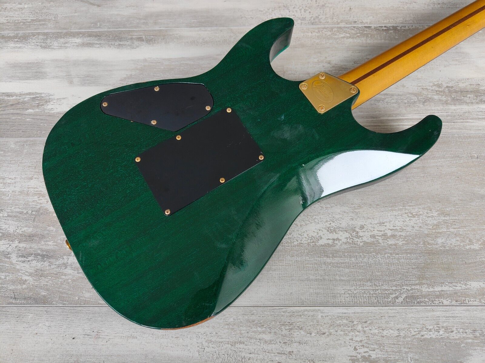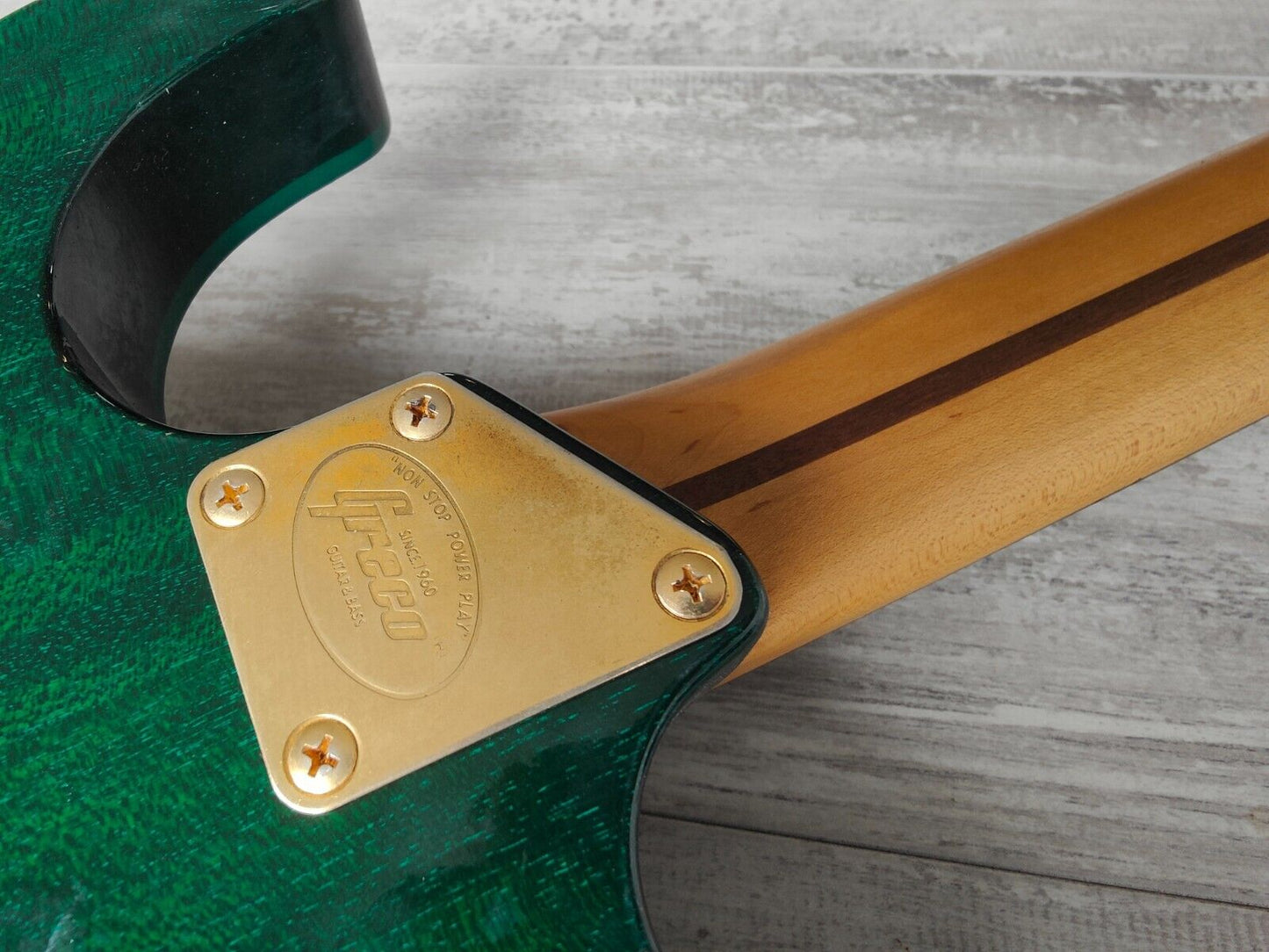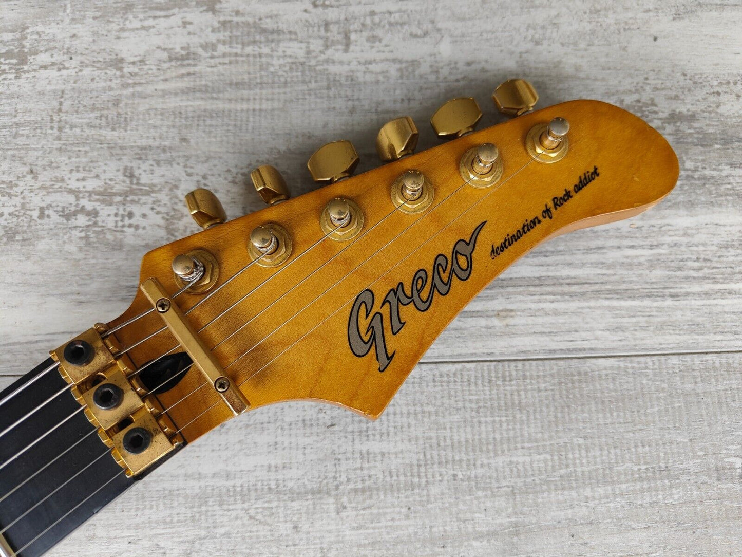 Made by the Fujigen factory around 1996 as part of the Greco "Destinations of a Rock Addict" line of models sold to the Japanese domestic market. Maple top with a mahogany back, slim and fast maple neck with a 22 fret ebony fingerboard, it weighs 3.9kg's. "X-TRA" humbuckers in the neck and bridge positions along with a "Natural Twitter" single coil in the middle position, master volume and tone knobs with a coil split for the humbuckers on a push-pull pot. Genuine Floyd Rose II locking tremolo system along with Japanese tuners and components.