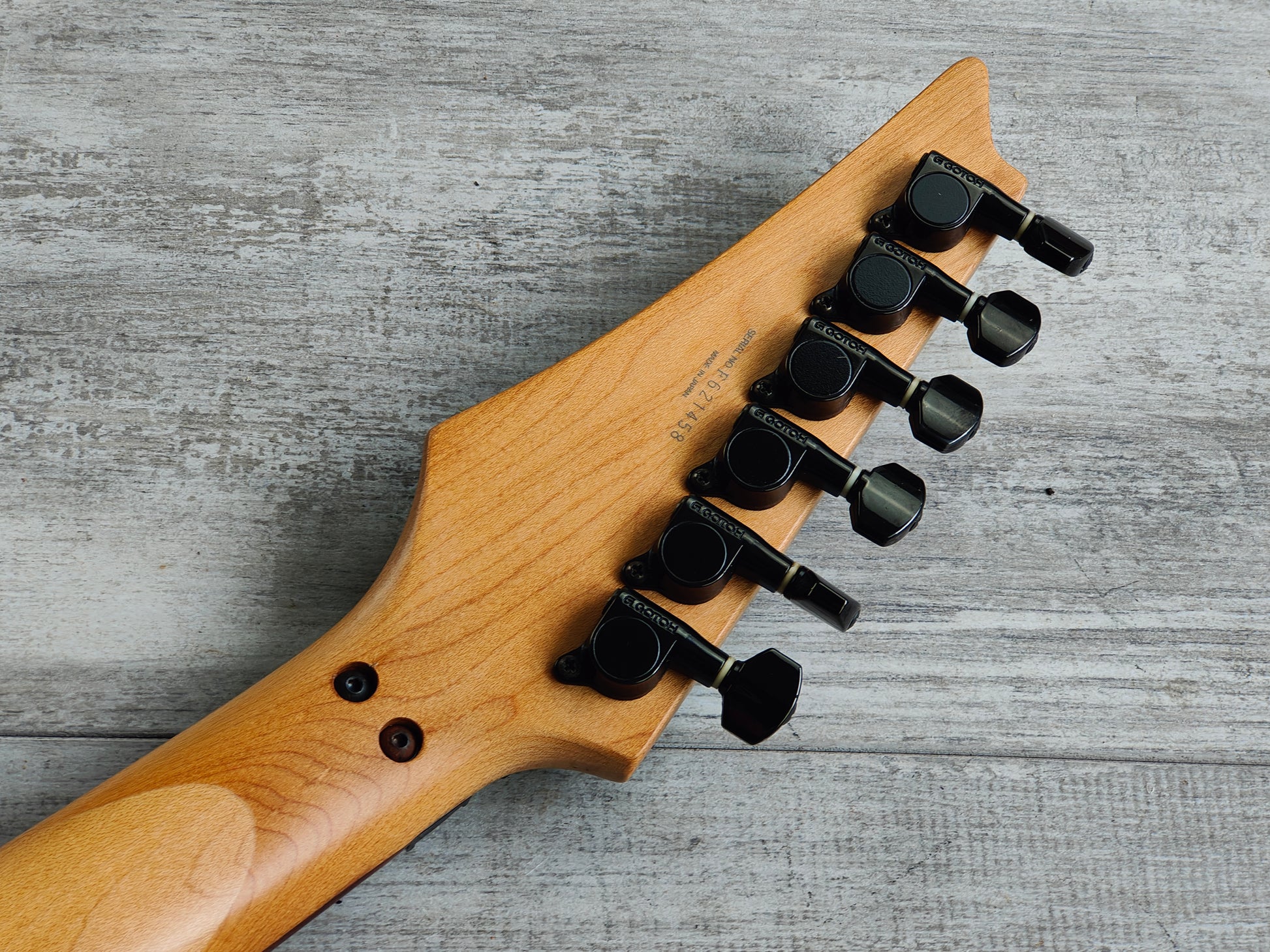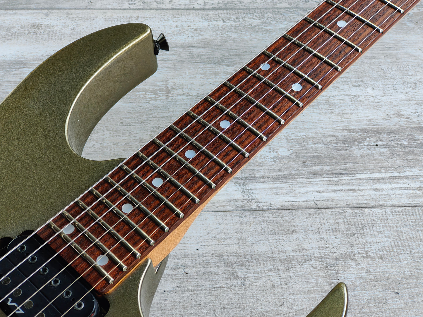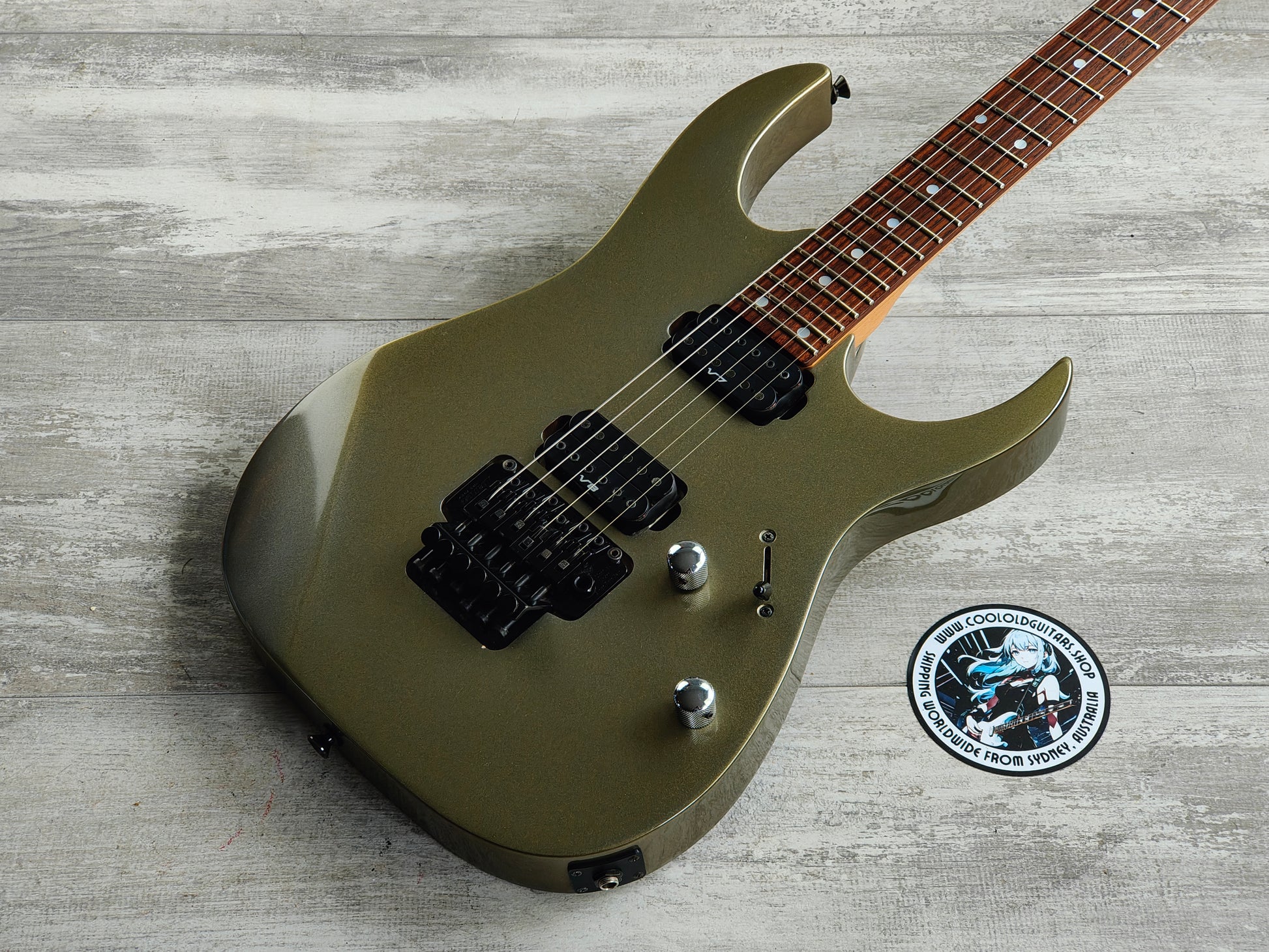 Made in Japan in 1996 (unlike a vast majority of these RG320B's that were made in Korea). The RG320B features a resoncast body with a Pewter finish bolted to a Wizard maple neck with a 24 fret fingerboard (648mm scale length, 43mm nut width), this one weighs 3.6kg's. Loaded with an Ibanez V7/V8 humbucker combination controlled by master volume/tone controls and a three-way selector.