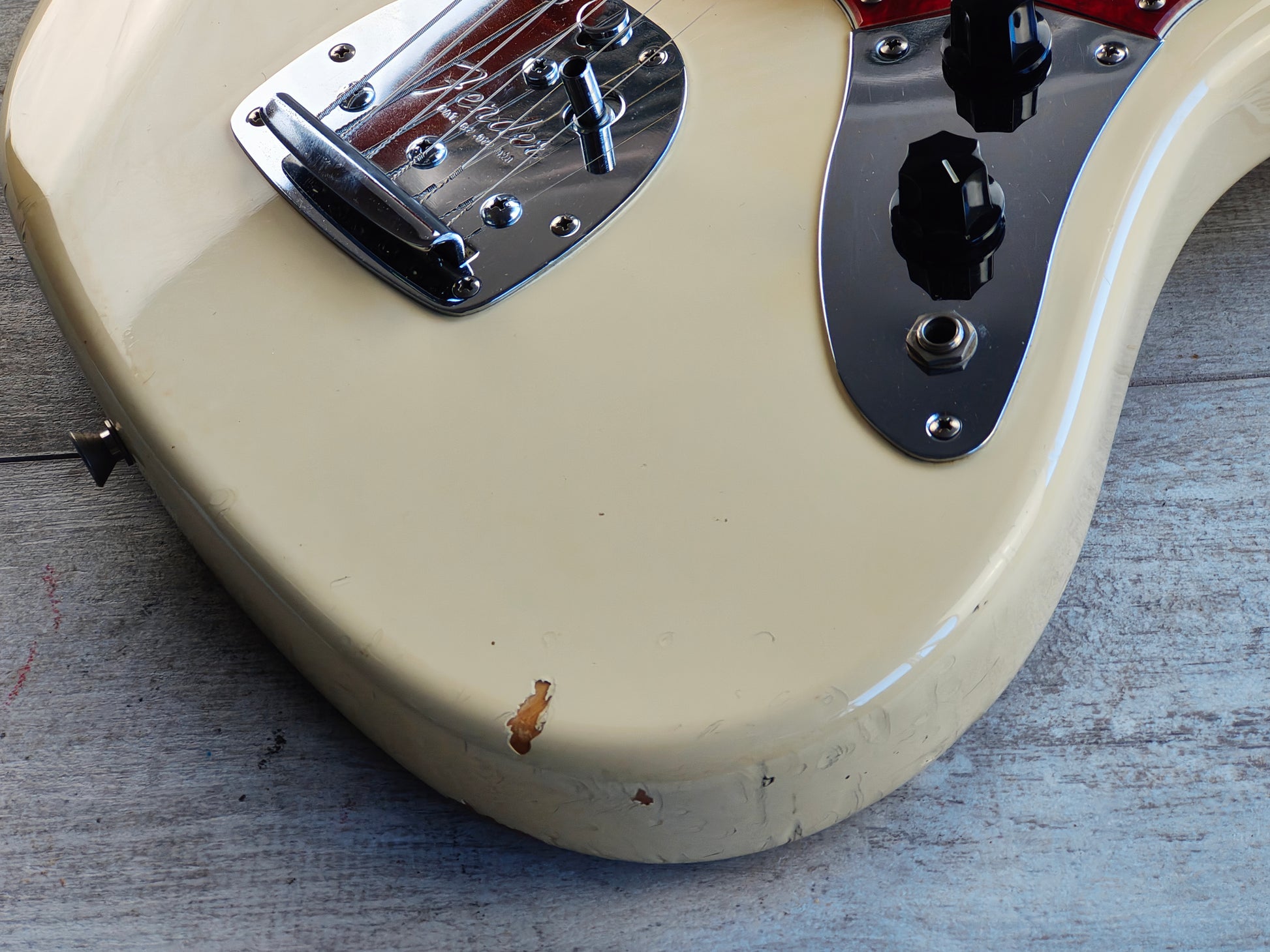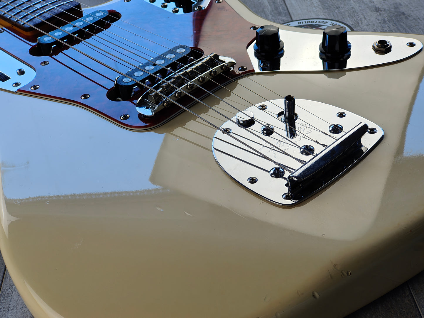 Alder body with a maple neck and 22 fret rosewood fingerboard (7.25" radius, 43mm nut width, 610mm scale length), it weighs 3.7kg's. Loaded with the original vintage-style tuners and classic Jaguar tremolo system, the previous owner swapped the pickups for a set of seldom seen Seymour Duncan Quarter Pound Jaguar pickups that sound perfect.