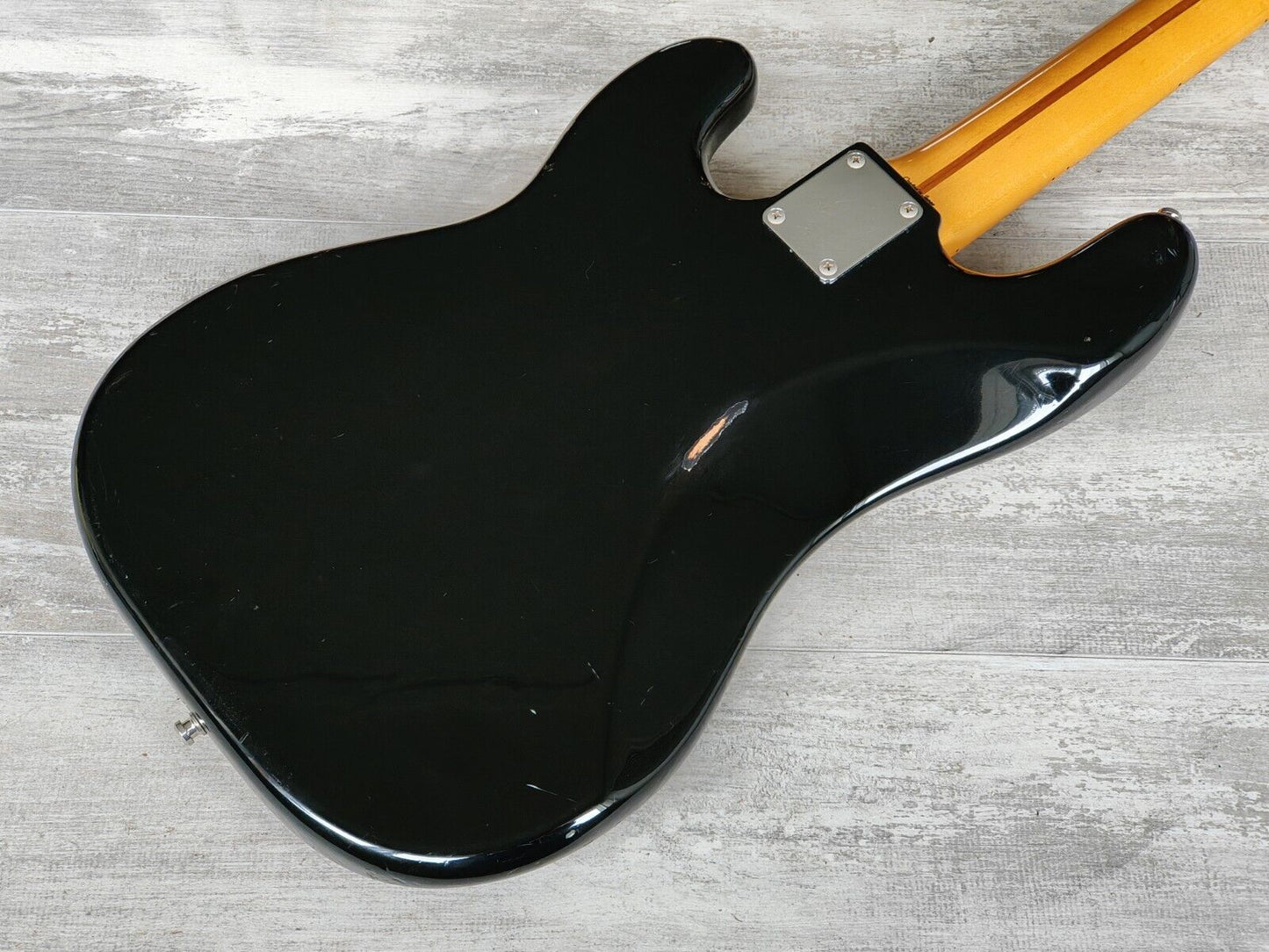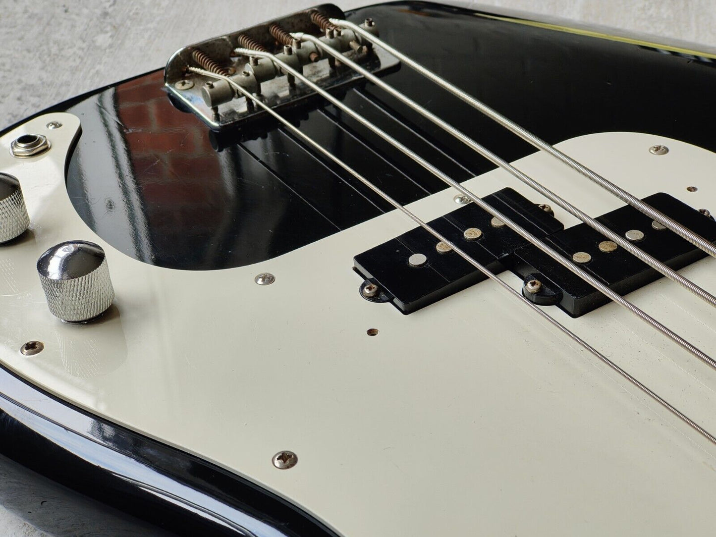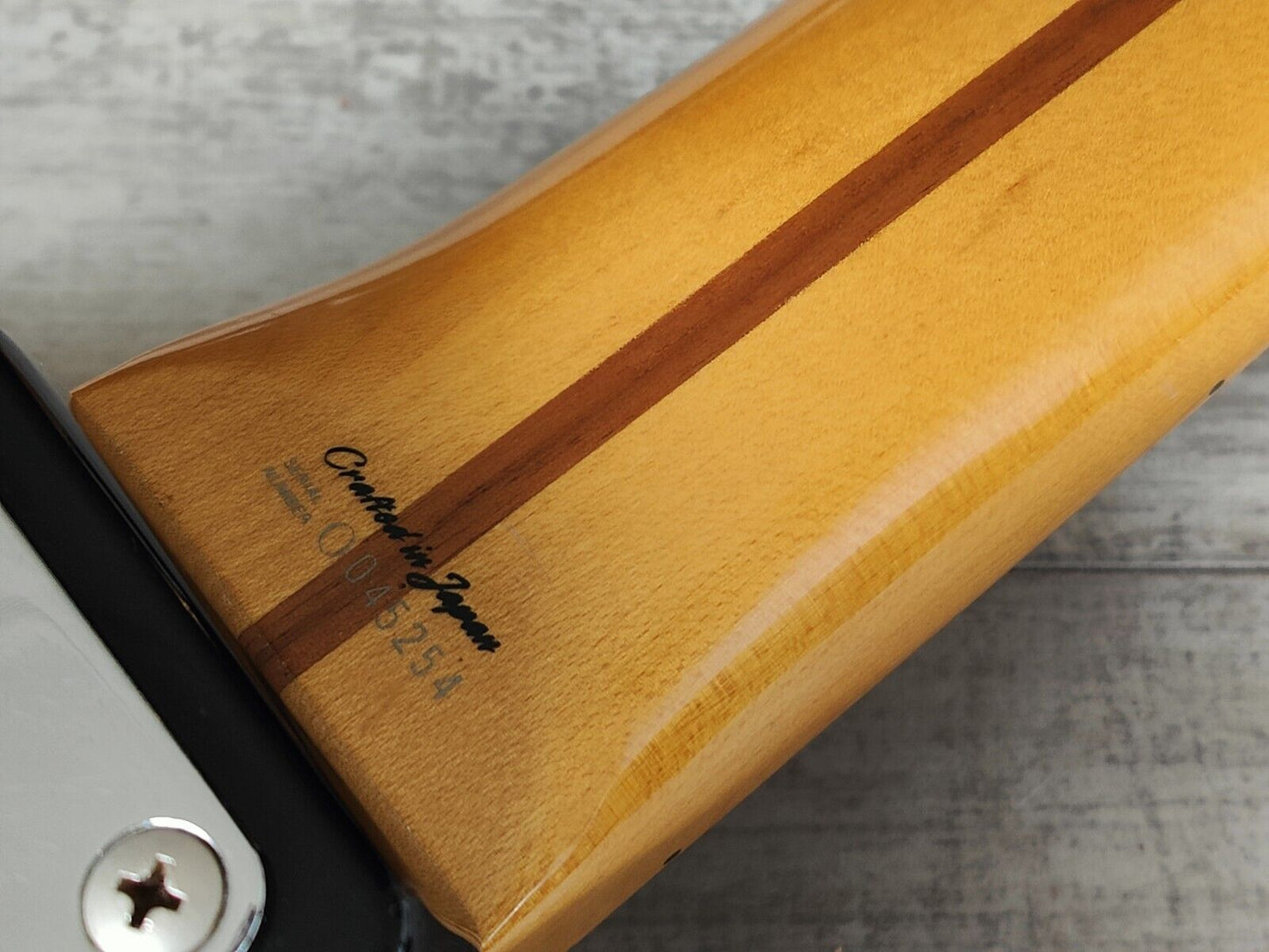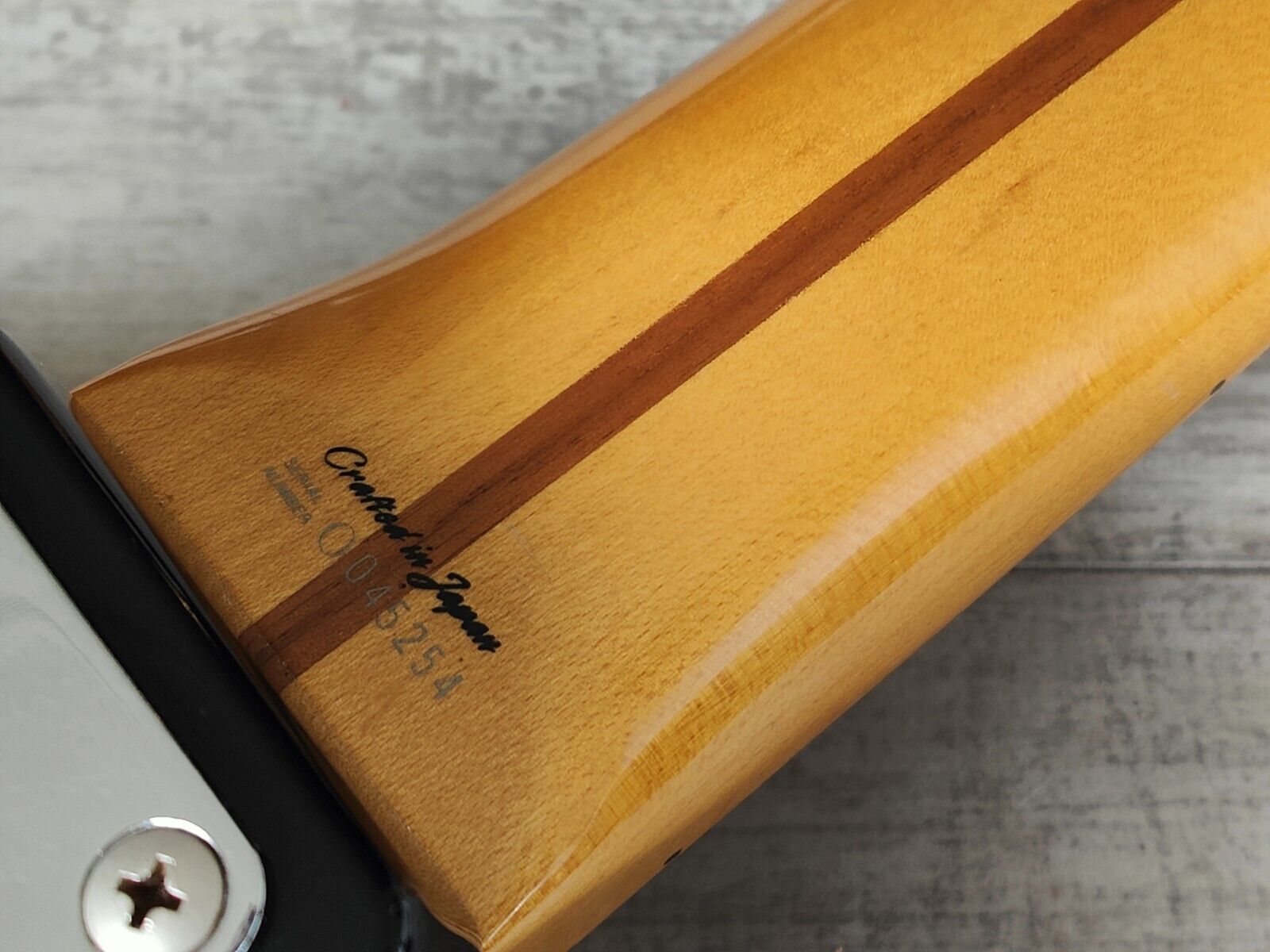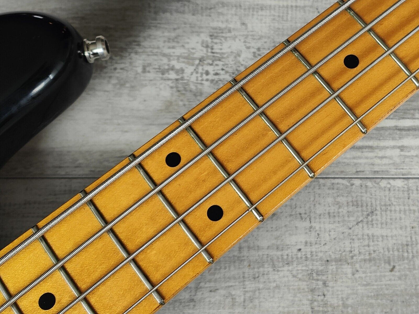 Made by the Tokai factory in Japan for the 1997 catalog, the PB57-53 was Fender Japan's 1957 Precision Bass reissue without the price tag. Basswood body with a gloss black finish, 20 fret maple neck (7.25" radius, 42mm nut width), it weighs just over 4kg's. Seems to be all original except a brand new bone nut that was installed prior to listing, factory loaded with full sized tuners and a Fender Japan P bass pickup controlled by volume and tone knobs.