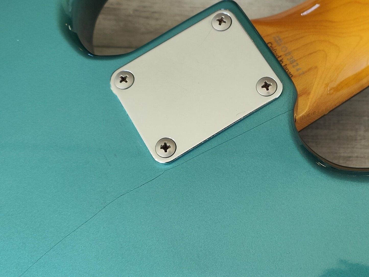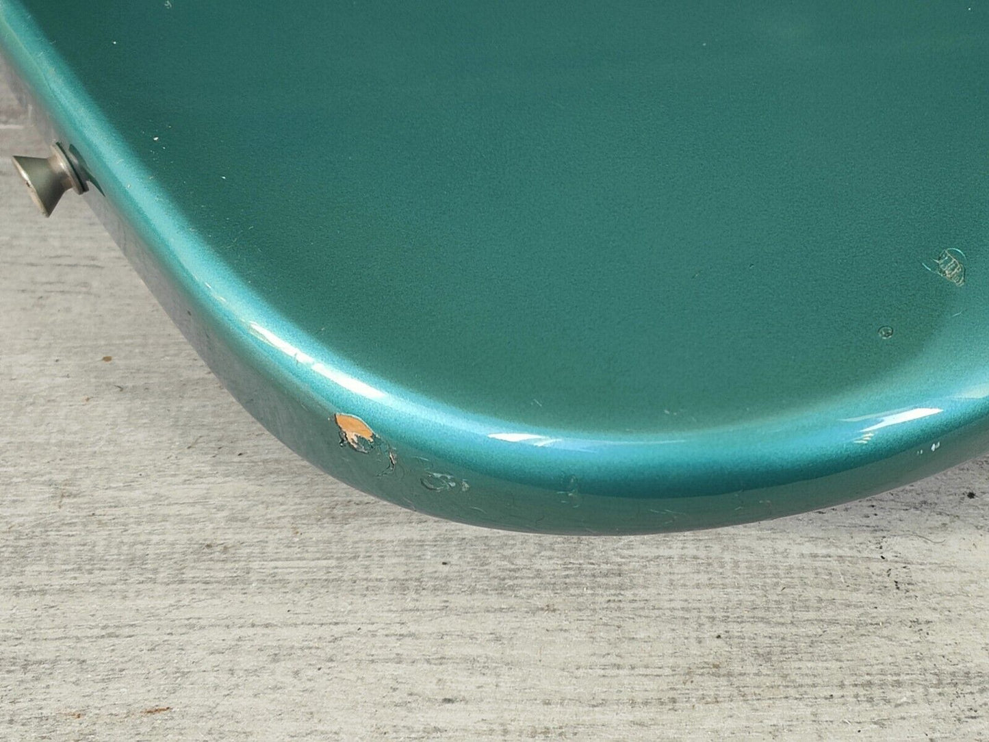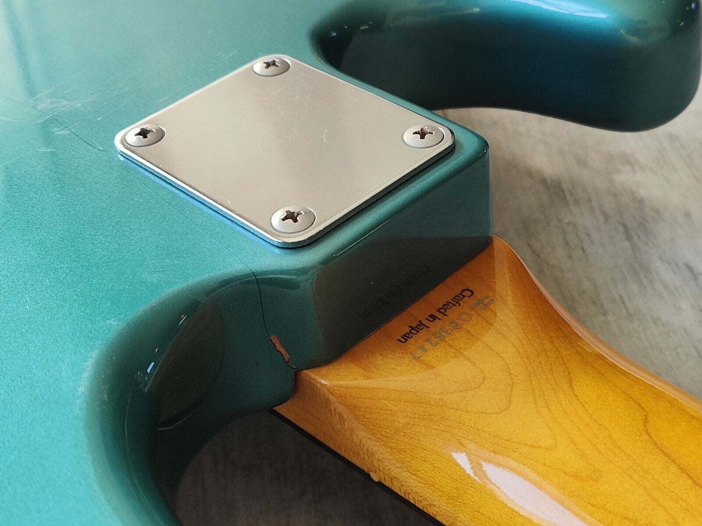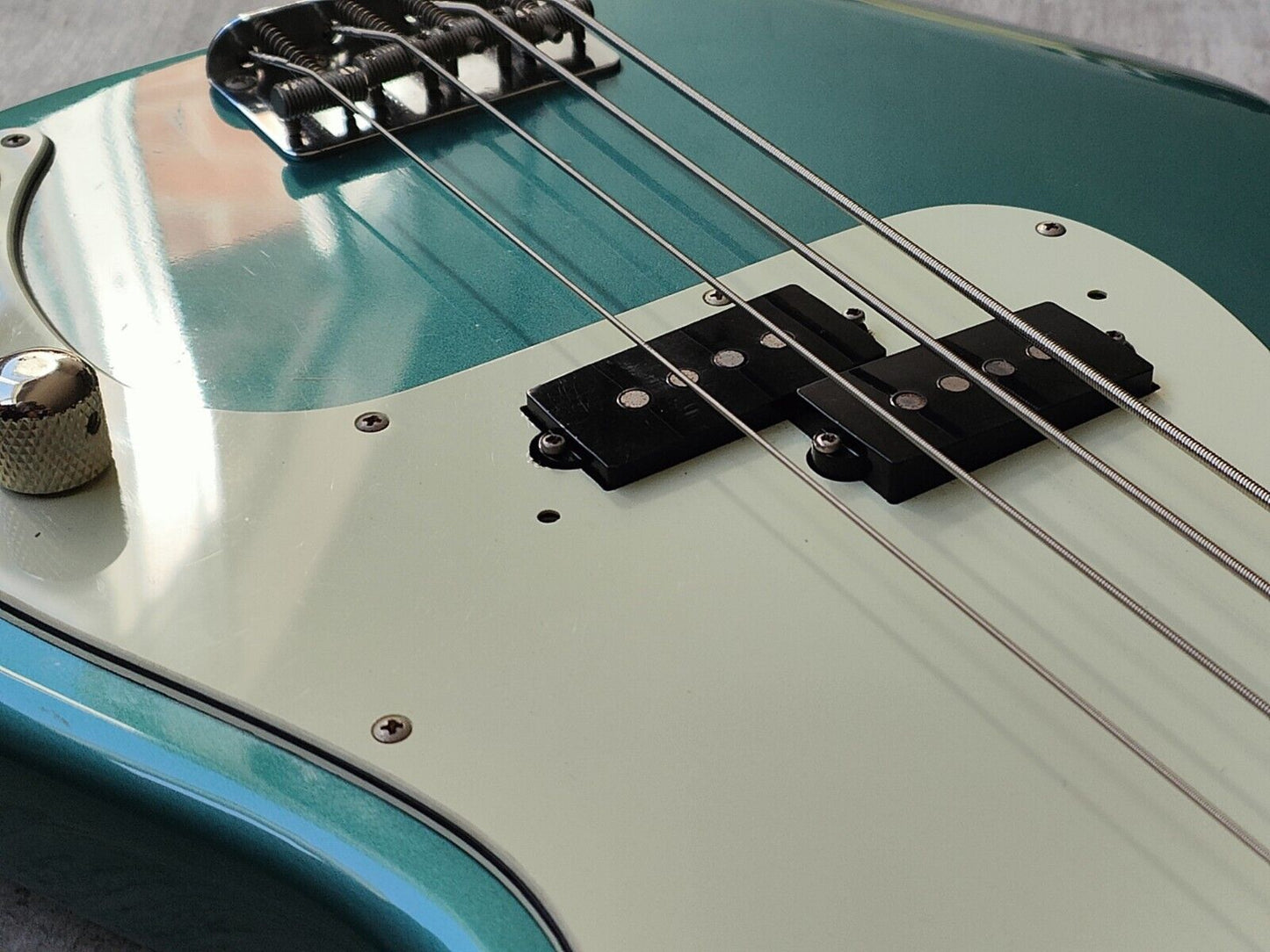 Made by the Tokai factory in 1997, the PB62-53 was Fender Japan's base model '62 reissue Precision Bass. Wearing a non-catalog "Ocean Turqoise Metallic" finish on a basswood body with a maple neck and 20 fret rosewood fingerboard (860mm scale length, 7.25" radius, 43mm nut width), it weighs 4kg's. Loaded with the original Fender Japan PB-VINTAGE pickup, full sized tuners and a vintage bridge with spiral saddles, it seems to be all original.