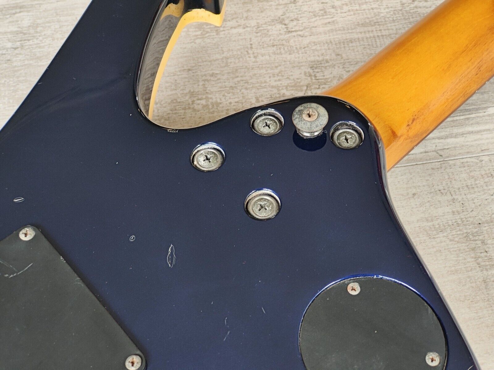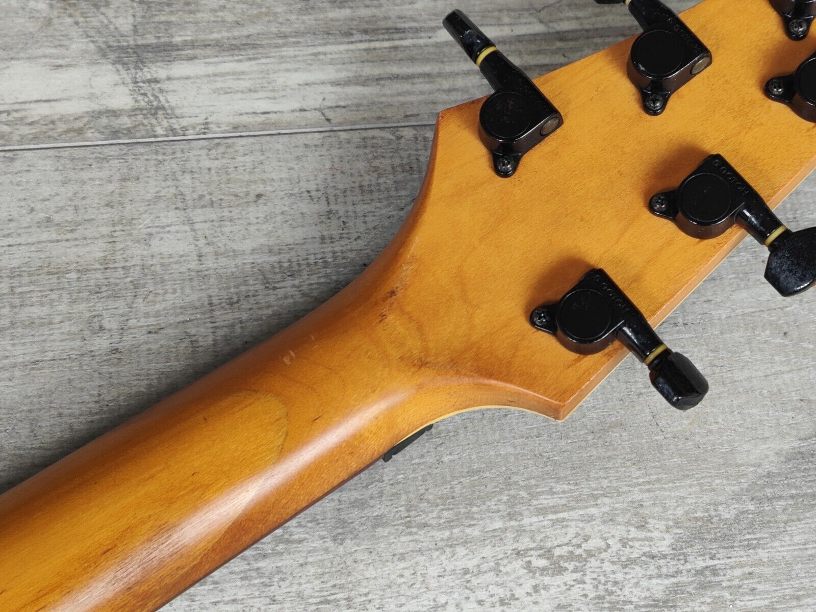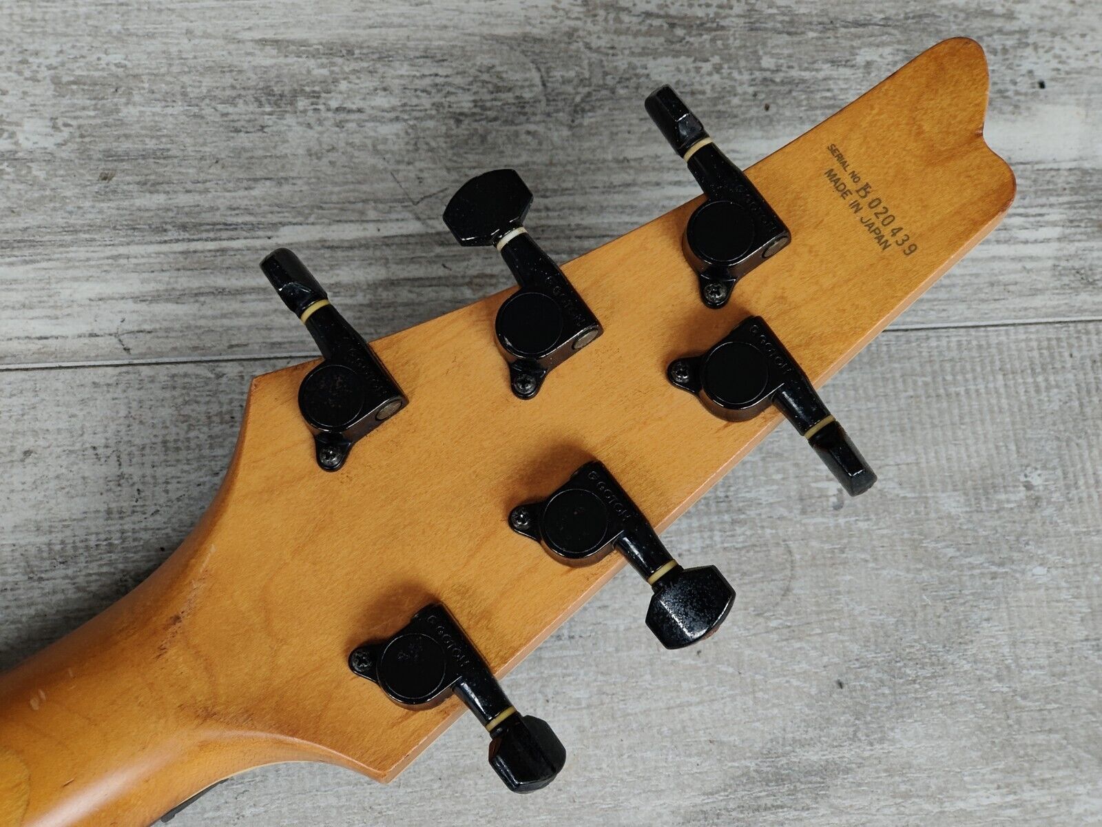 Made in Japan by Greco in 1997, the MS-700 was their modern Mirage series model that shares it's shape with the Ibanez Iceman. Slim basswood body with a smooth maple neck and 22 fret rosewood fingerboard (12" radius, 628mm scale length), it weighs 3.4kg's. Loaded with the original X-TRA humbuckers controlled by a three-way switch, independent volume controls and a master tone knob. The MS-700 was also factory loaded with a locking tremolo system that has been replaced on this one with a Takeuchi TRS-202 system.