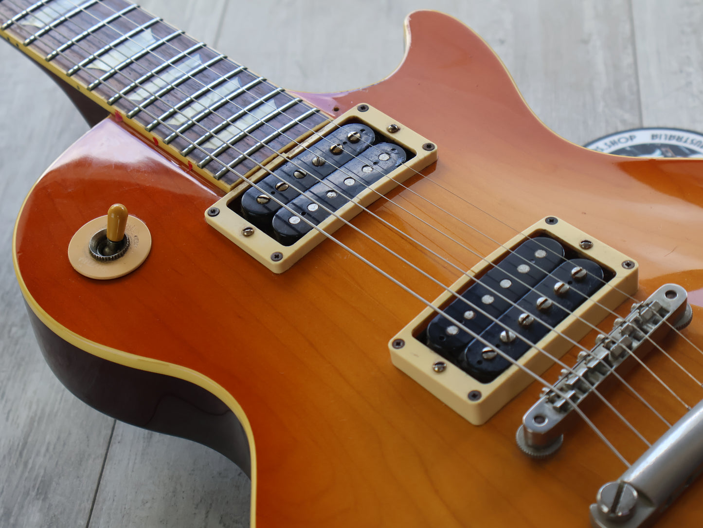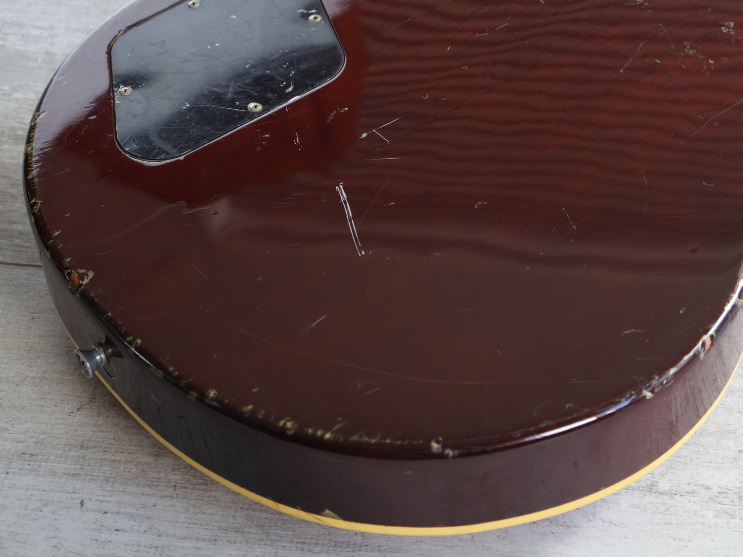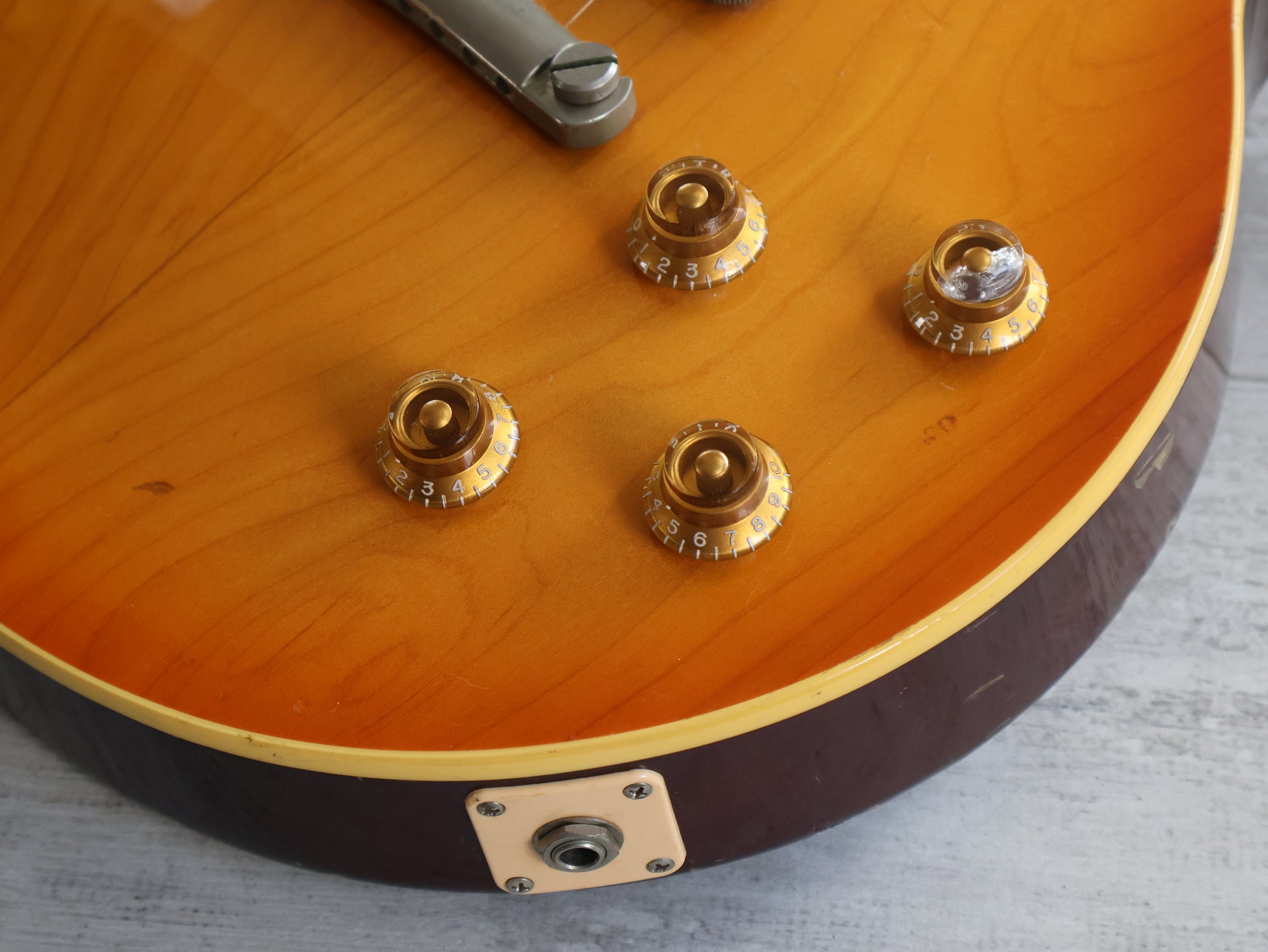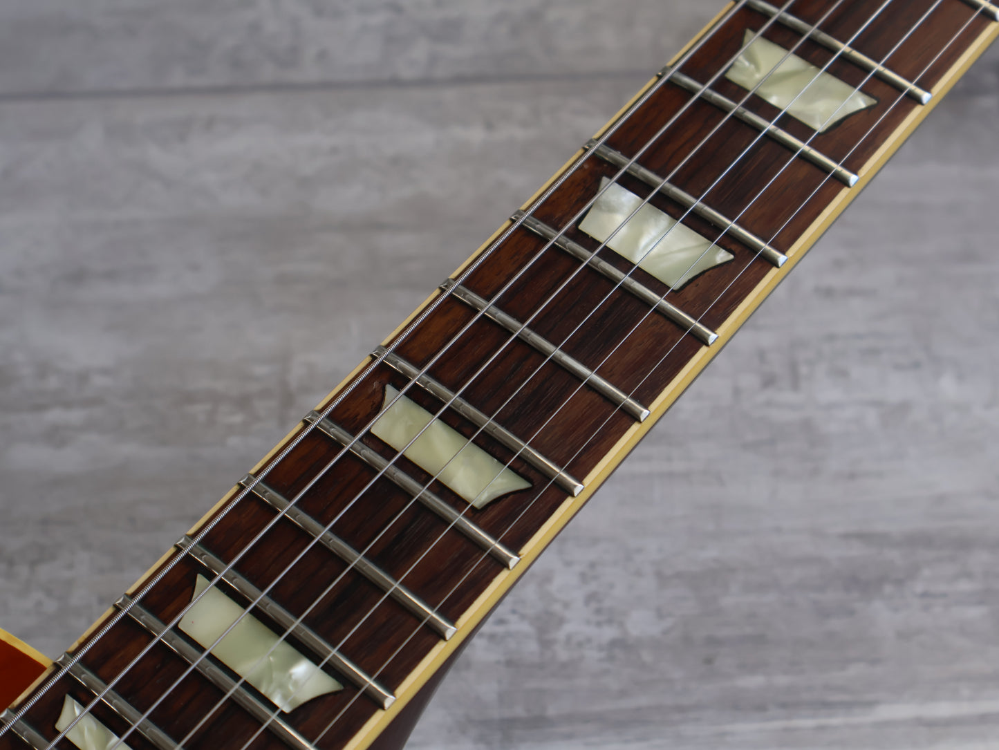 Built with a carved maple top and mahogany body, slim 60's mahogany neck, 22 fret rosewood fingerboard, it weighs 4.3kg's. This one is loaded with a pair of PAF stickered humbuckers along with the original wiring and Japanese hardware.