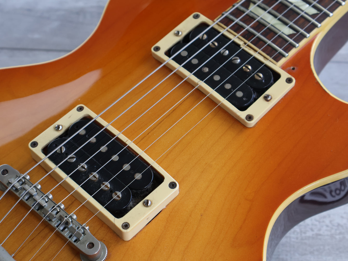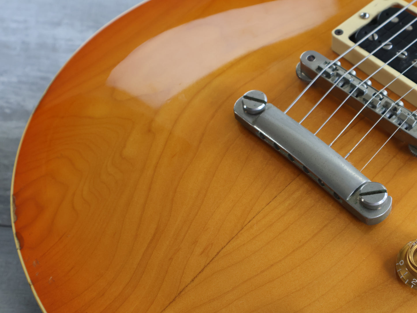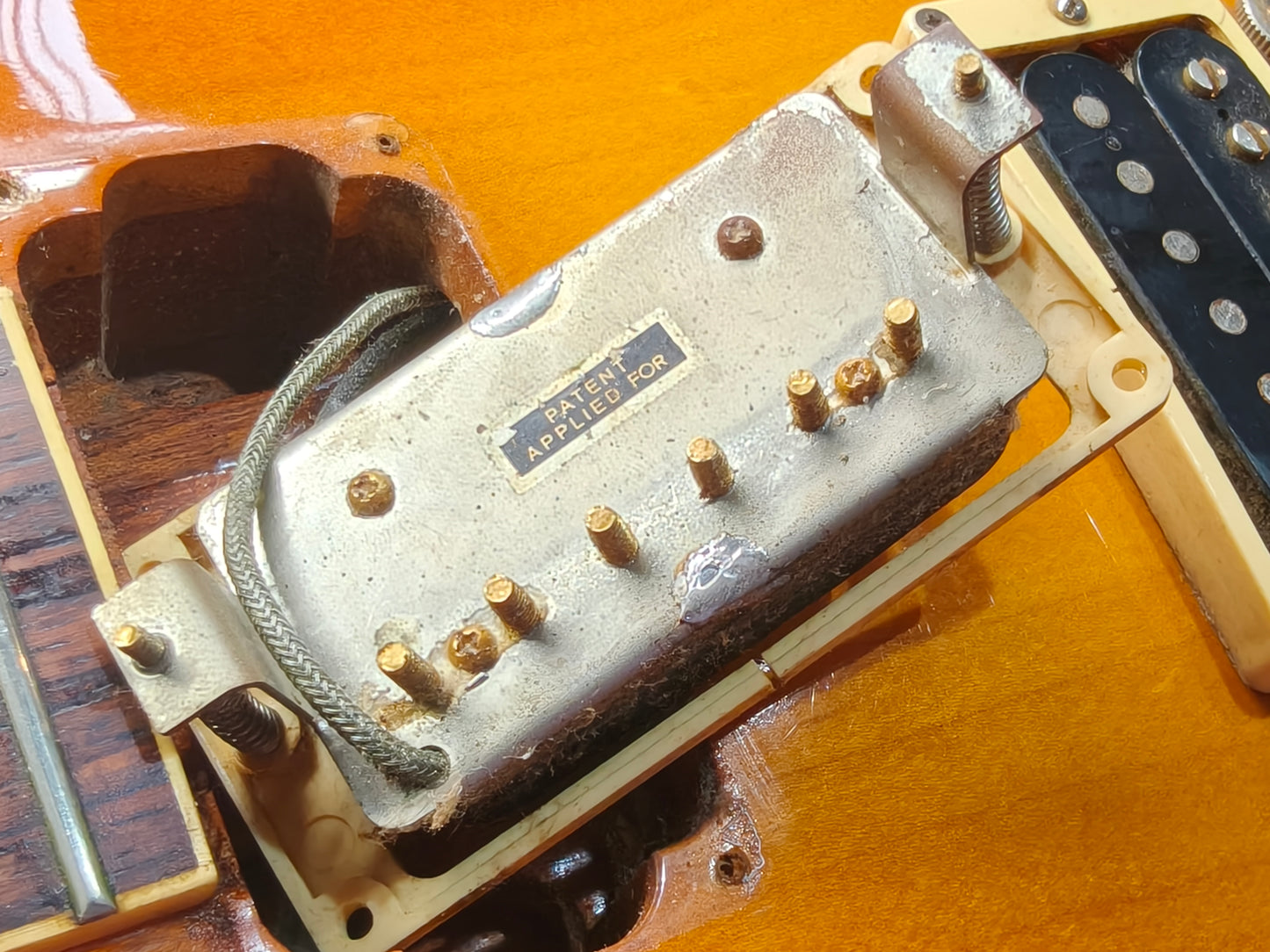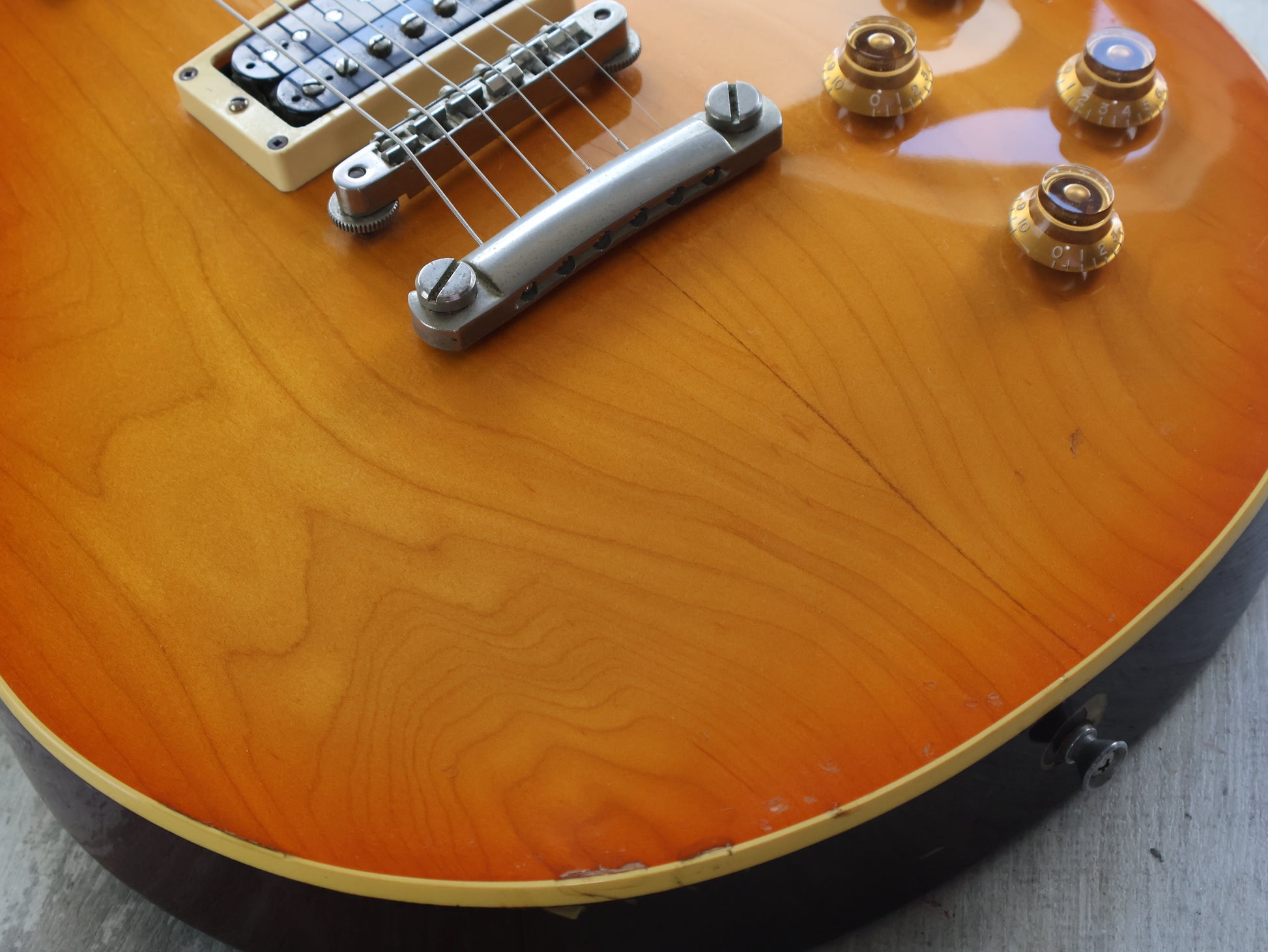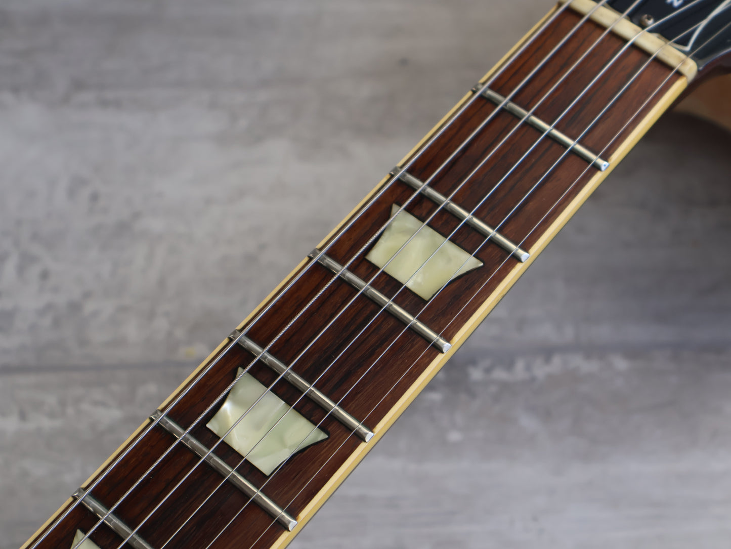 Built with a carved maple top and mahogany body, slim 60's mahogany neck, 22 fret rosewood fingerboard, it weighs 4.3kg's. This one is loaded with a pair of PAF stickered humbuckers along with the original wiring and Japanese hardware.