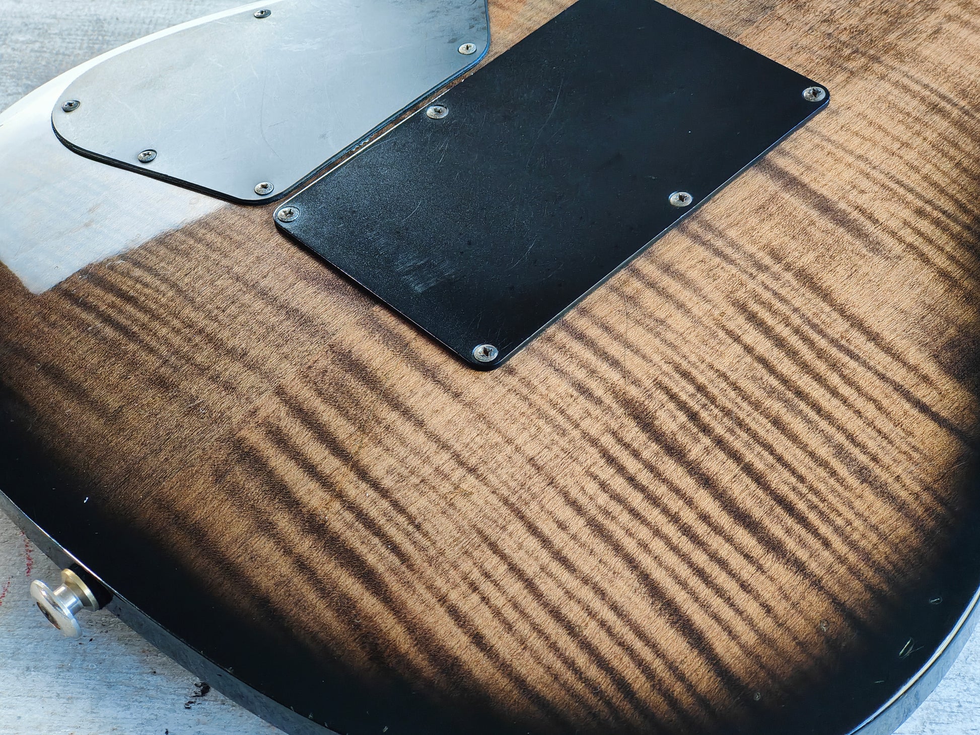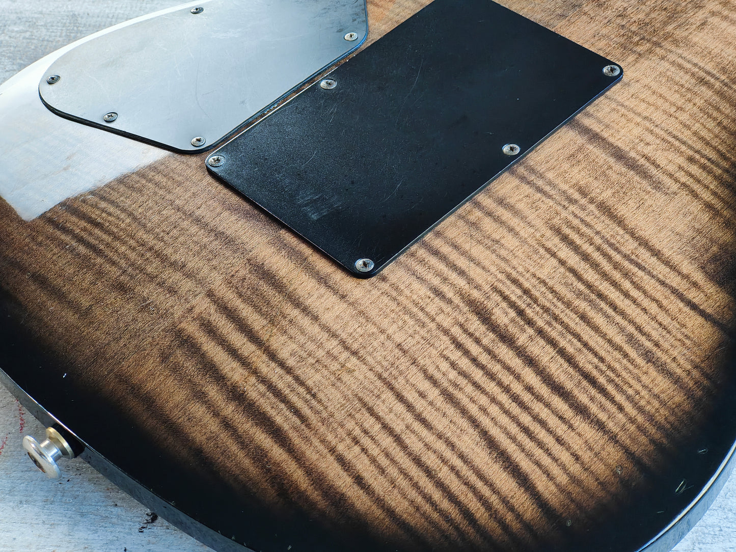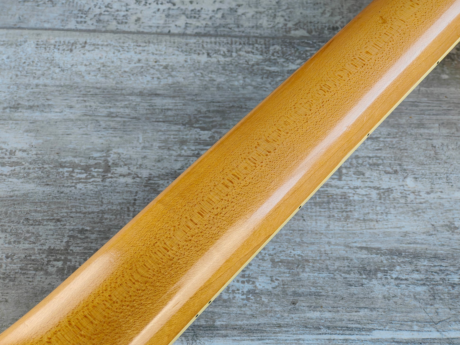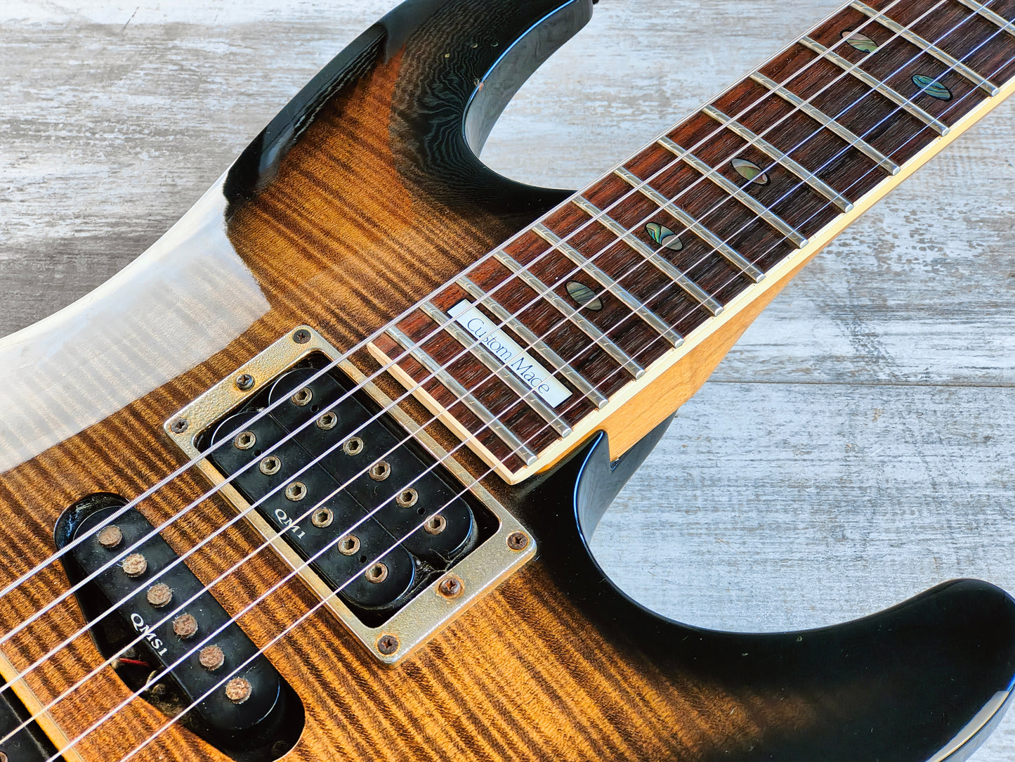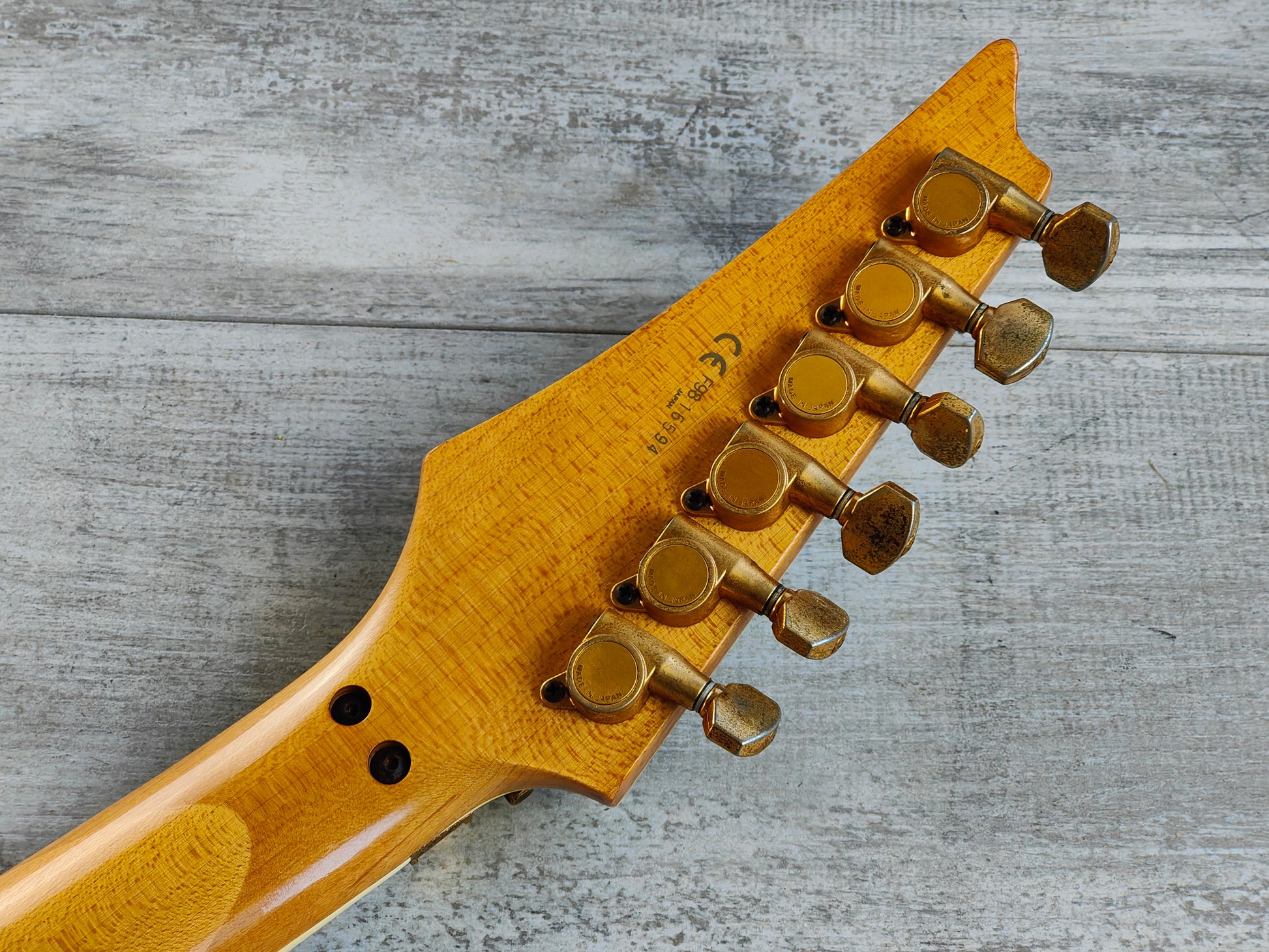 Flamed maple top and back on a mahogany body bolted to a maple neck with a 22-fret rosewood fingerboard (jumbo frets, 648mm scale length, Super Wizard profile), it weighs a super nimble 3.3kg's. Loaded with a Lo-Pro Edge double locking tremolo with a locking nut, Ibanez Quantum HSH and Gotoh tuners.