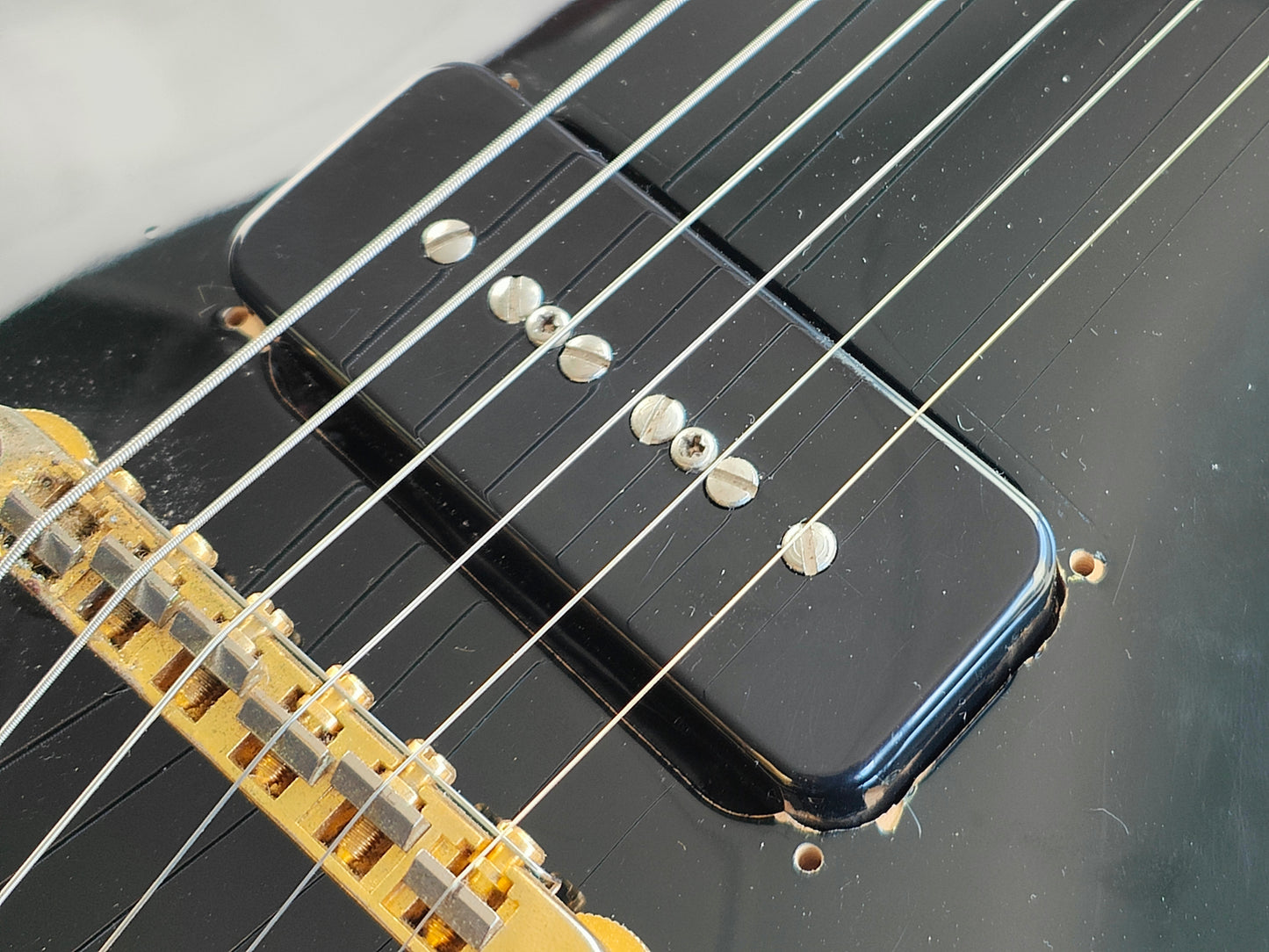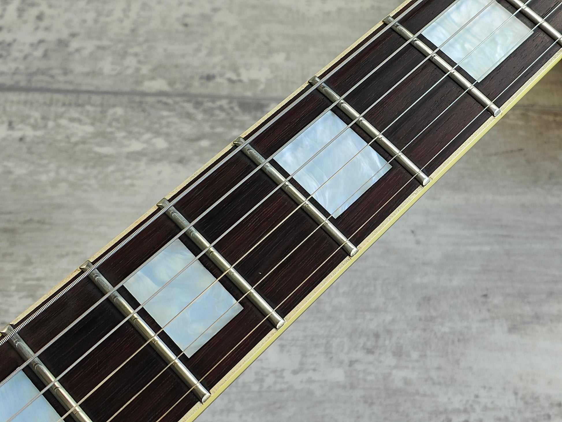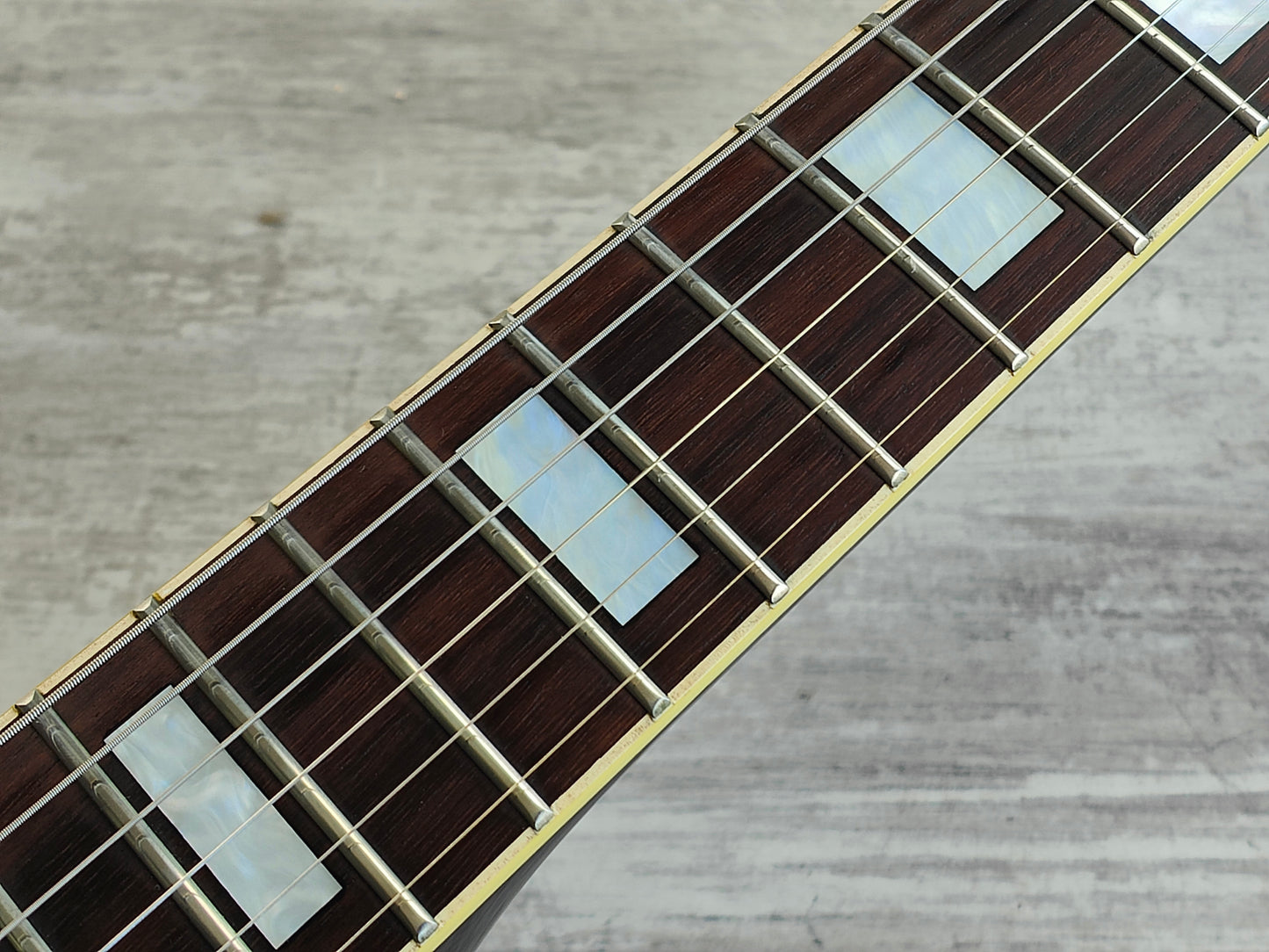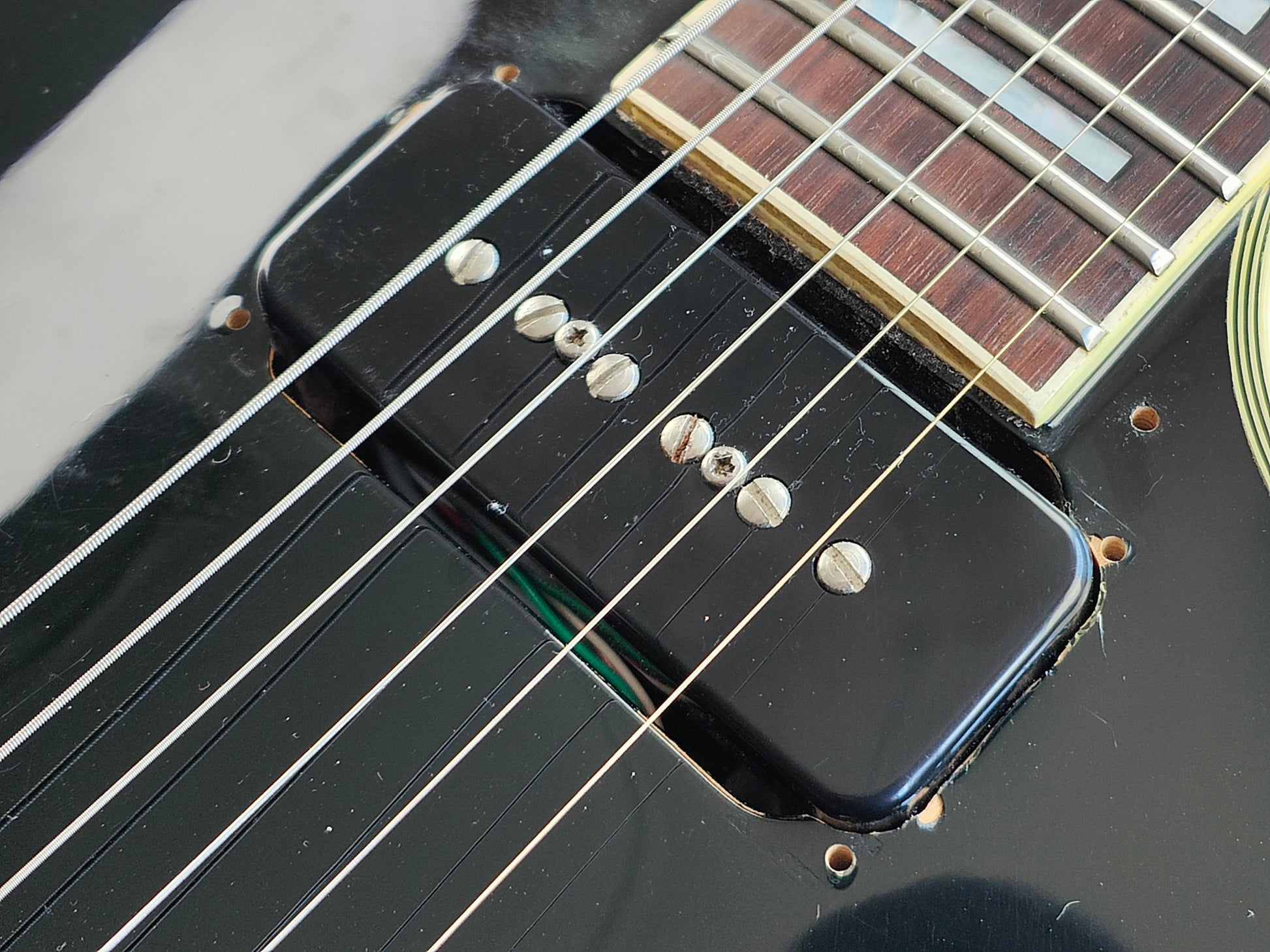 Mahogany body with a maple top, slim 60's mahogany neck and bound rosewood fingerboard, it weighs 4.2kg's. Loaded with Japanese humbuckers and electronics along with Japanese hardware and Gotoh style tuners, this one seems to be all original as pictured with the exception a pair of Seymour Duncan P90's installed (easily converted back to humbuckers though).