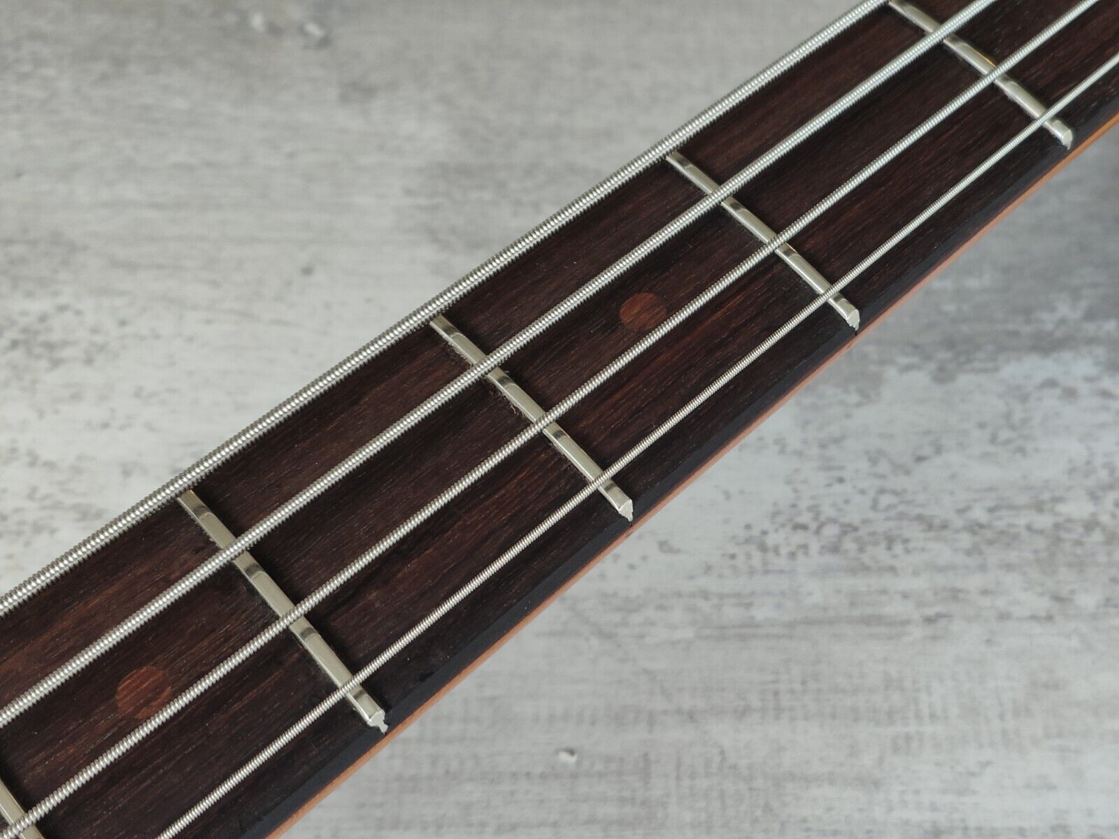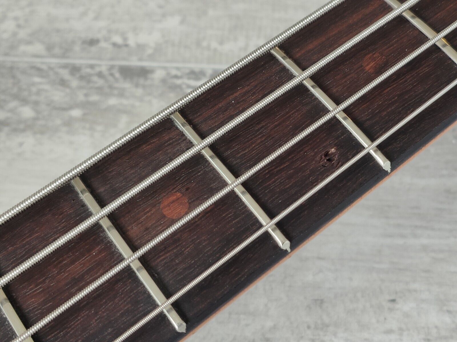 This one's in reasonable used condition but is a clean overall bass. It's been refretted at some point and it's also had the inlays replaced with rosewood plugs as pictured. Restrung and given a basic service prior to listing including a truss adjustment.